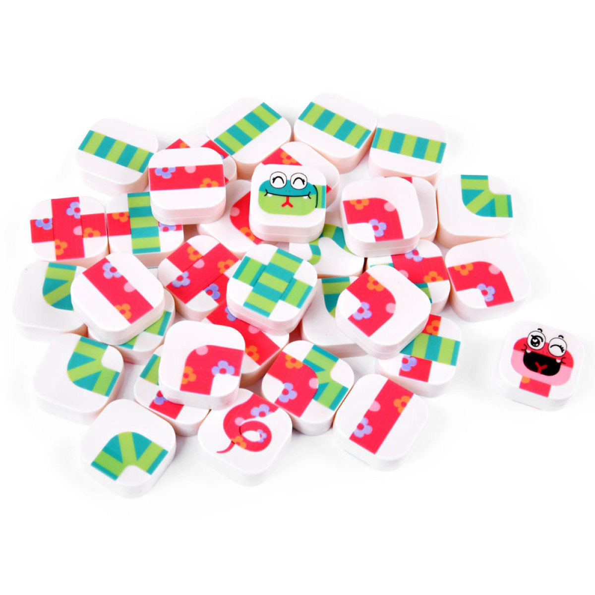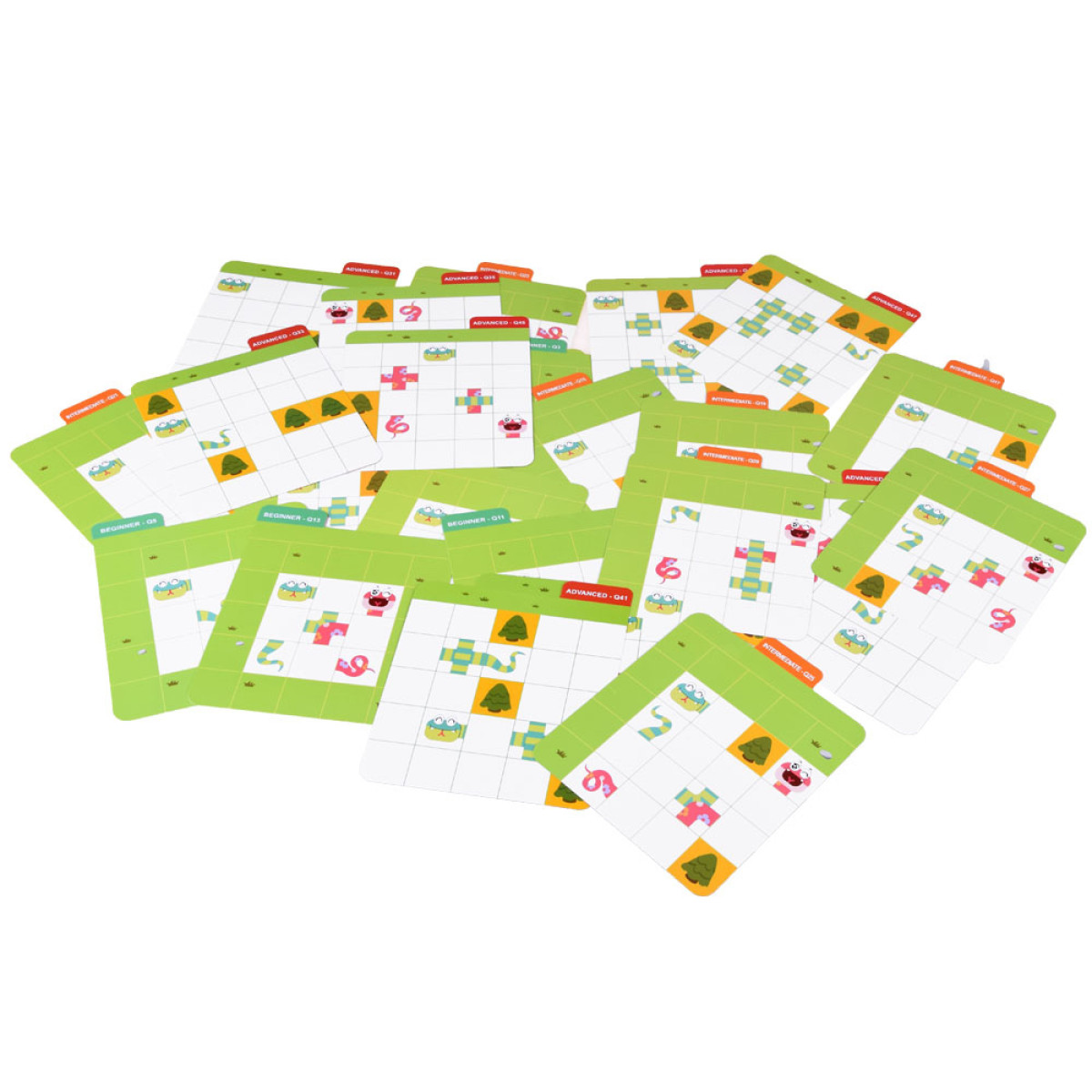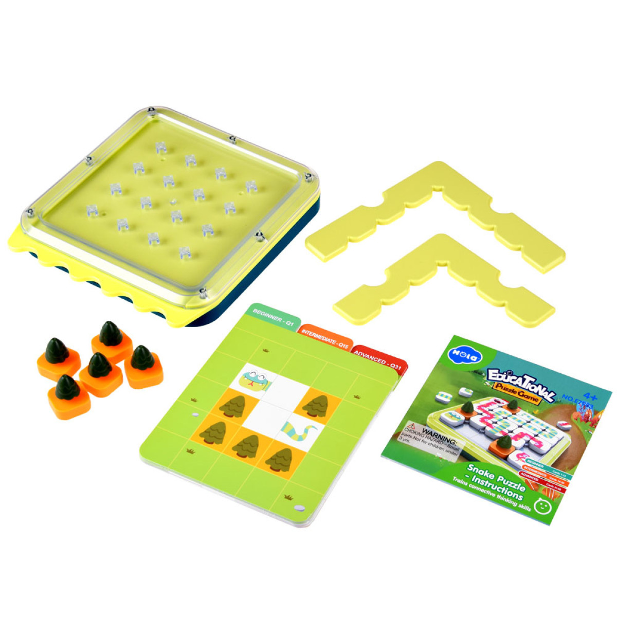 Pradžioje pasirinkite užduočių kortelę. Galite rinktis iš trijų sunkumo lygių: lengvas (žalias), vidutinis (oranžinis) ir sunkus (raudonas). Pasirinkta kortelė dedama prieš plokštę, ir tada reikia atkartoti kortelės išdėstymą ant plokštės. Lengvame ir vidutiniame lygyje žaidimo lauką sumažiname naudodami ribotuvus. Taip pat išdėstome medelius, gyvatės galvą ir uodegą, o sunkiausiame lygyje - papildomus gyvatės elementus, kuriuos reikės sujungti. Mūsų tikslas yra sujungti gyvatės galvą ir uodegą į vieną visumą. Galime pasirinkti kauliukus su tiesiais segmentais, posūkiais ar besikertančiais gyvatės segmentais. Kauliukai yra dvipusiai su žalia ir rožine gyvate. Žaidžiant negalima perkelti ar pašalinti jokių elementų, nurodytų kortelėje. Negalima maišyti spalvų - gyvatė turi būti visiškai žalia arba rožinė. Svarbu! Užduotis laikoma teisingai išspręsta, kai sujungiate gyvatę į vieną visumą ir visi laukai yra užimti kauliukais ar medžiais. Atsakymų knygelėje, puslapiuose 8-32, yra užduočių sprendimai. Dvi paskutinės puslapiai yra tuščios, todėl galite sugalvoti savo užduotis ir užsirašyti jas kartu su sprendimais.