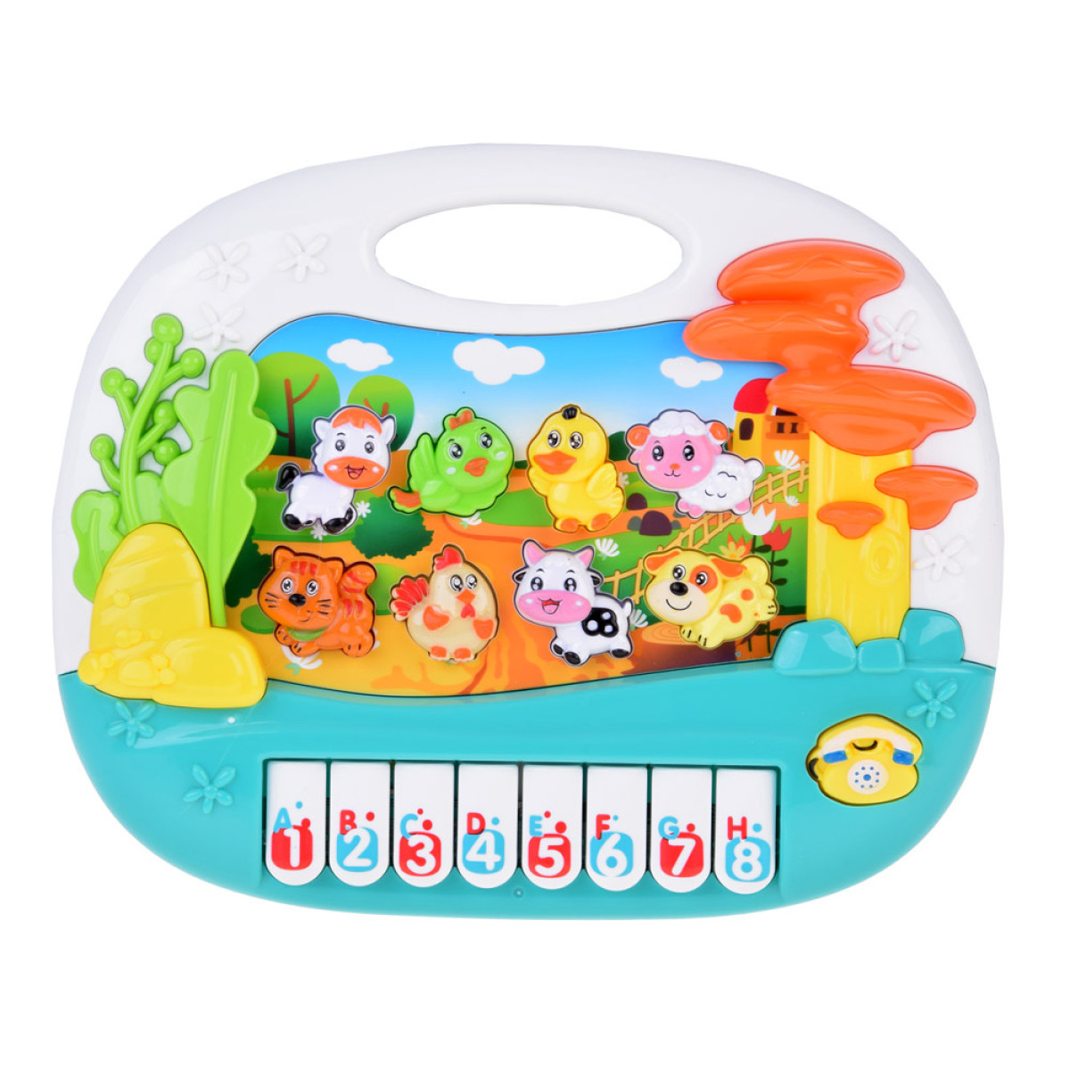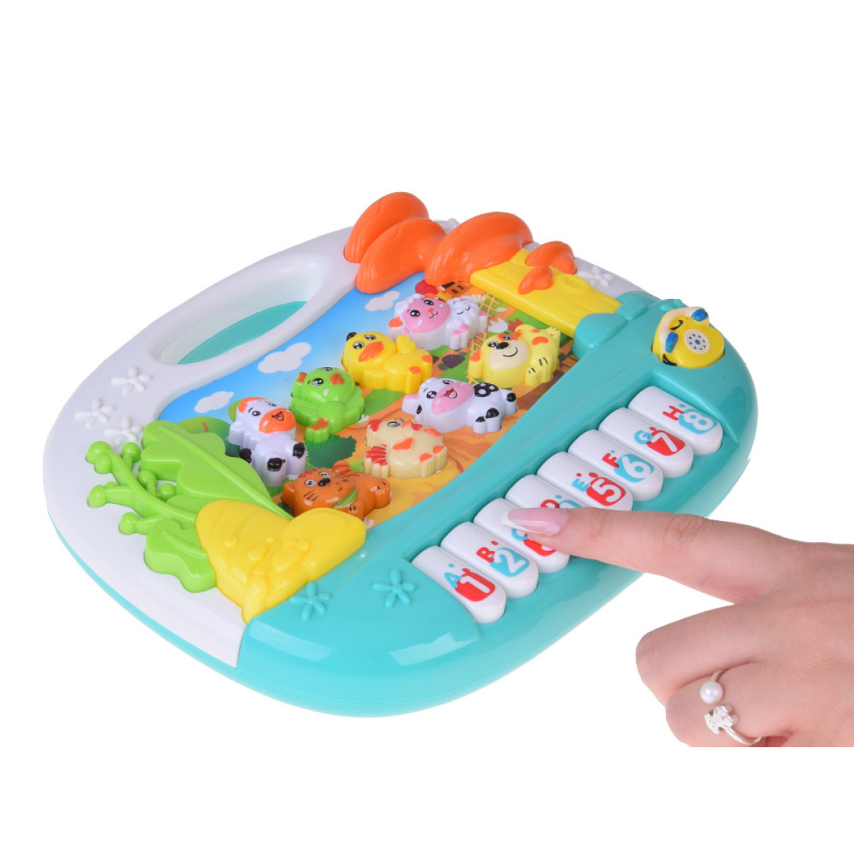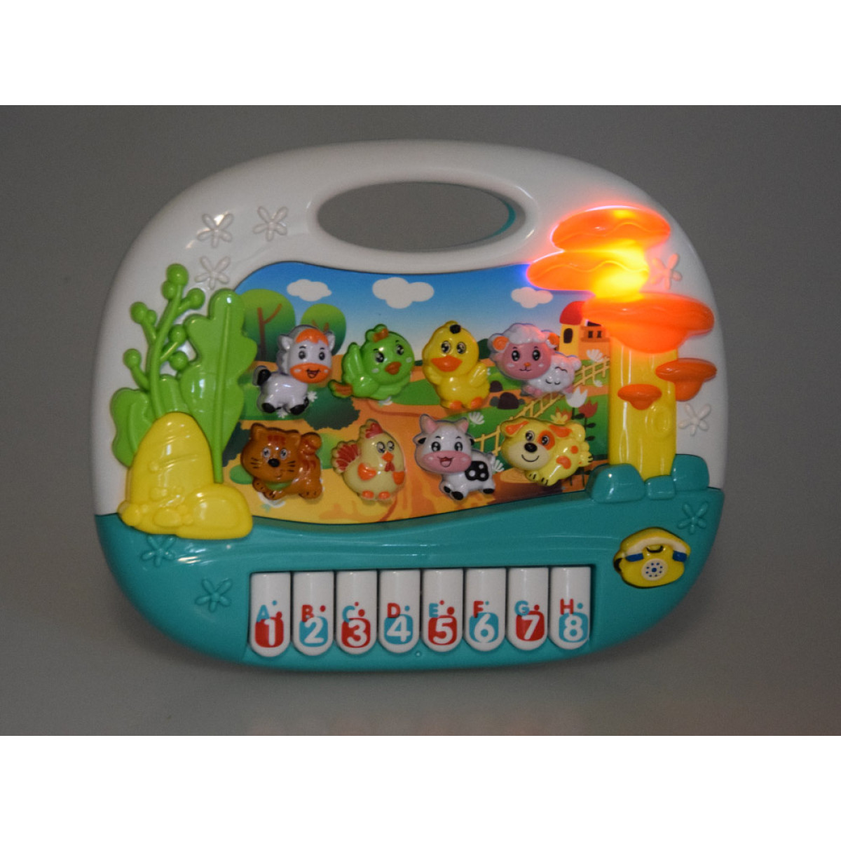 - Įrengtas 8 klavišais su skaičiais ir raidėmis bei 8 mygtukais su gyvūnėliais ir telefonu, užtikrina vaikui valandų edukacinio žaidimo, skatindamas jo vystymąsi.