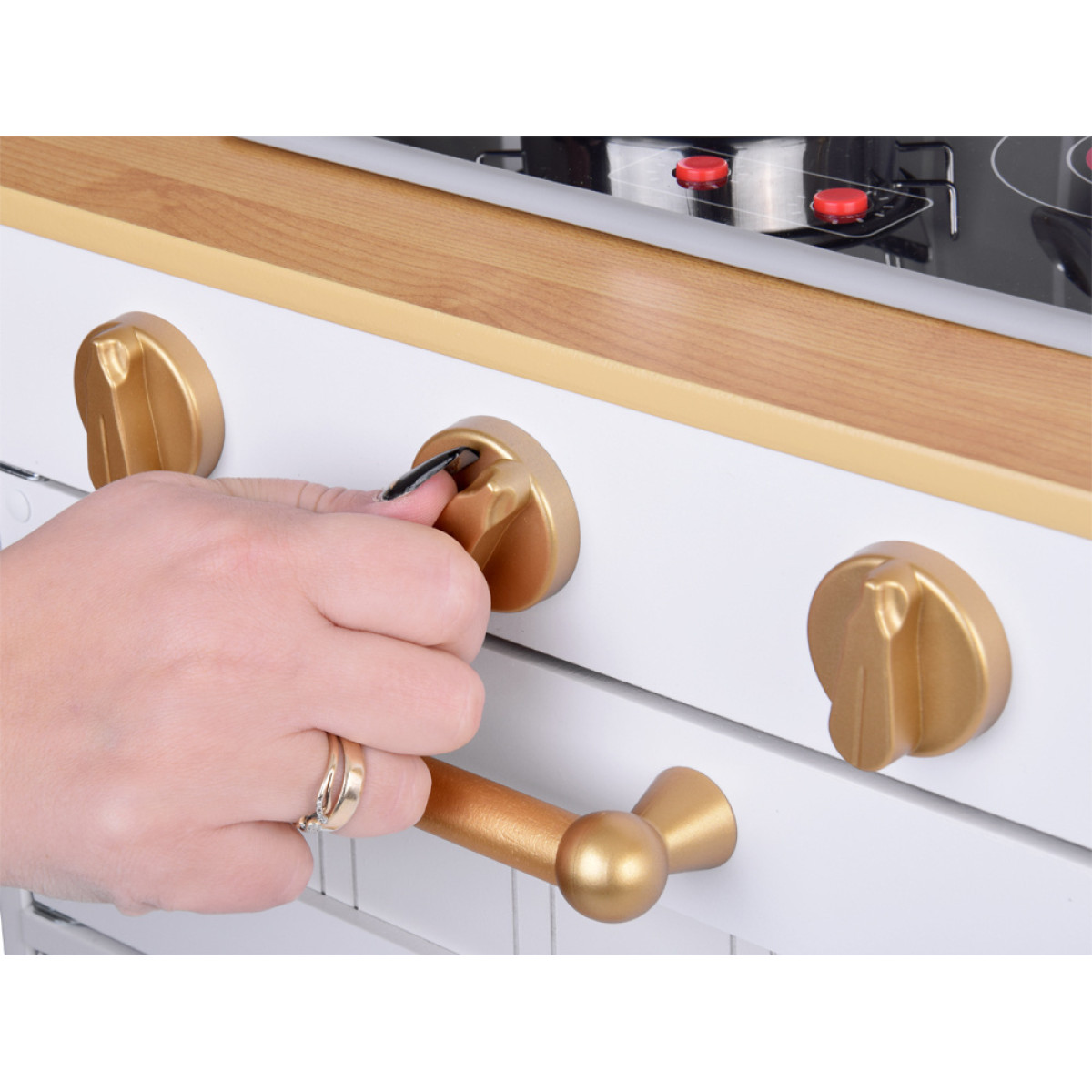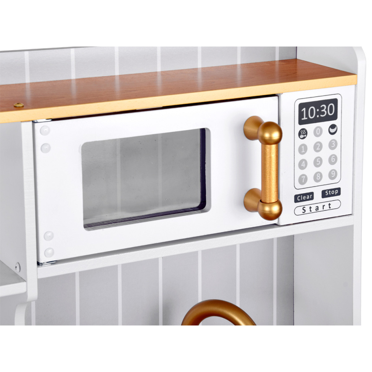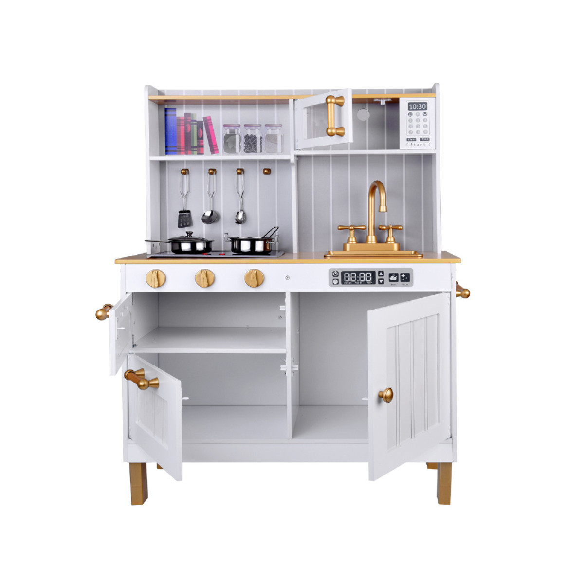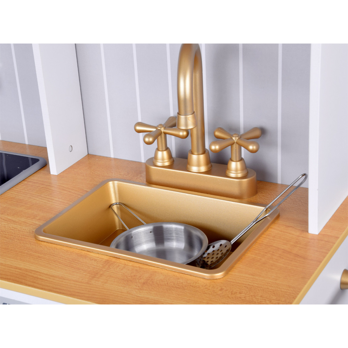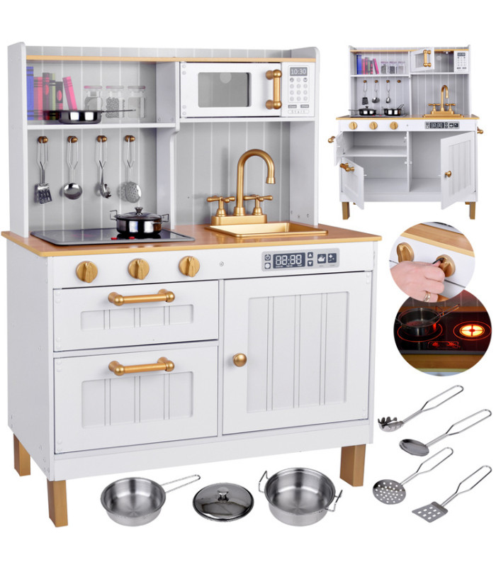 Virtuvė turi mikrobangų krosnelę, orkaitę ir indukcinę kaitlentę, kuri skleidžia maisto gaminimo garsus; auksiniai rankenėlės suteikia žaidimui papildomo interaktyvumo. Auksinis kriauklė su auksiniu čiaupu prideda prabangos virtuvei. Šone yra praktiškas kabyklis prijuostei, o dvi erdvios spintelės talpina visus priedus. Dėl nuimamo kojos, virtuvė gali augti kartu su vaiku, prisitaikydama prie jo poreikių. Balta virtuvė su auksinėmis detalėmis yra labai elegantiška ir tikrai derės prie kiekvieno vaiko kambario.