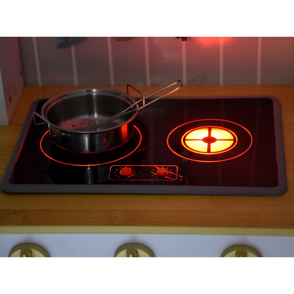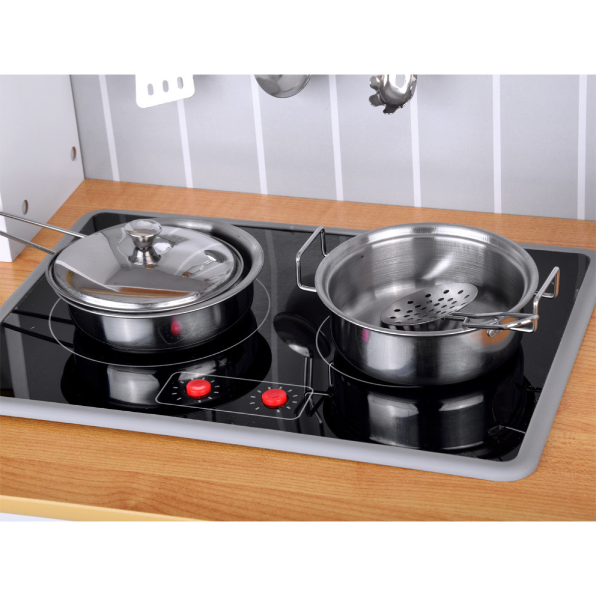 Laikas kulinarinei kelionei! Medinė virtuvė su priedais yra kiekvieno mažo virėjo svajonė. Rinkinys stebina ne tik gražiu, moderniu dizainu, bet ir interaktyviomis funkcijomis, kurios suteikia žaidimui dar daugiau realistiškumo. Dėl gausių priedų, tokių kaip puodas, keptuvė, kiaurasamtis, mentelė ar samčiai, vaikas gali pasijusti tikru šefu ir ruošti skanius patiekalus.