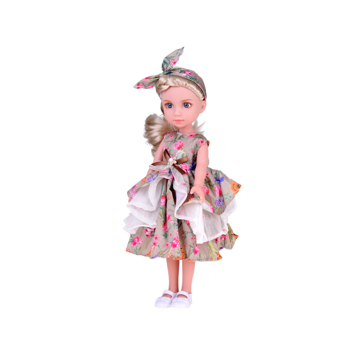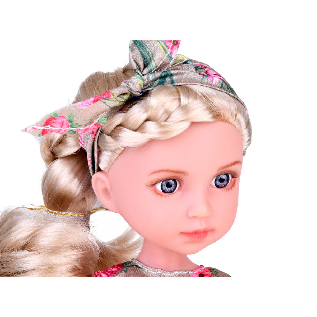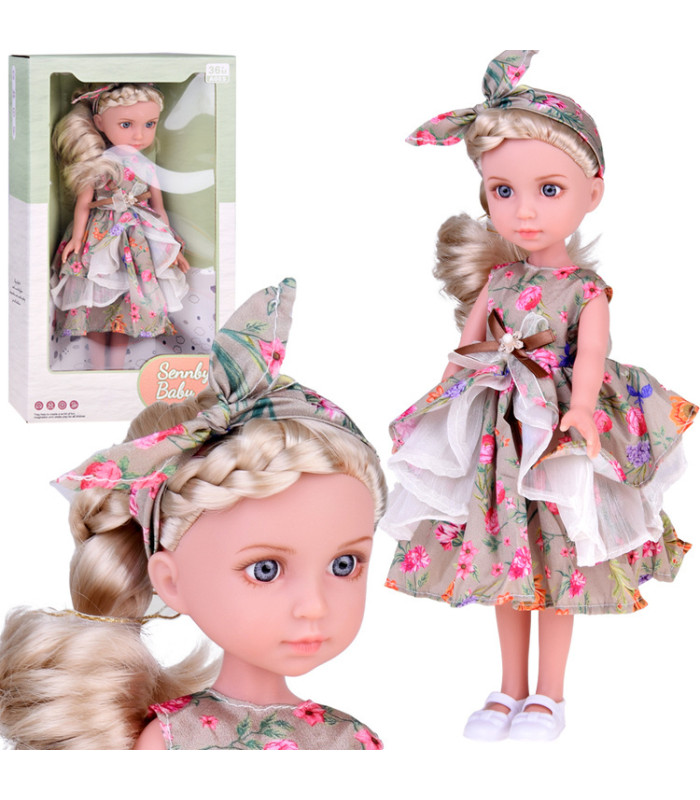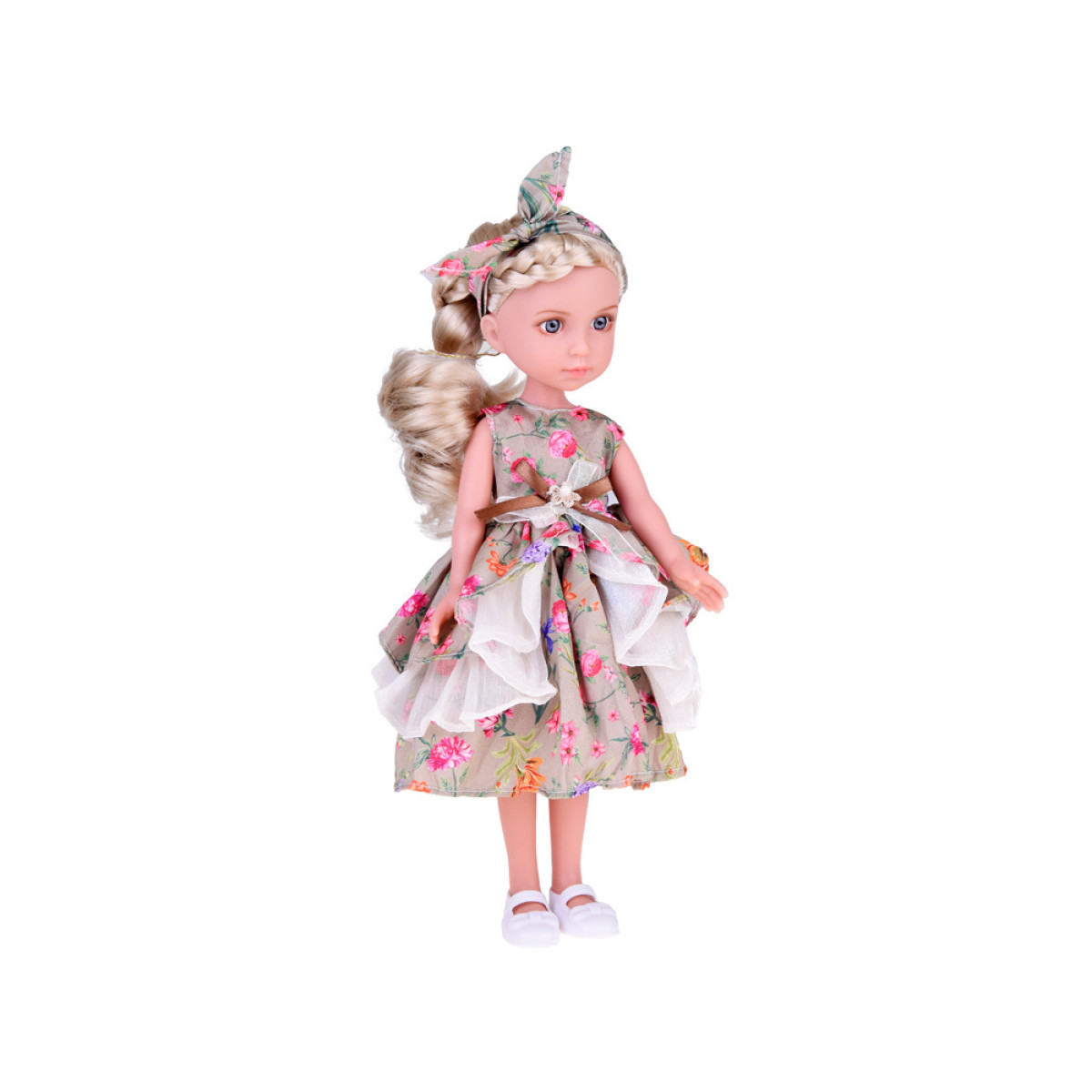 Elegantiška lėlė su gėlėta suknele ir stilinga galvos juosta