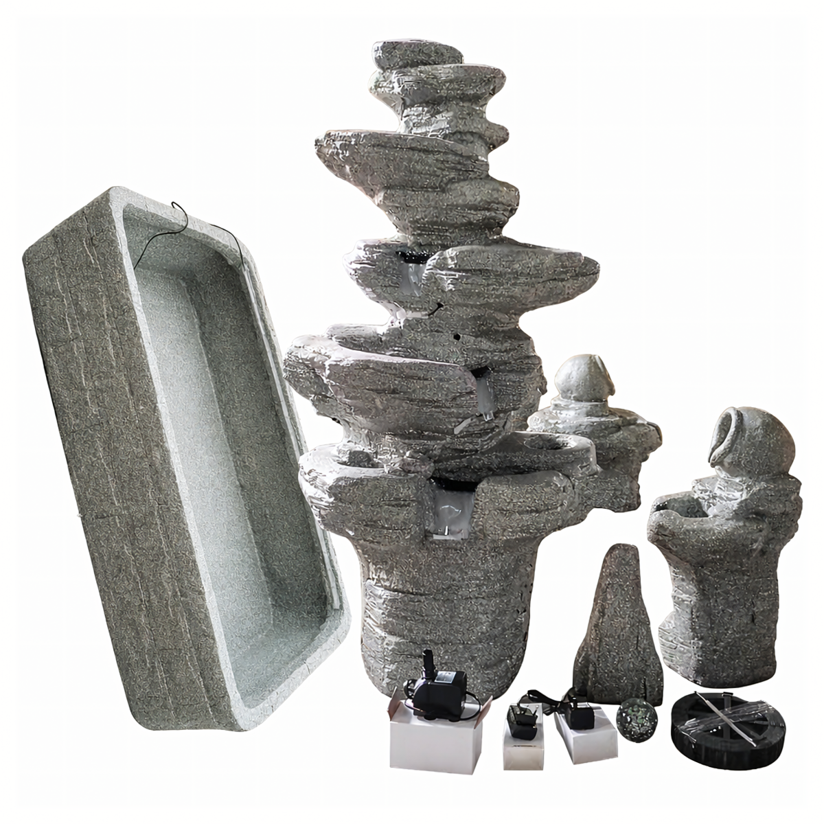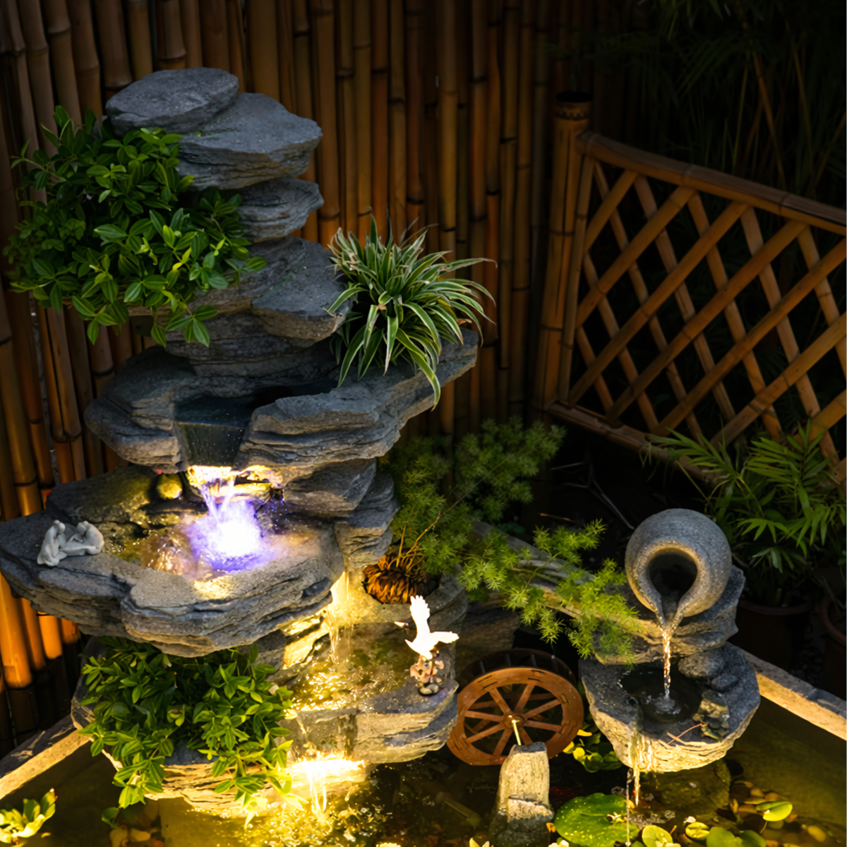 Didelis dekoratyvinis sodo fontanas su kaskada ir LED apšvietimu padeda sukurti jaukią, išskirtinę ir atpalaiduojančią aplinką sode, kieme ar terasoje. Tai ne tik stilinga lauko puošmena, bet ir praktiškas sprendimas norint suteikti erdvei daugiau gyvumo bei elegancijos.