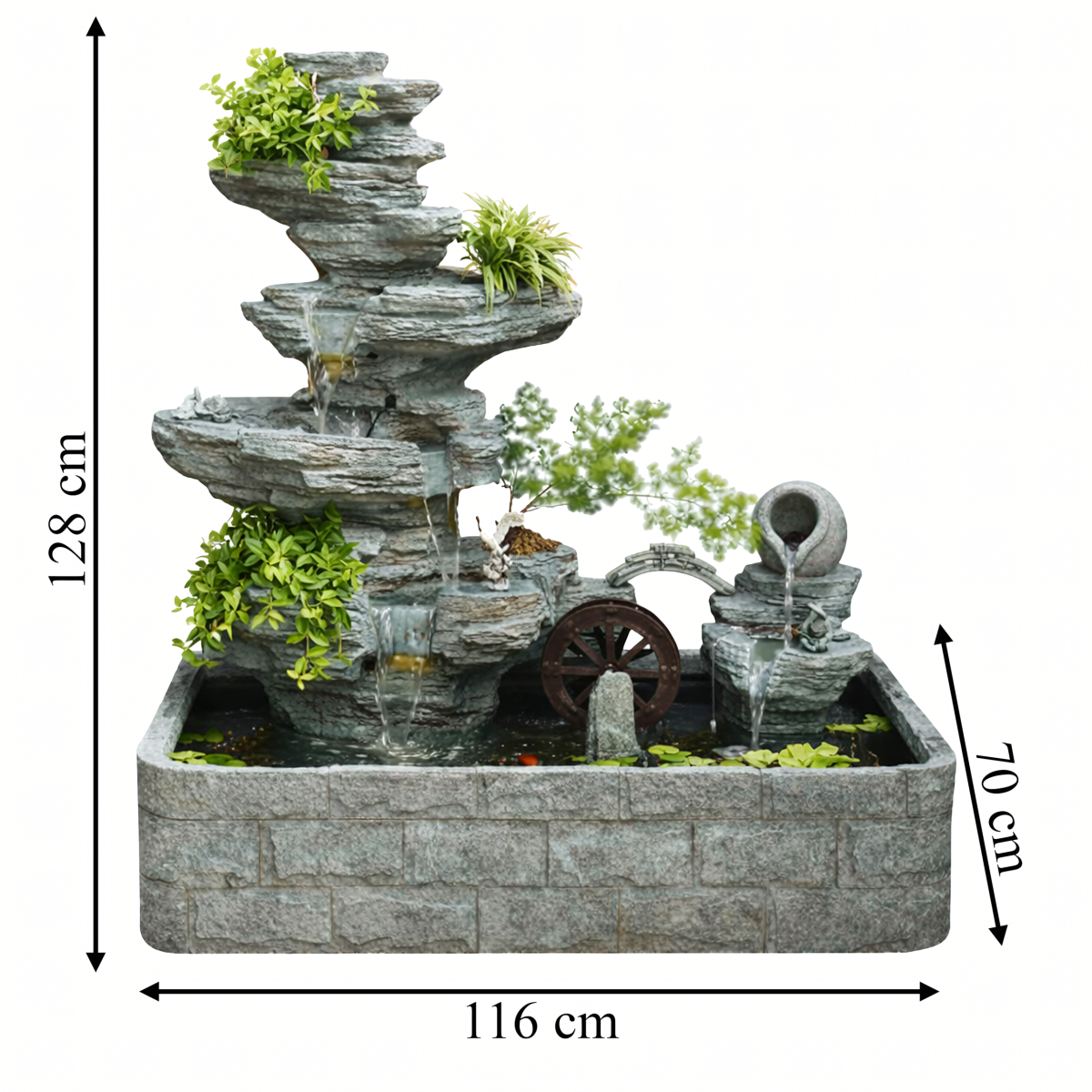 - Didelis dydis – fontano matmenys yra 128 x 70 x 116 cm, todėl jis tampa ryškiu aplinkos akcentu.
