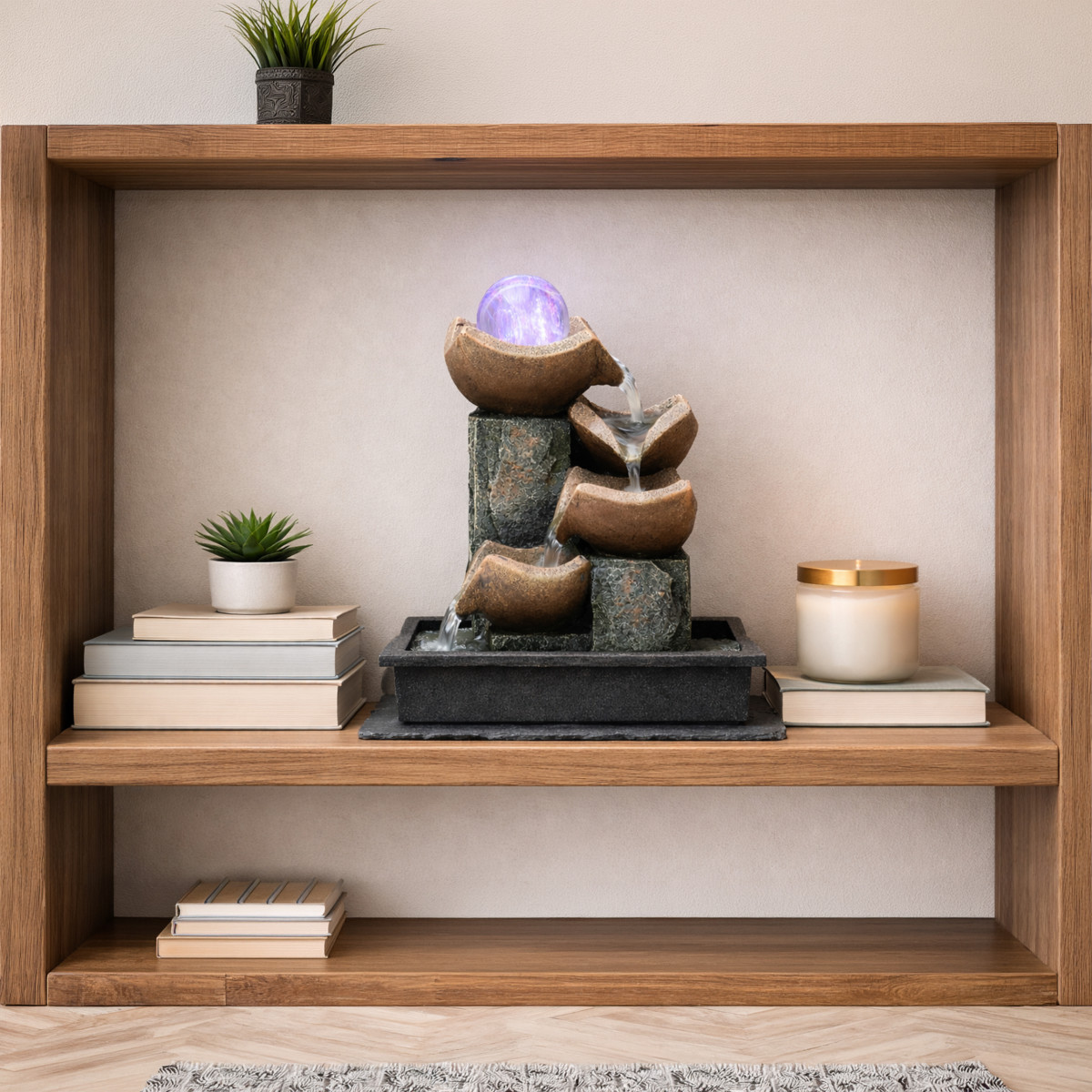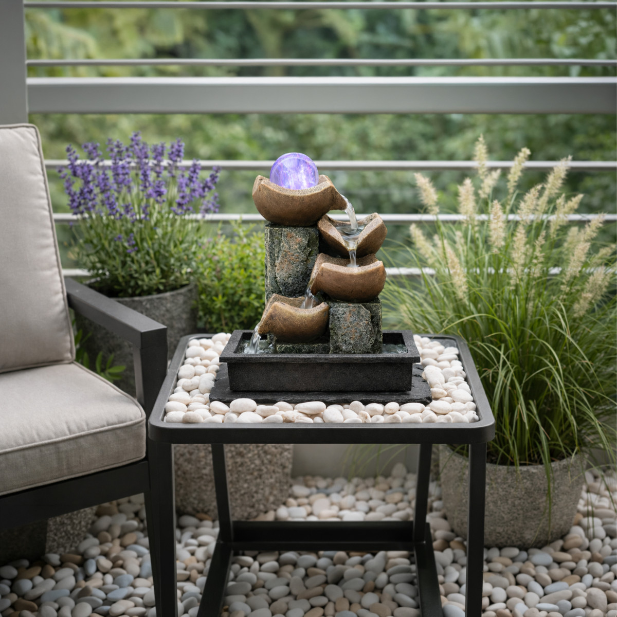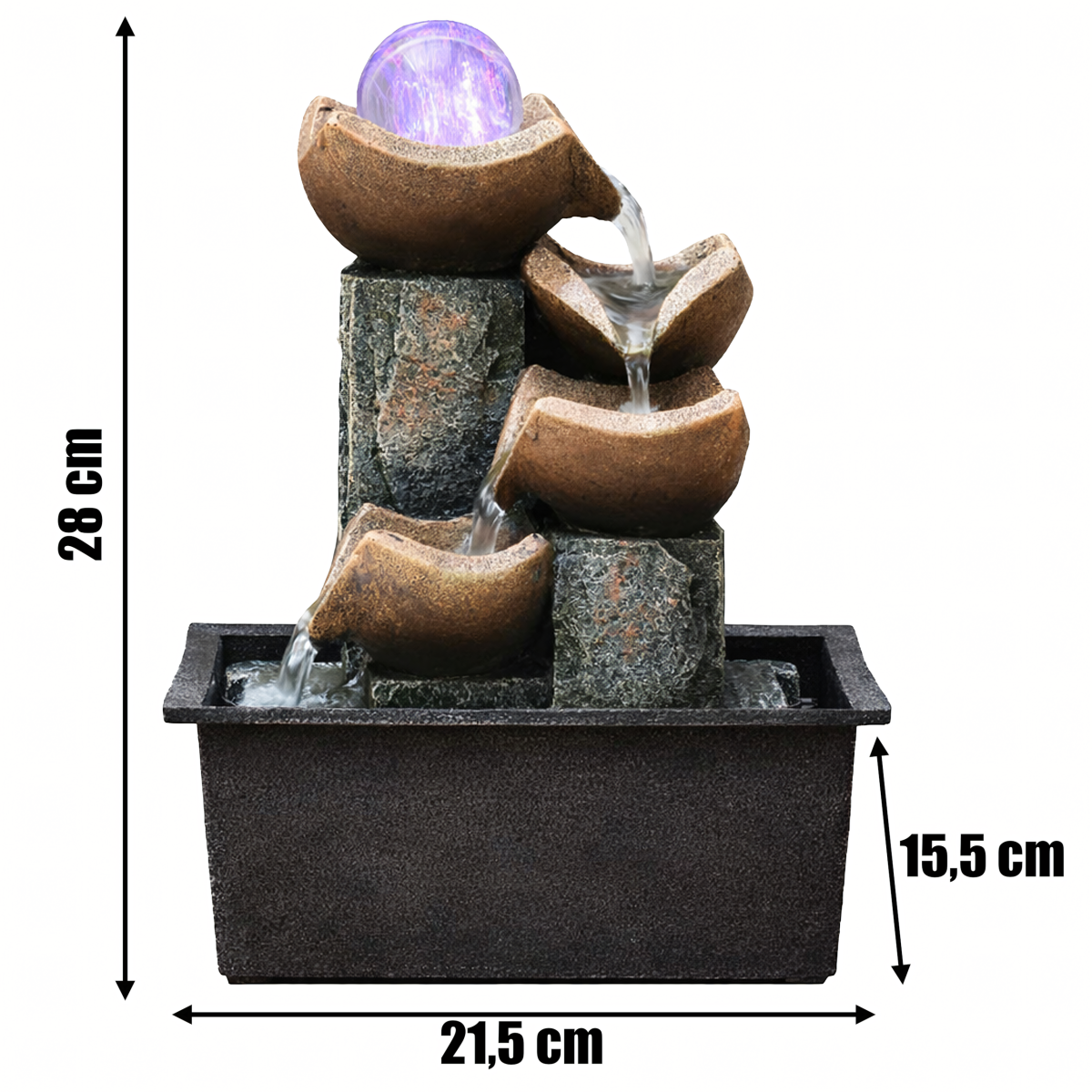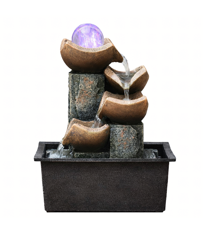 Šis dekoratyvinis fontanas puikiai tinka stalui, terasai, balkonui ar sodui. Kompaktiškas dydis ir estetiškas dizainas padeda lengvai pritaikyti jį įvairiose erdvėse. Led apšvietimas suteikia jaukumo ir sukuria malonią atmosferą tiek dieną, tiek vakare.