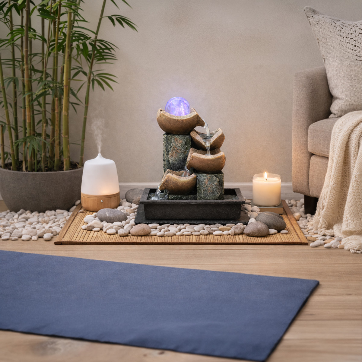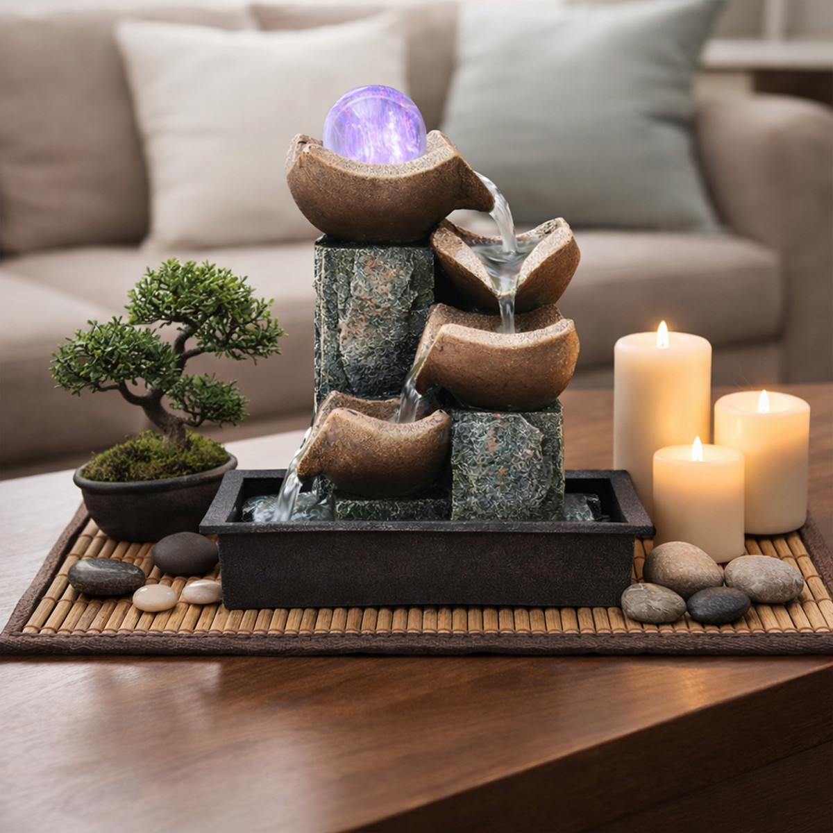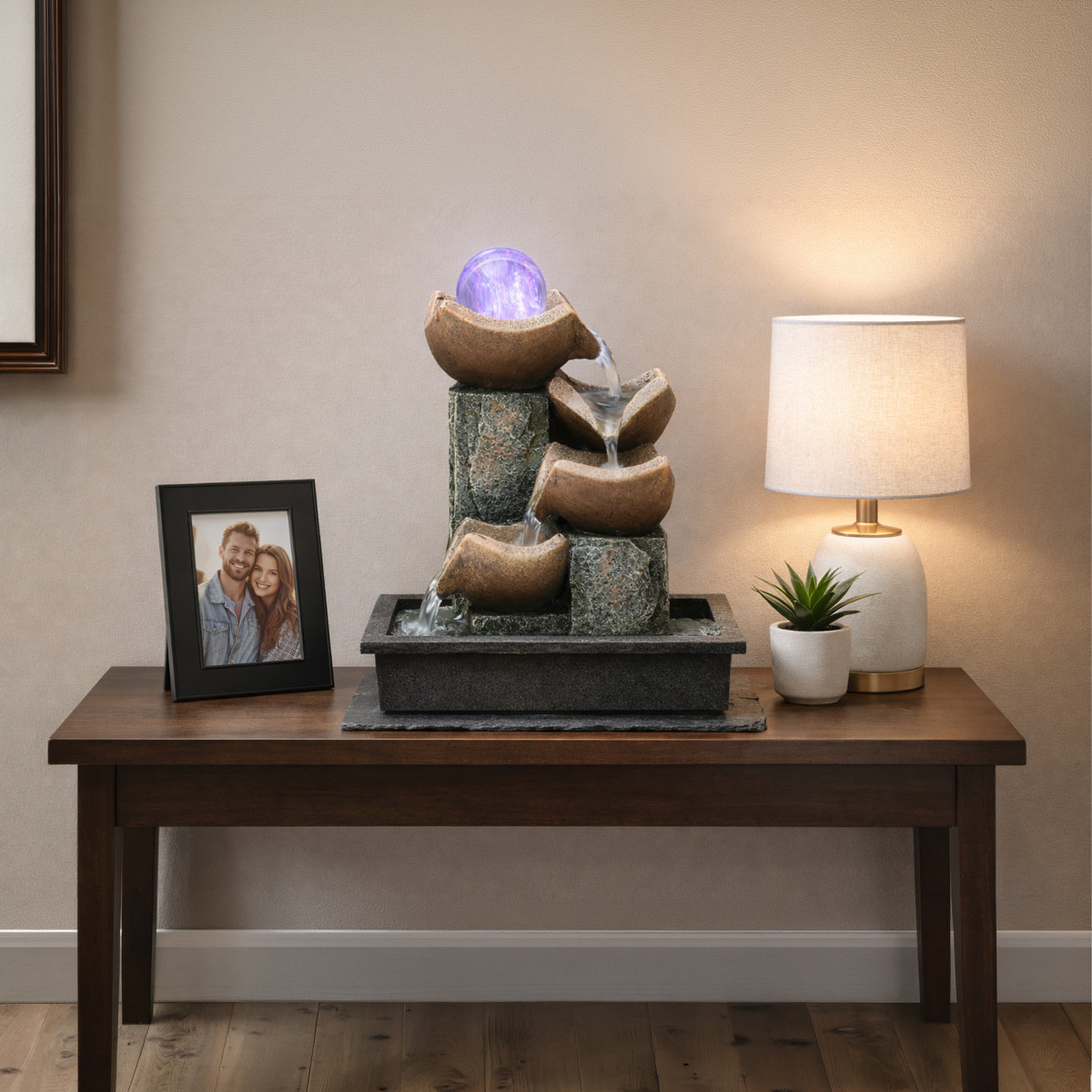 Šis dekoratyvinis fontanas puikiai tinka stalui, terasai, balkonui ar sodui. Kompaktiškas dydis ir estetiškas dizainas padeda lengvai pritaikyti jį įvairiose erdvėse. Led apšvietimas suteikia jaukumo ir sukuria malonią atmosferą tiek dieną, tiek vakare.