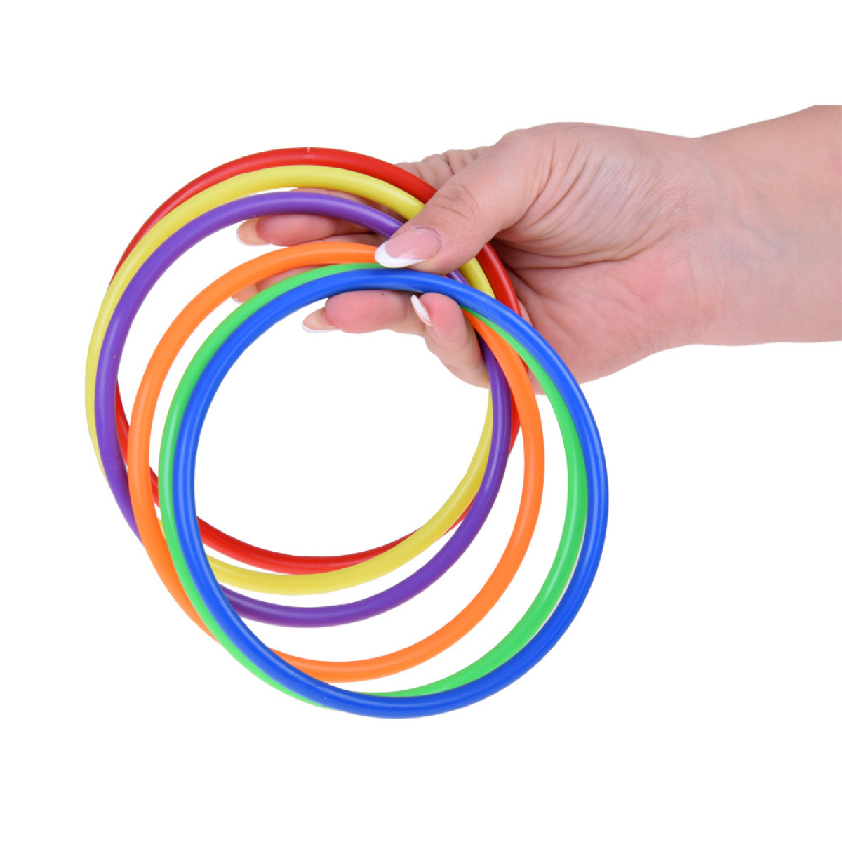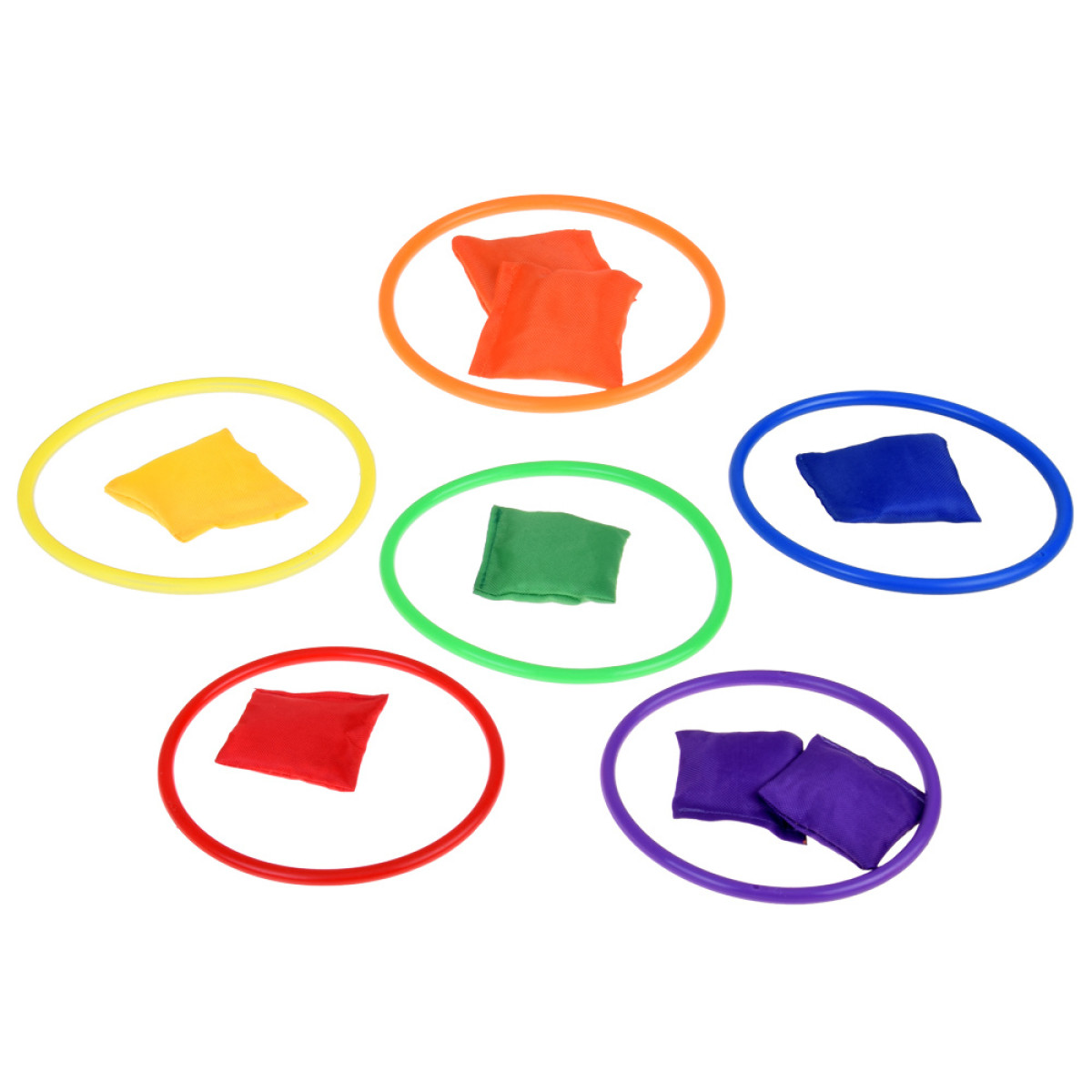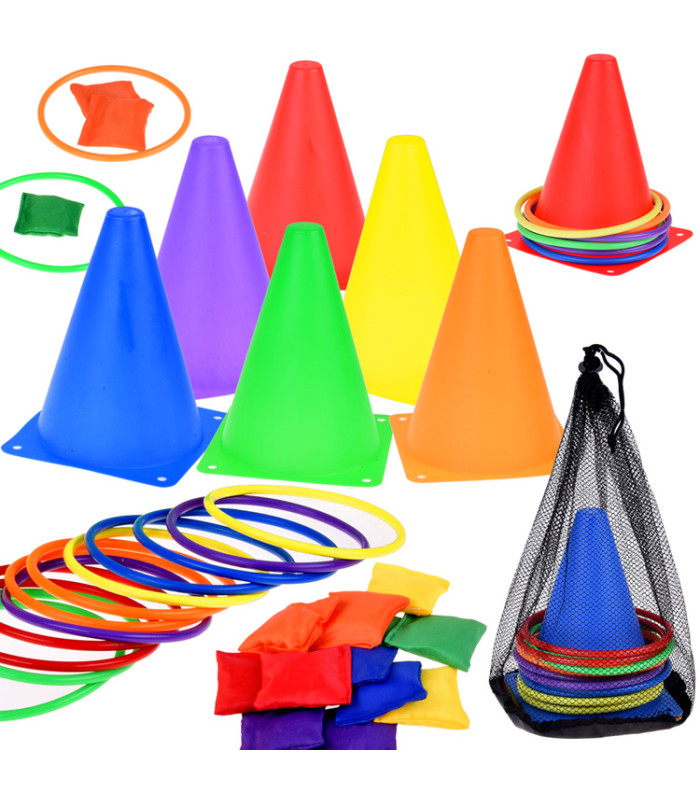 - 12 spalvingų lankų – lengvi, puikiai tinkantys metimams ir naujų žaidimų scenarijų kūrimui. Galima juos dėti aplink kūgius ar maišelius, kuriant įvairias užduotis.