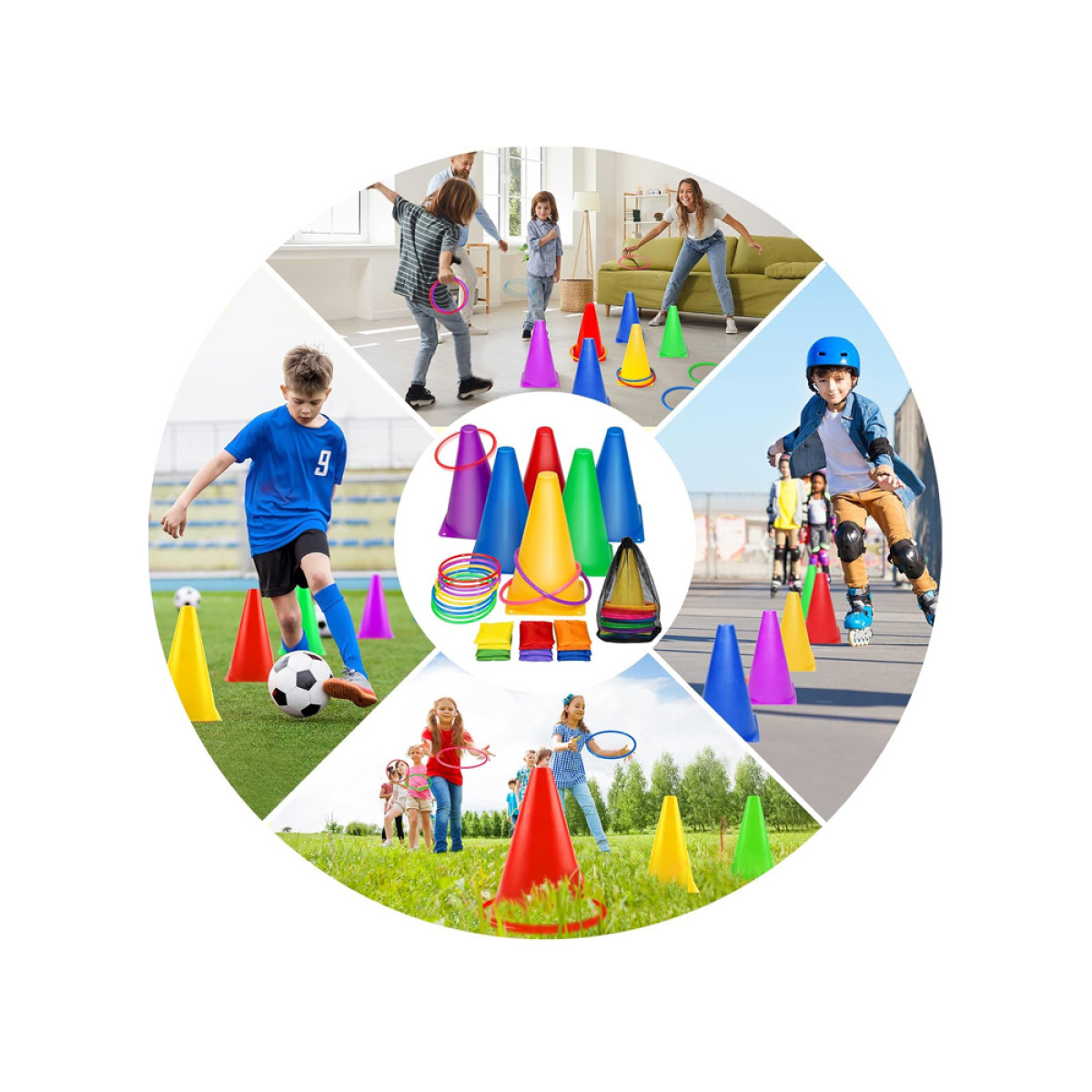 - 6 spalvingus kūgius – lengvi, tvirti ir matomi iš tolo. Jie tinka kaip taikiniai arba žaidimo lauko žymekliai.