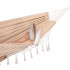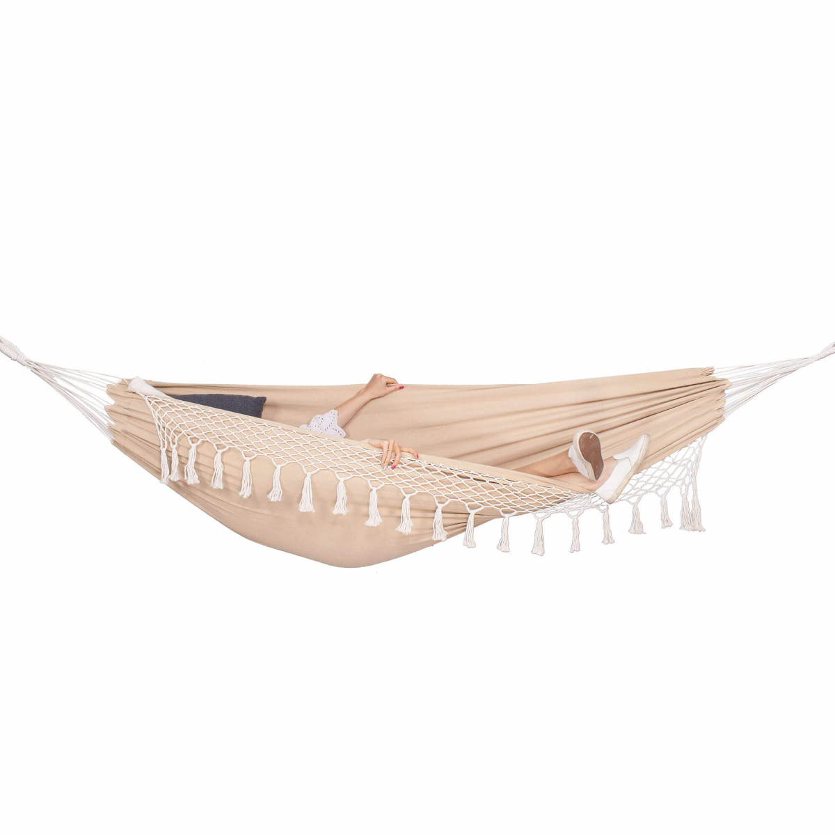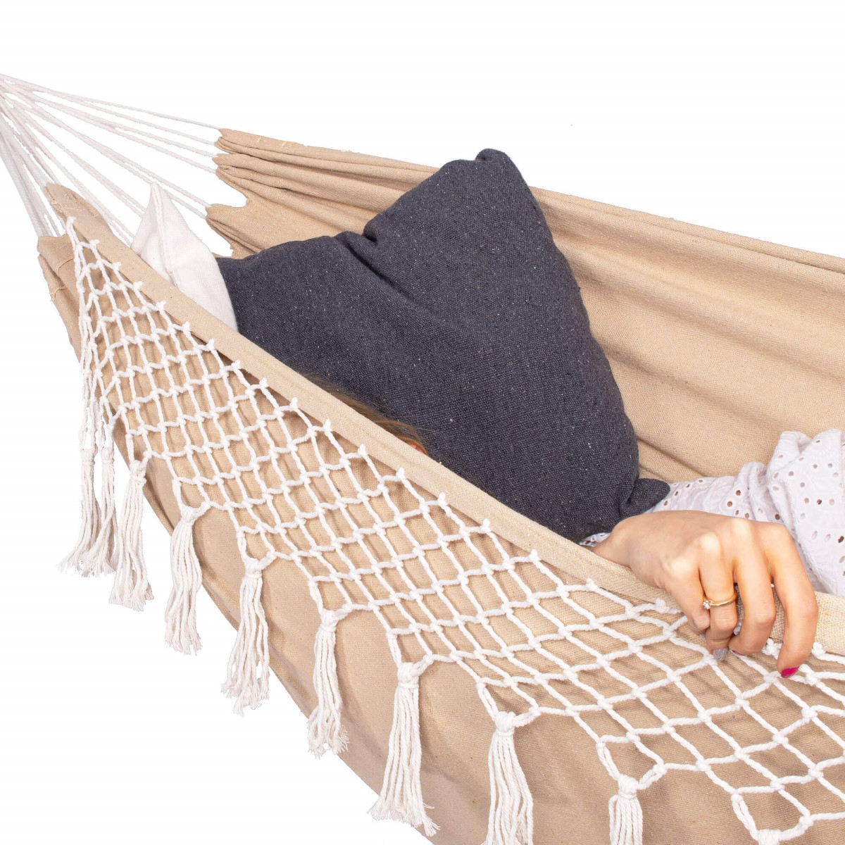 Šūpuoklės išmatavimai: 200 x 150 cm, bendras ilgis su šoninėmis virvėmis: 260 cm. Pagaminta iš kokvilnės ir poliesterio, spalva: rudi ir smėliniai tonai. Svoris: 2,35 kg.
