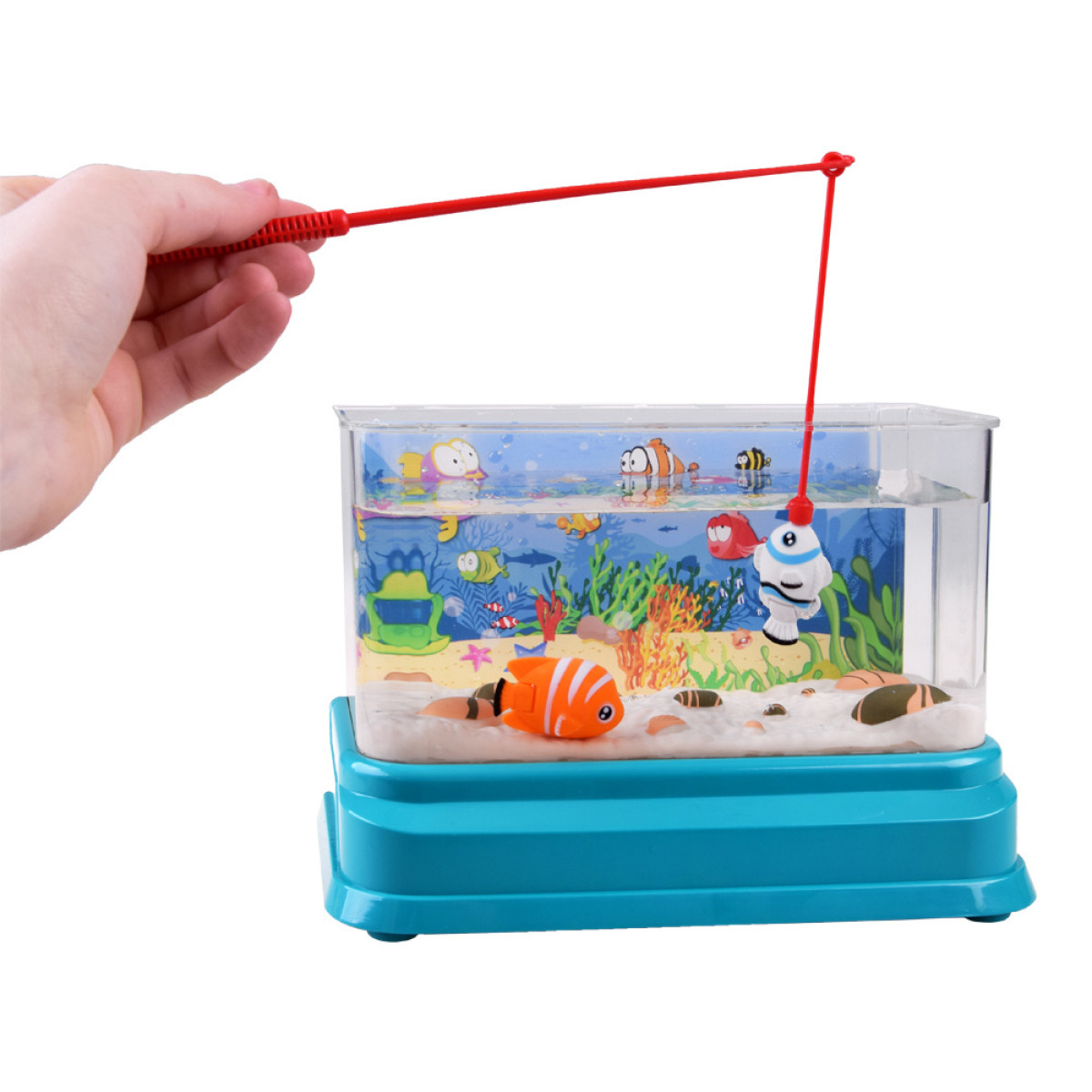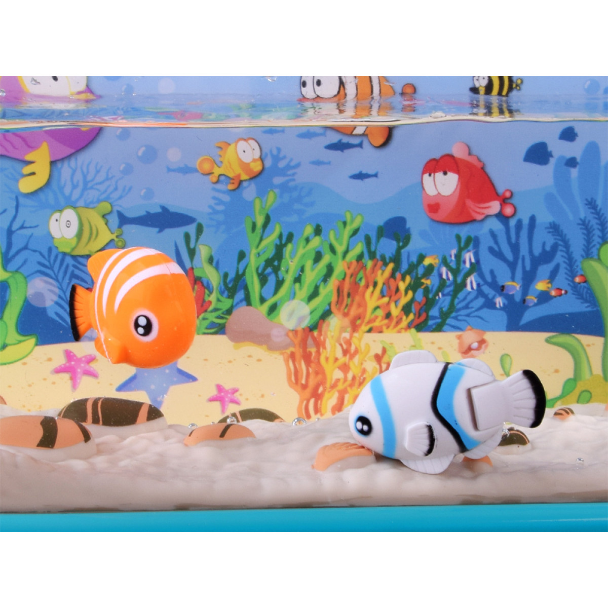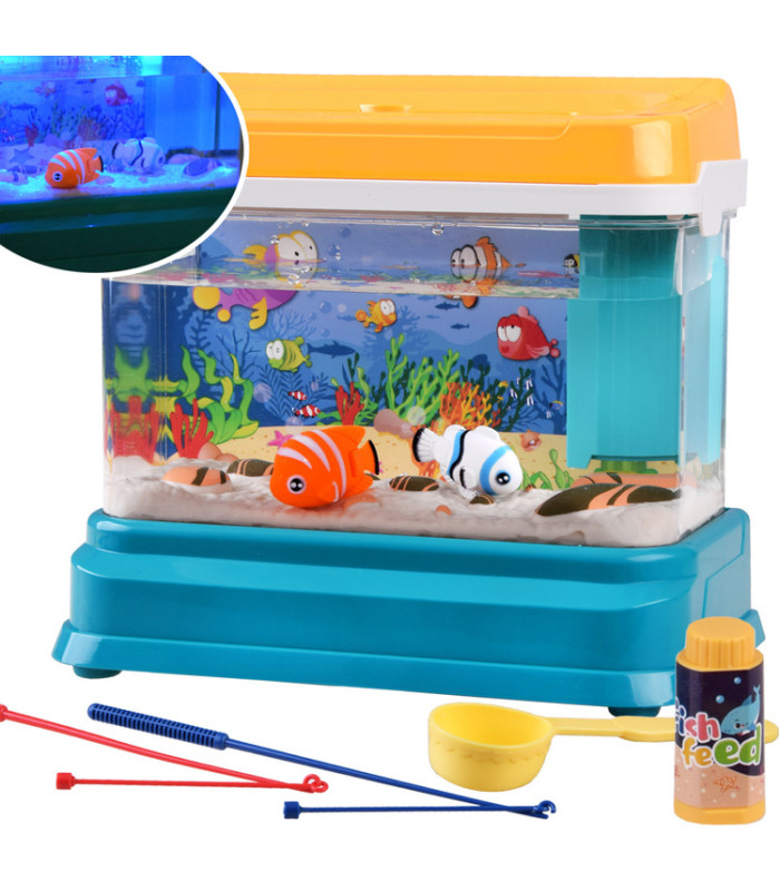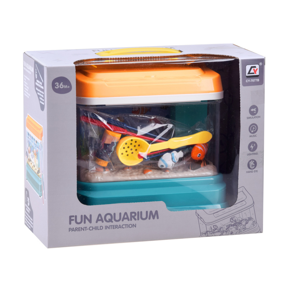 Akvariumas maitinamas per USB jungtį, o prijungus žaislą prie elektros, akvariumas apšviestas. Iš viršutinio dangčio teka keturios vandens srovės, kurios sukuria burbulus akvariume. Perjungiklis ant akvariumo dangčio taip pat leidžia įjungti malonią melodiją. Visą laiką akvariume dega šviesa, kuri sukuria labai malonią atmosferą. Komplekte esančios meškerės leidžia vaikui ir tėvams žaisti žvejyba. Žinoma, laimi tas, kuris pirmas sugauna žuvytę! Idėjų žaisti su akvariumu galima sugalvoti daugybę.