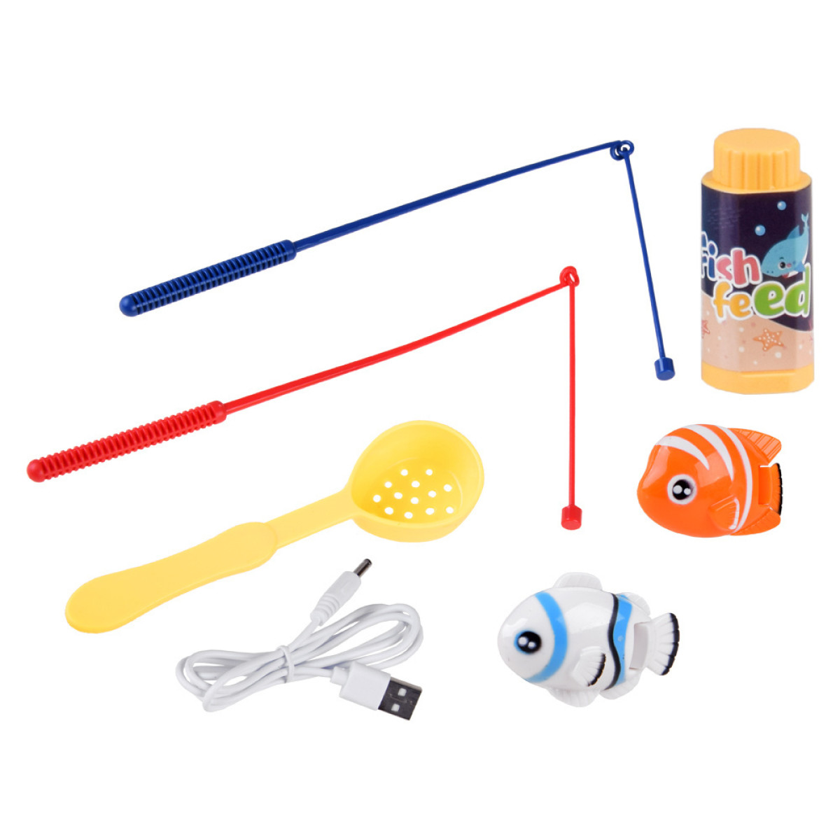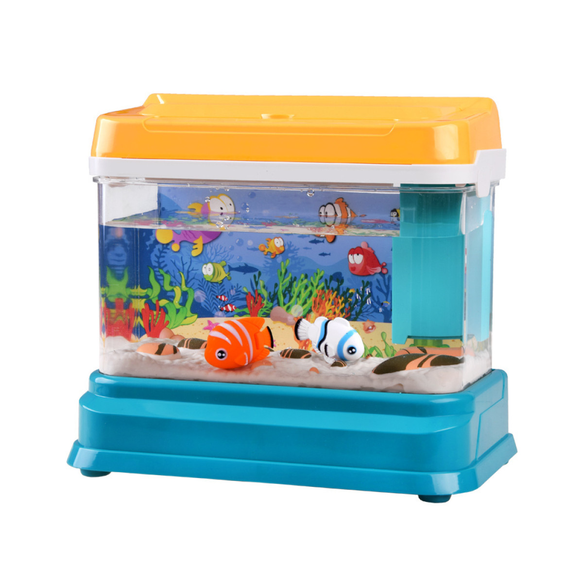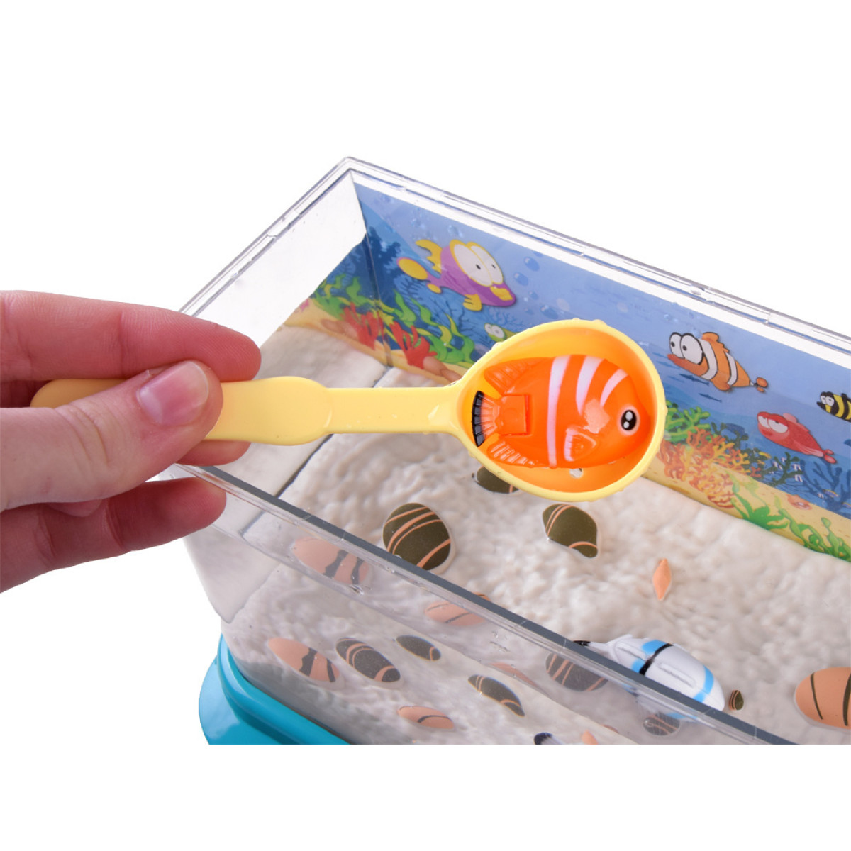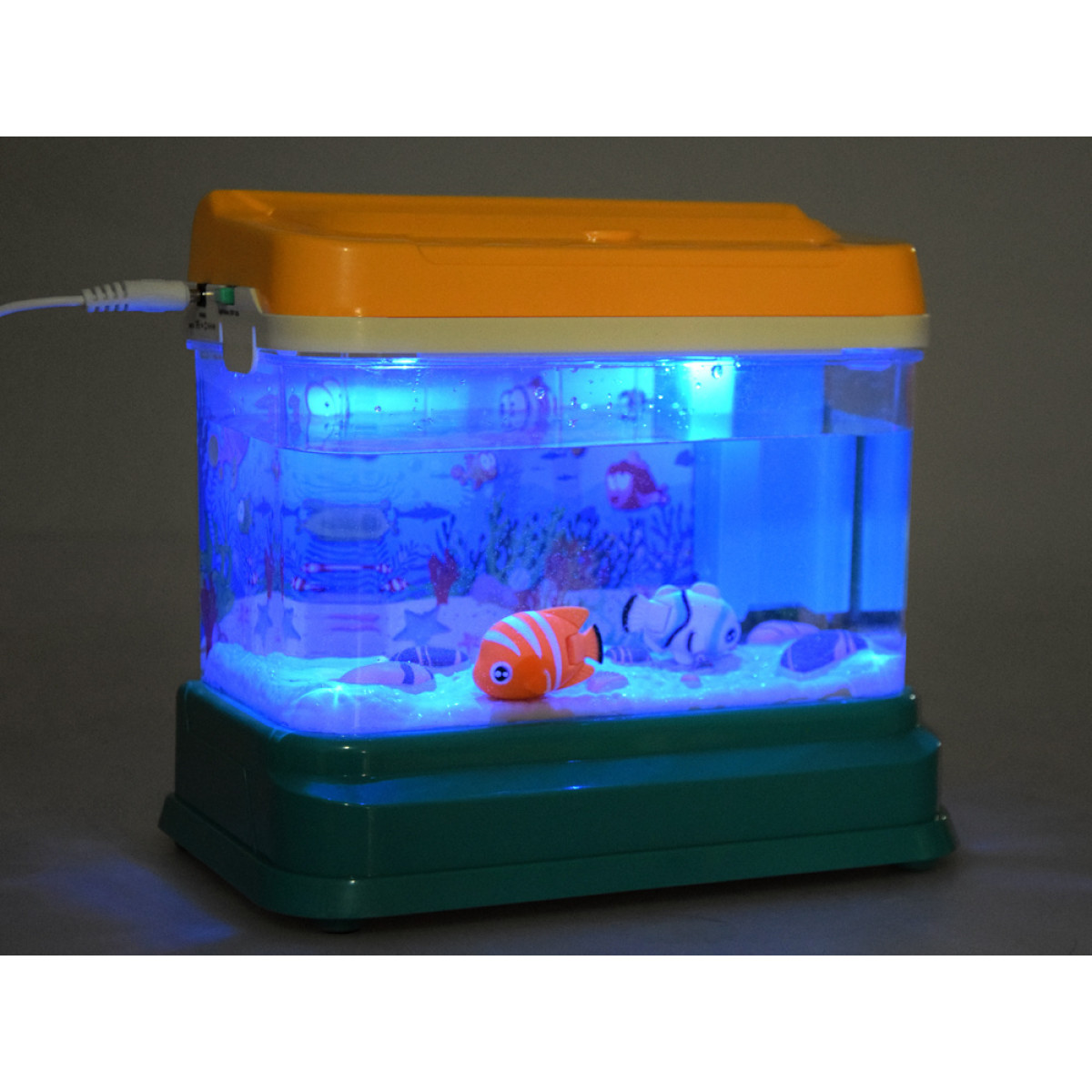 Akvariumas maitinamas per USB jungtį, o prijungus žaislą prie elektros, akvariumas apšviestas. Iš viršutinio dangčio teka keturios vandens srovės, kurios sukuria burbulus akvariume. Perjungiklis ant akvariumo dangčio taip pat leidžia įjungti malonią melodiją. Visą laiką akvariume dega šviesa, kuri sukuria labai malonią atmosferą. Komplekte esančios meškerės leidžia vaikui ir tėvams žaisti žvejyba. Žinoma, laimi tas, kuris pirmas sugauna žuvytę! Idėjų žaisti su akvariumu galima sugalvoti daugybę.