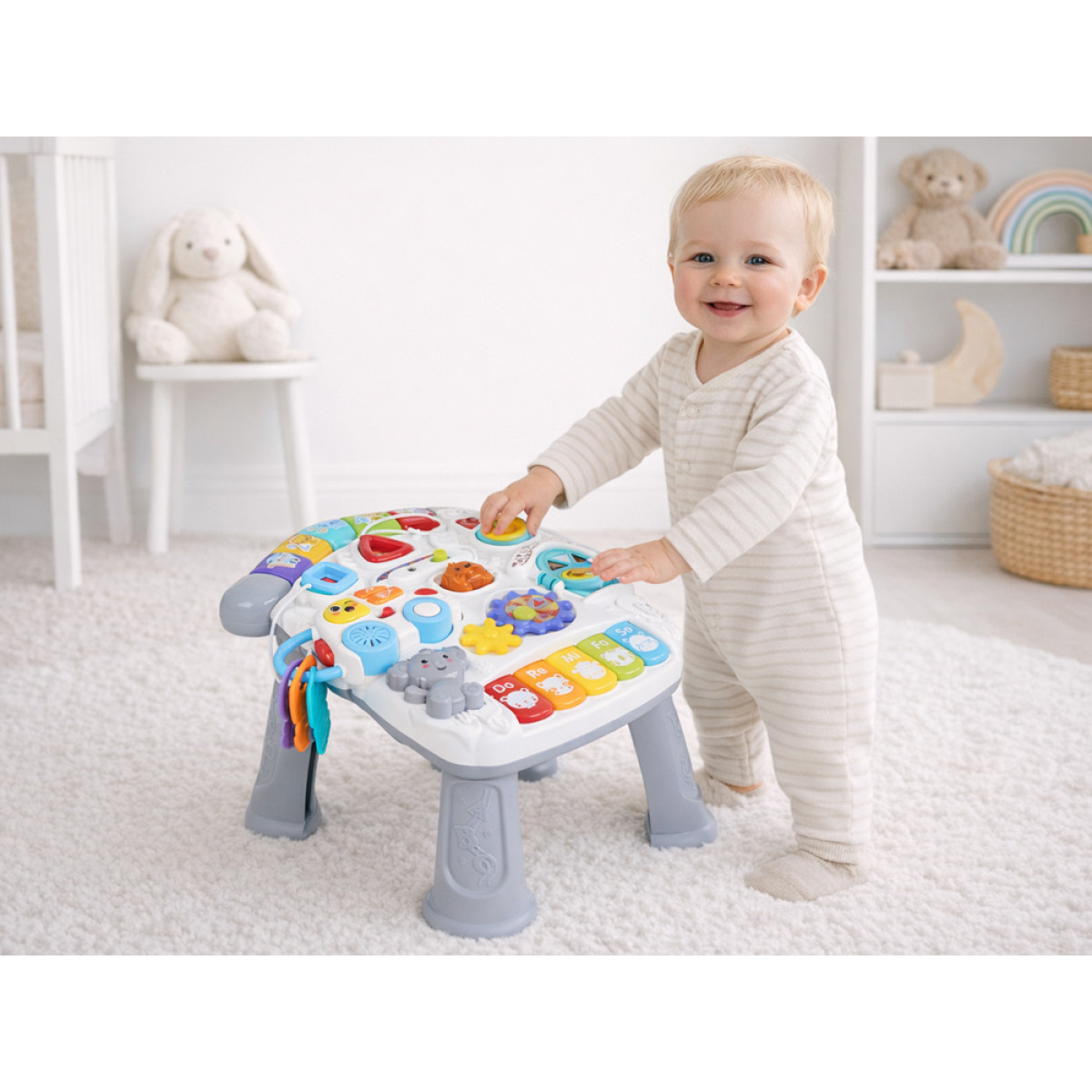 Kiekvienas staliuko elementas skatina liesti, spausti, stumdyti ir atrasti naujas funkcijas. Dėl to vaikas: