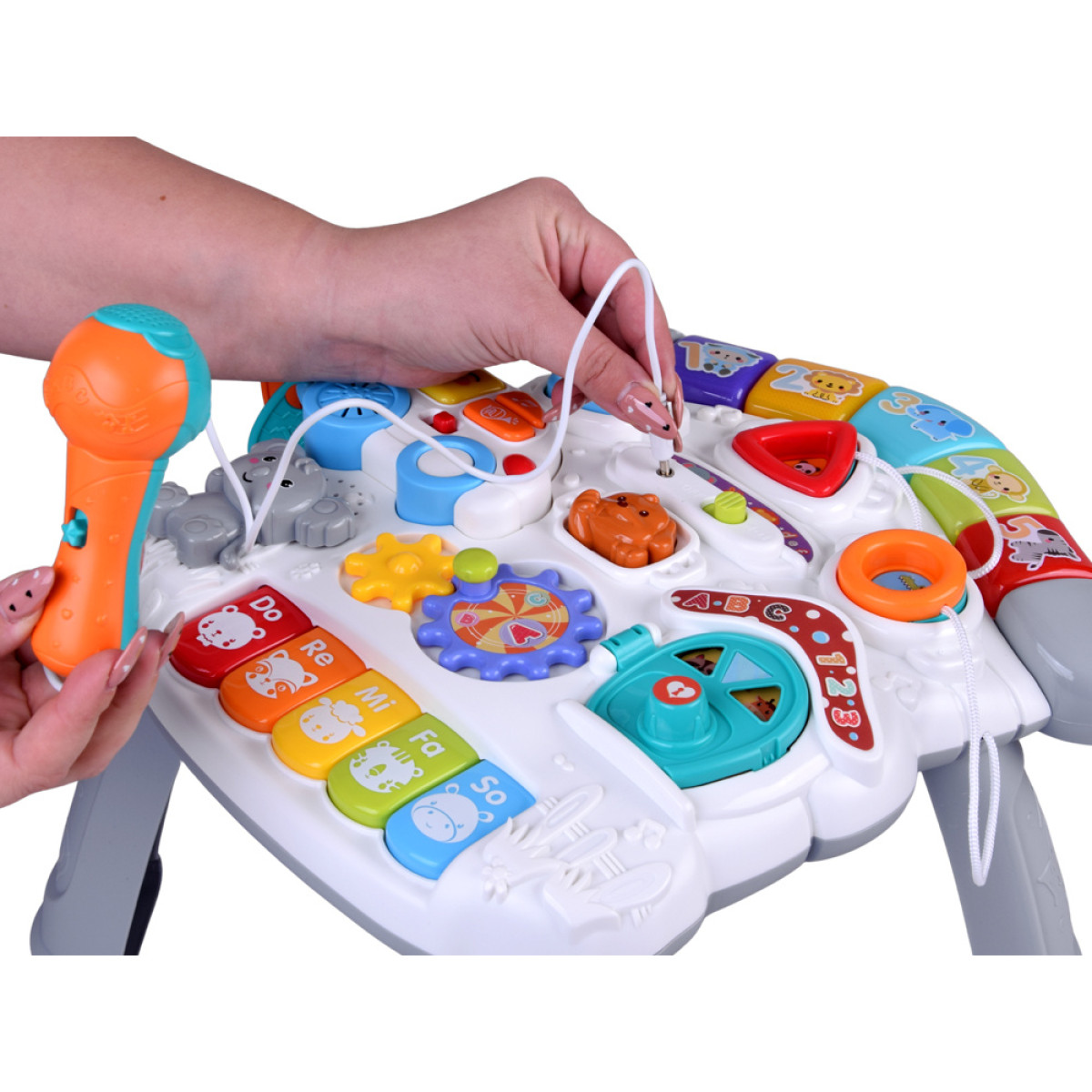 Įmontuotas mikrofonas leidžia vaikui kalbėti ar dainuoti, o jo balsas sustiprinamas staliuko garsiakalbiu. Taip mažylis gali jaustis kaip mažas artistas ir puikiai praleisti laiką žaisdamas.
