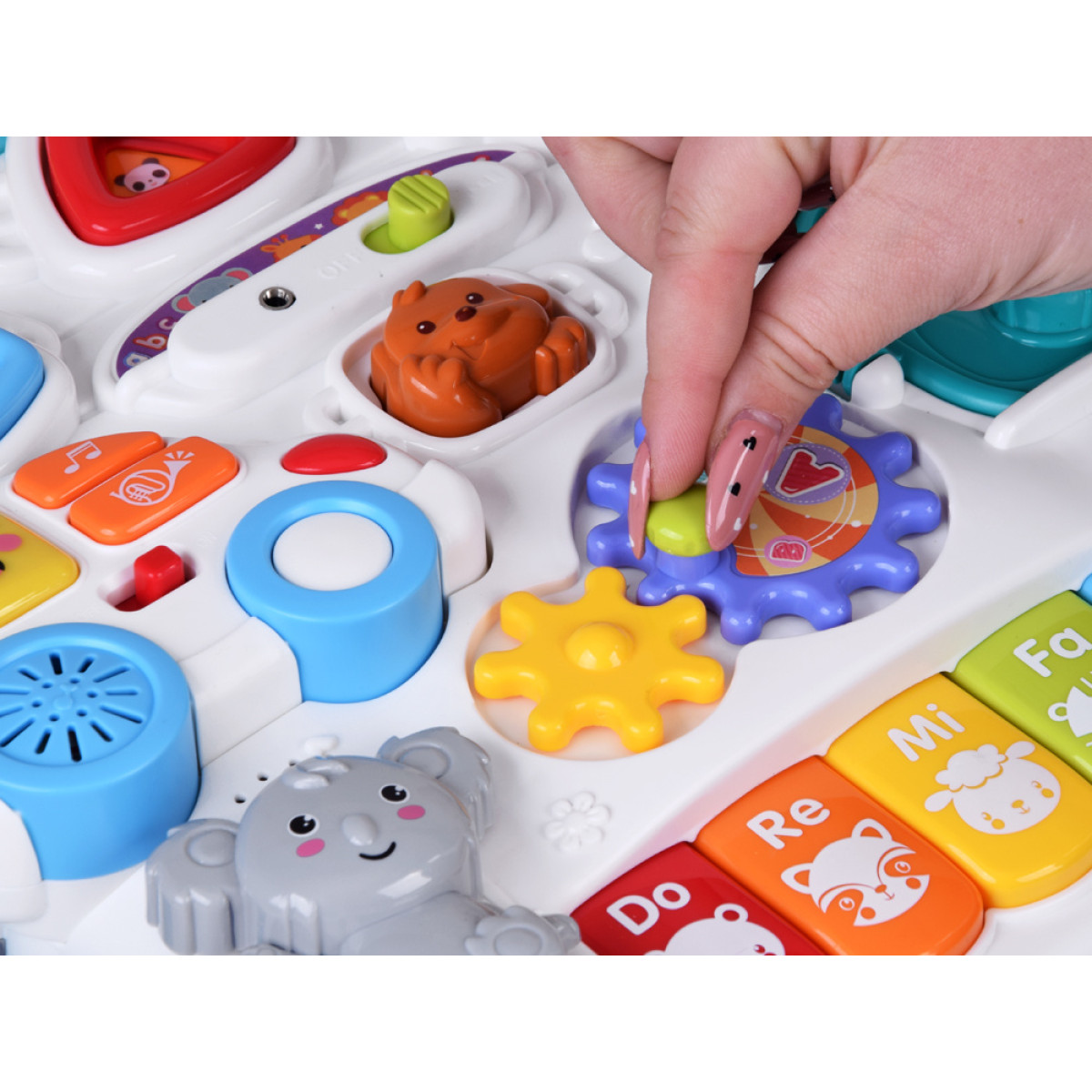 • Daugybė pramogų viename žaisle – pianinas, automobilis, gyvūnėliai, formos ir judantys elementai.