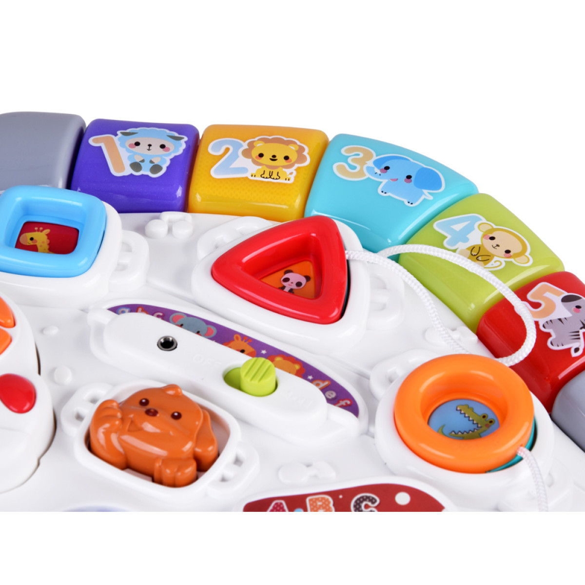 Spalvoti klavišai su natomis leidžia vaikui pažinti garsus ir melodijas. Paspaudžiant taip pat atsiranda šviesos efektai, kurie papildomai pritraukia dėmesį.