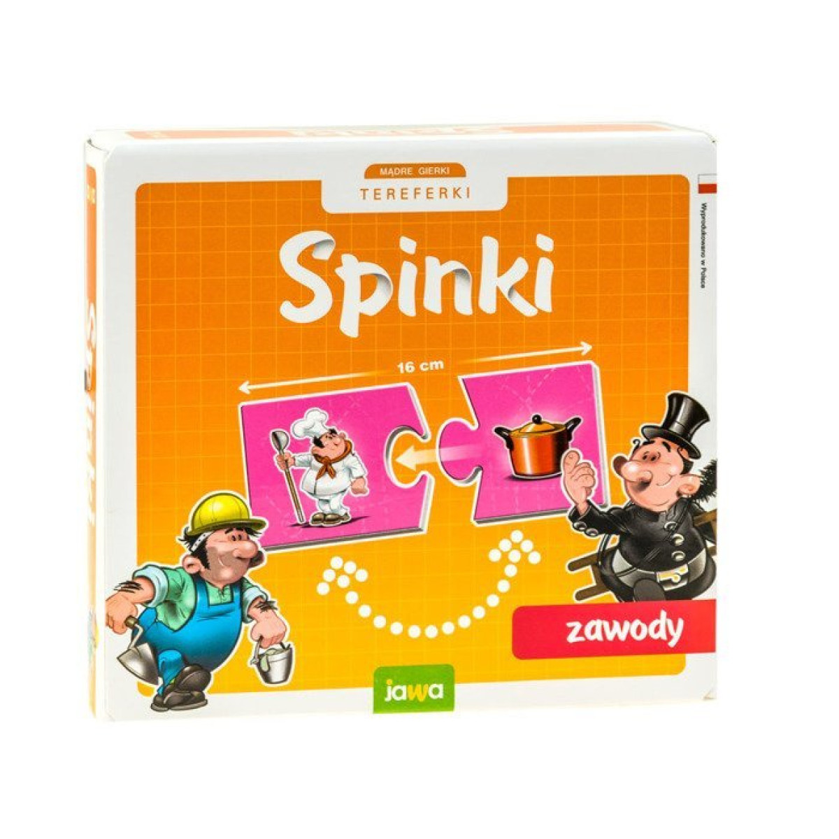 Jawa Edukacinis žaidimas SPINKI - Profesijos yra puiki dėlionė, skirta ikimokyklinio amžiaus vaikams. Ji sujungia mokymąsi su žaidimu, suteikdama vaikams džiaugsmą atrasti profesijų pasaulį. Žaidimo tikslas - suderinti atitinkamus dėlionės elementus, kur vaikai renkasi profesijas atitinkančius daiktus. Pavyzdžiui, virėjo paveikslėlį reikia sujungti su puodu, o mechaniko - su veržliarakčiu. Tokia veikla skatina vaizduotę, leidžia susipažinti su įvairiomis profesijomis bei įveda mažuosius į pagrindines sąvokas, susijusias su darbu ir įrankiais.