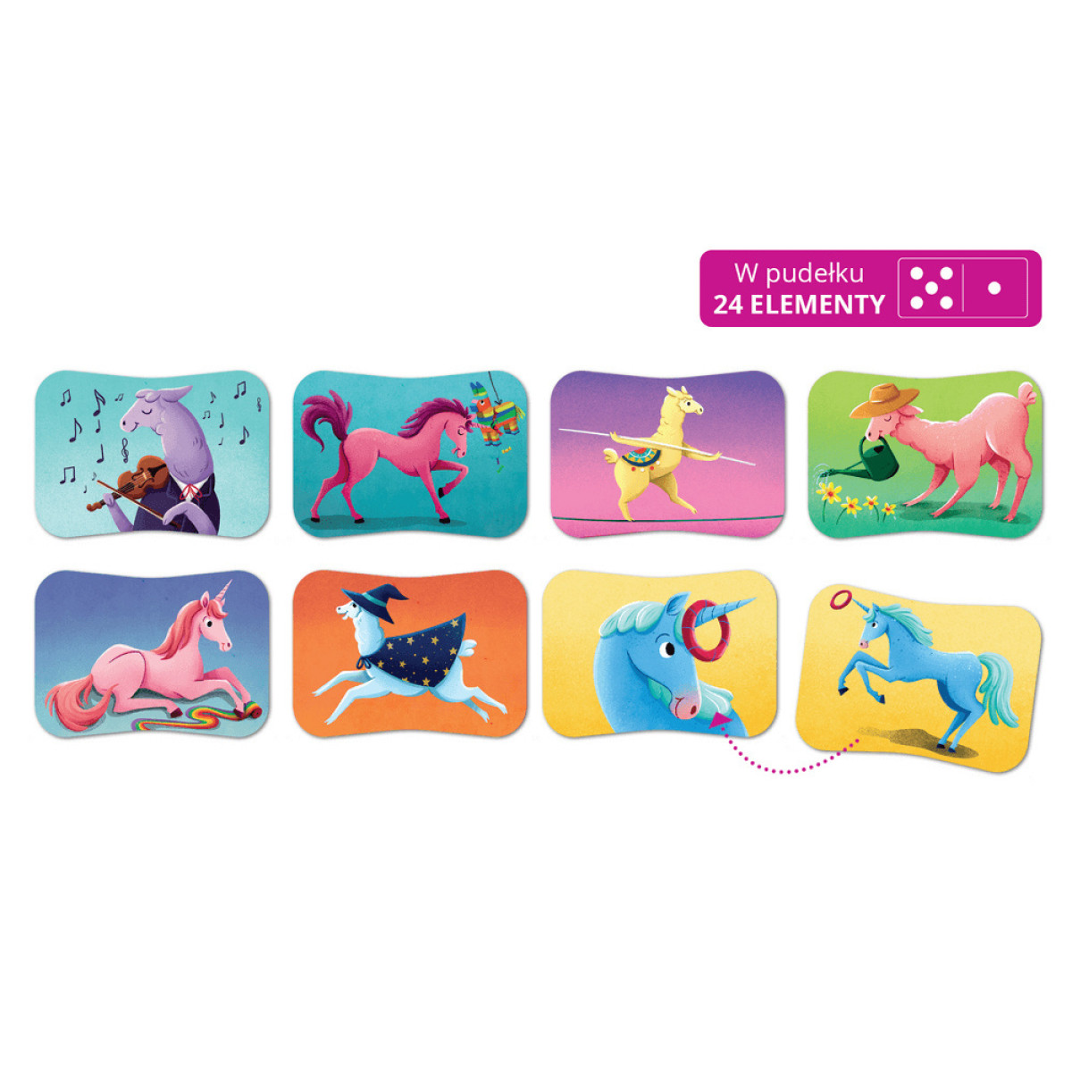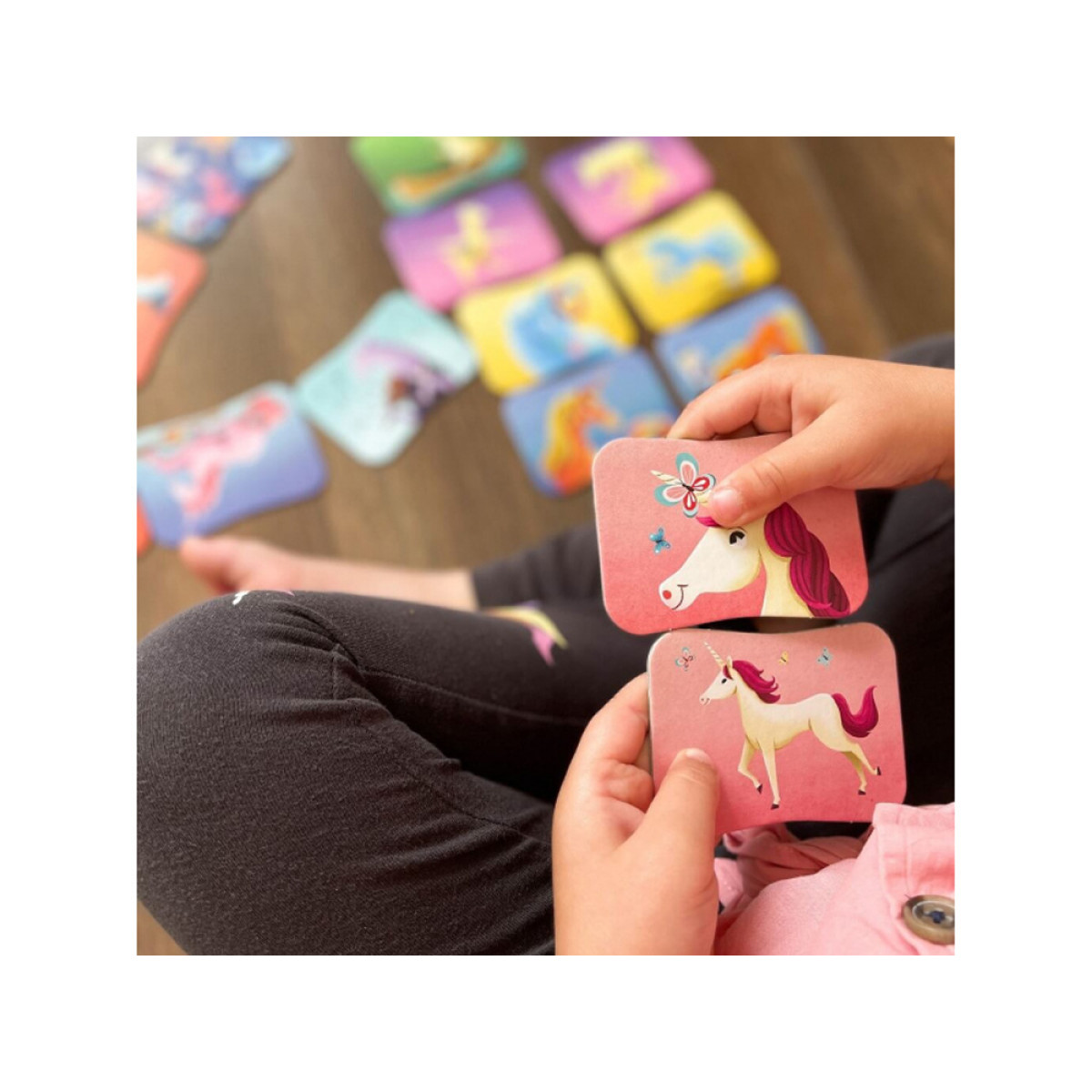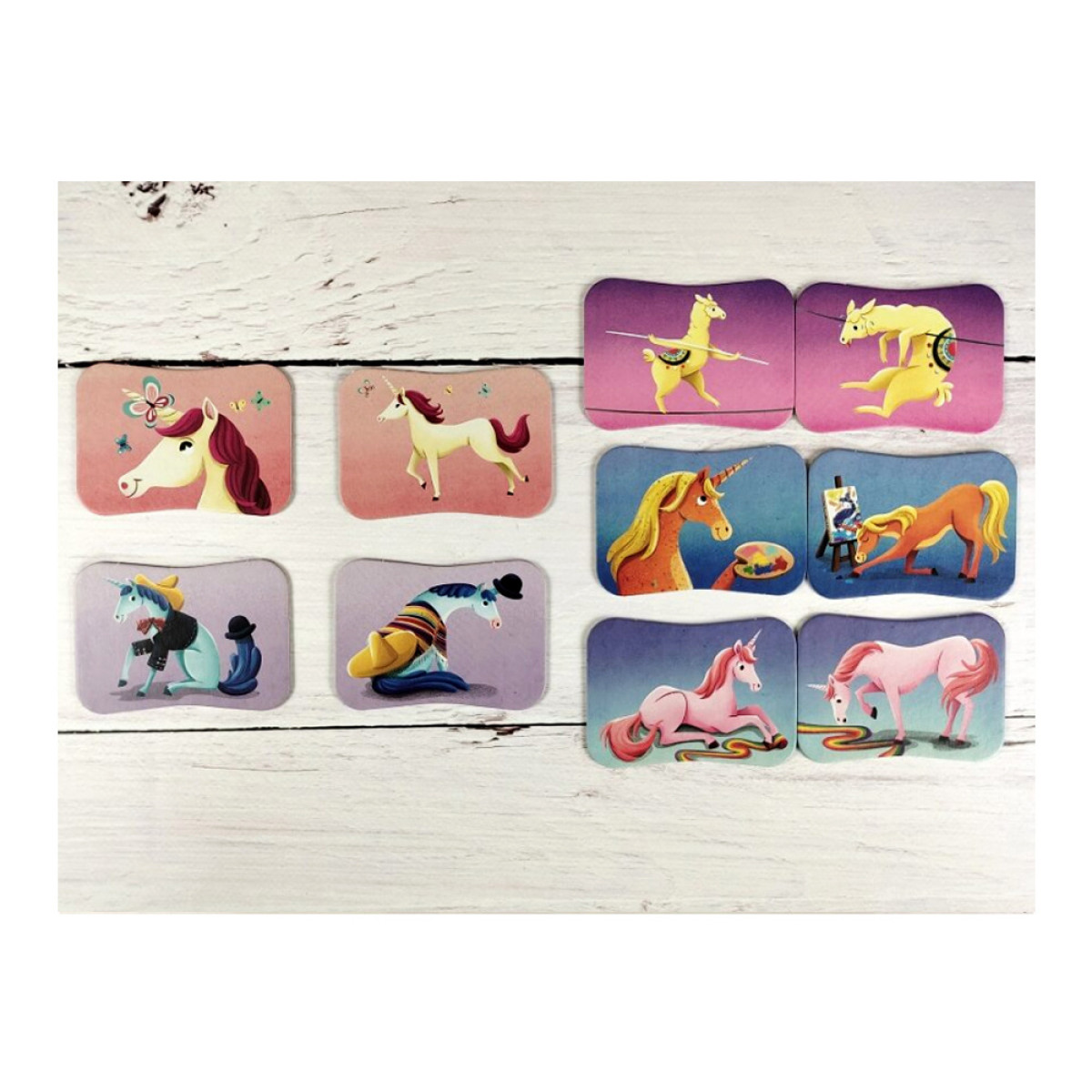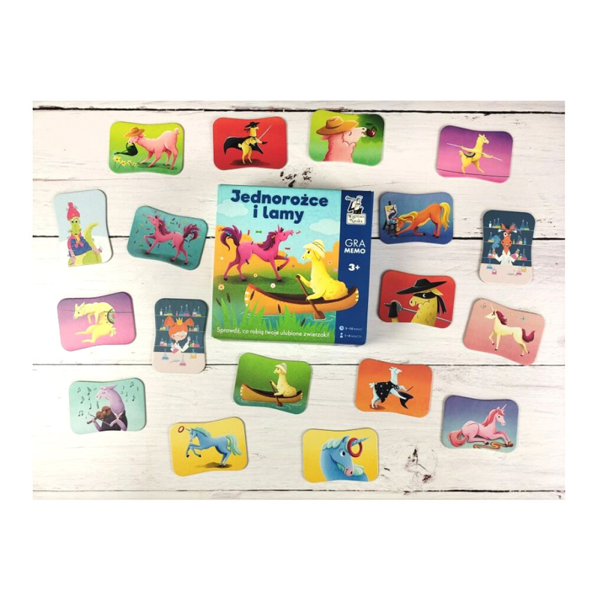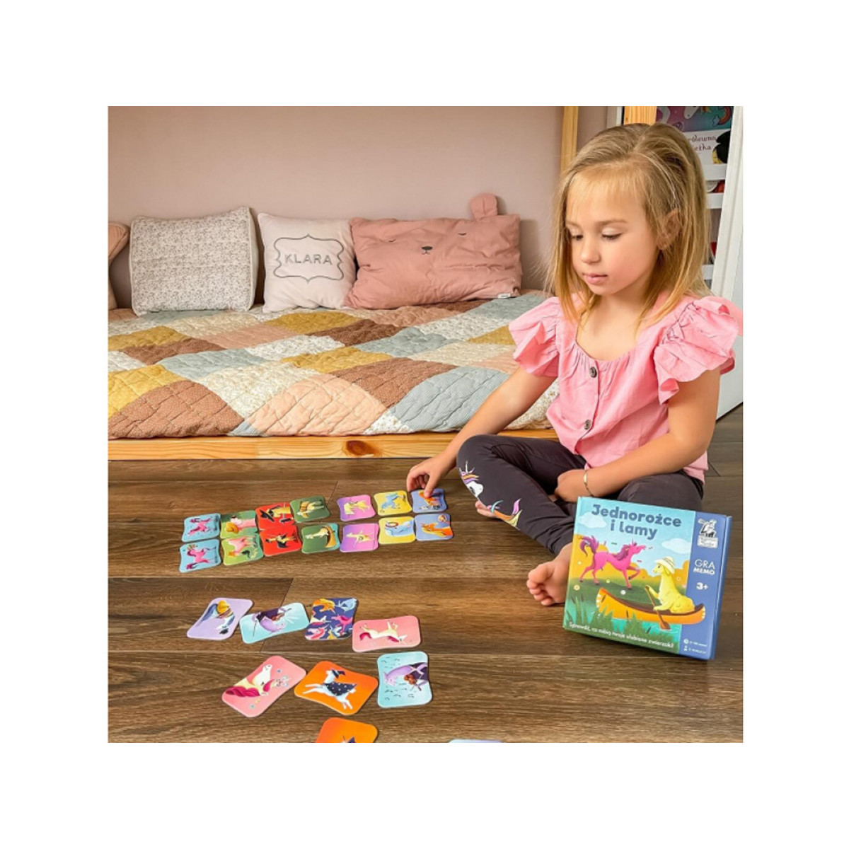 Atminties žaidimas Vienaragiai ir lamai yra puikus būdas lavinti vaikų tiesioginę atmintį, ugdyti gebėjimą lyginti duomenis, bei gerinti koncentraciją ir pastabumą.