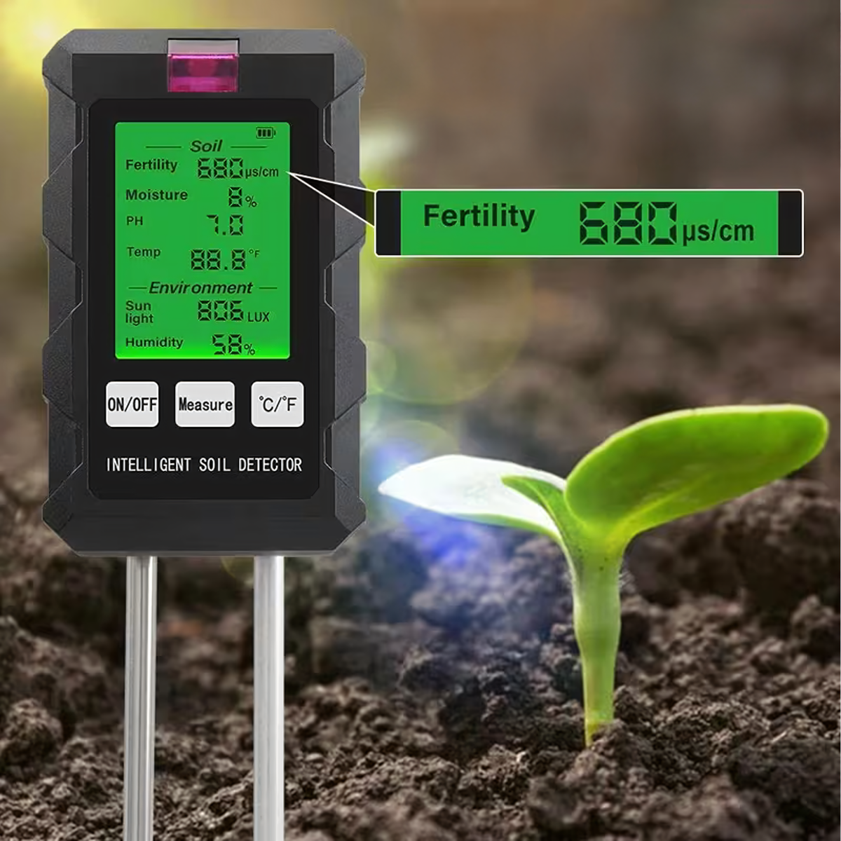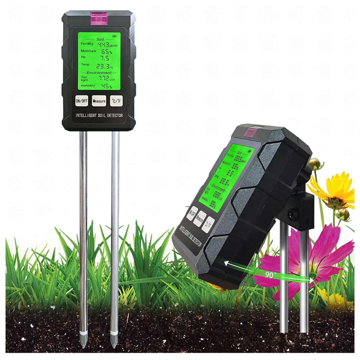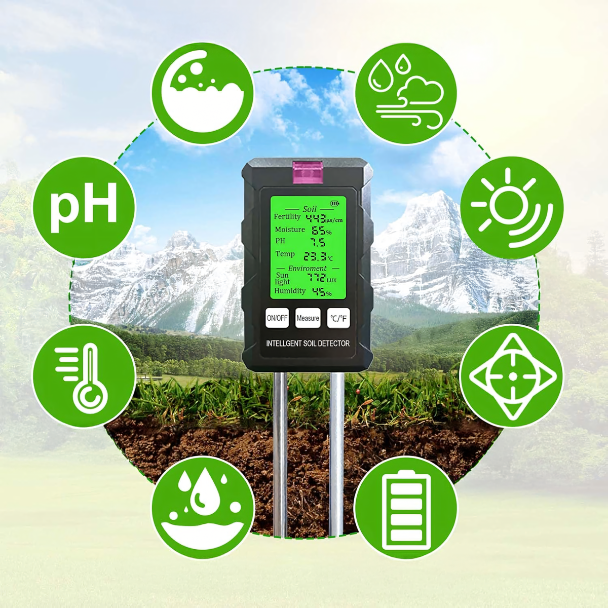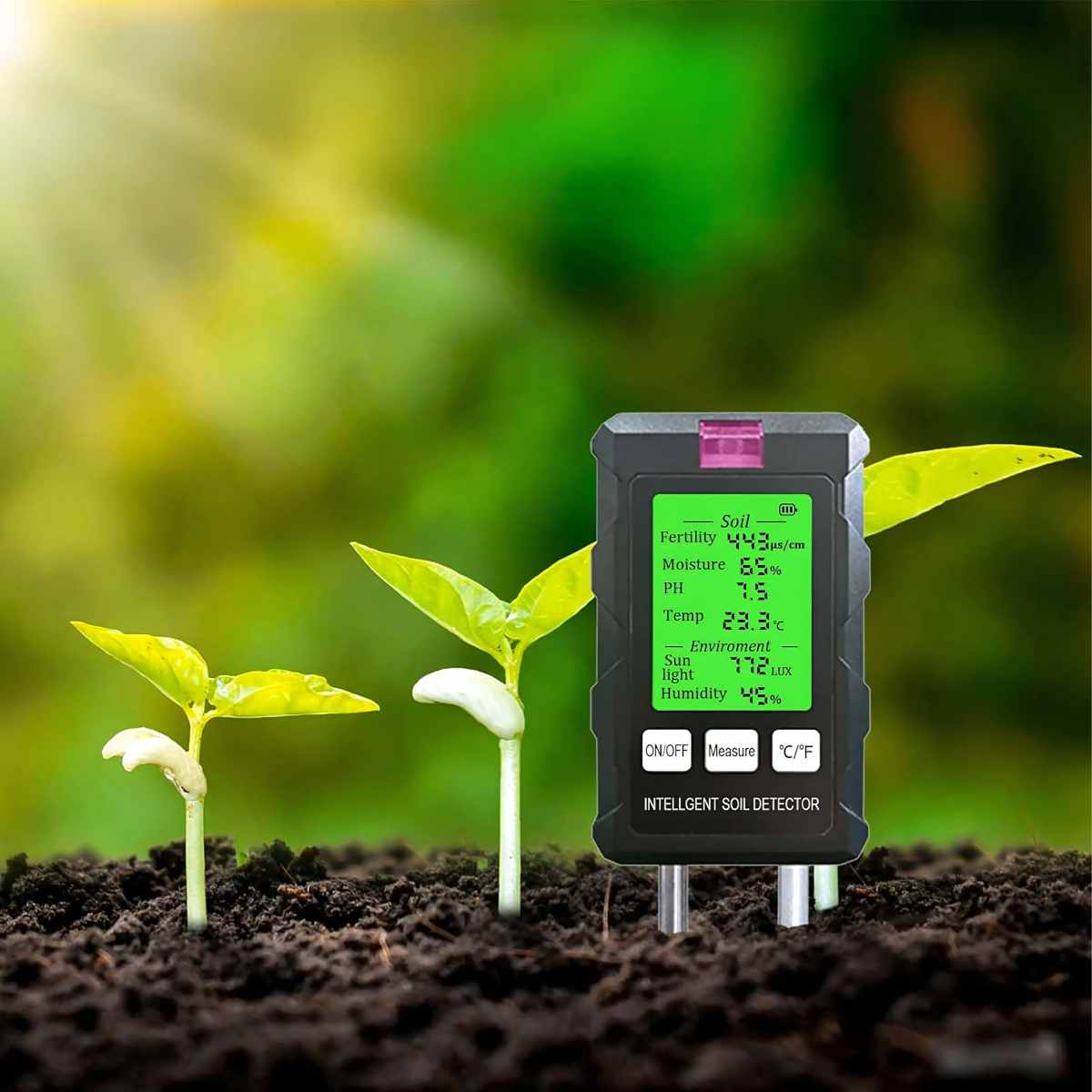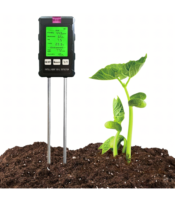 Matavimų diapazonas: pH, dirvožemio drėgmė, dirvožemio temperatūra, derlingumas, šviesa, aplinkos drėgmė