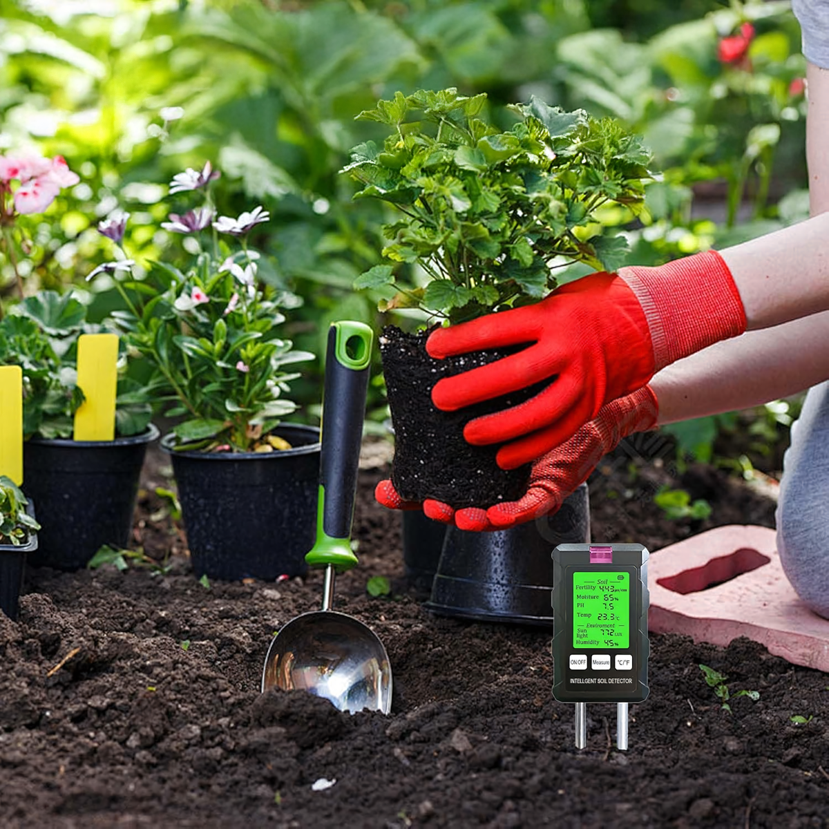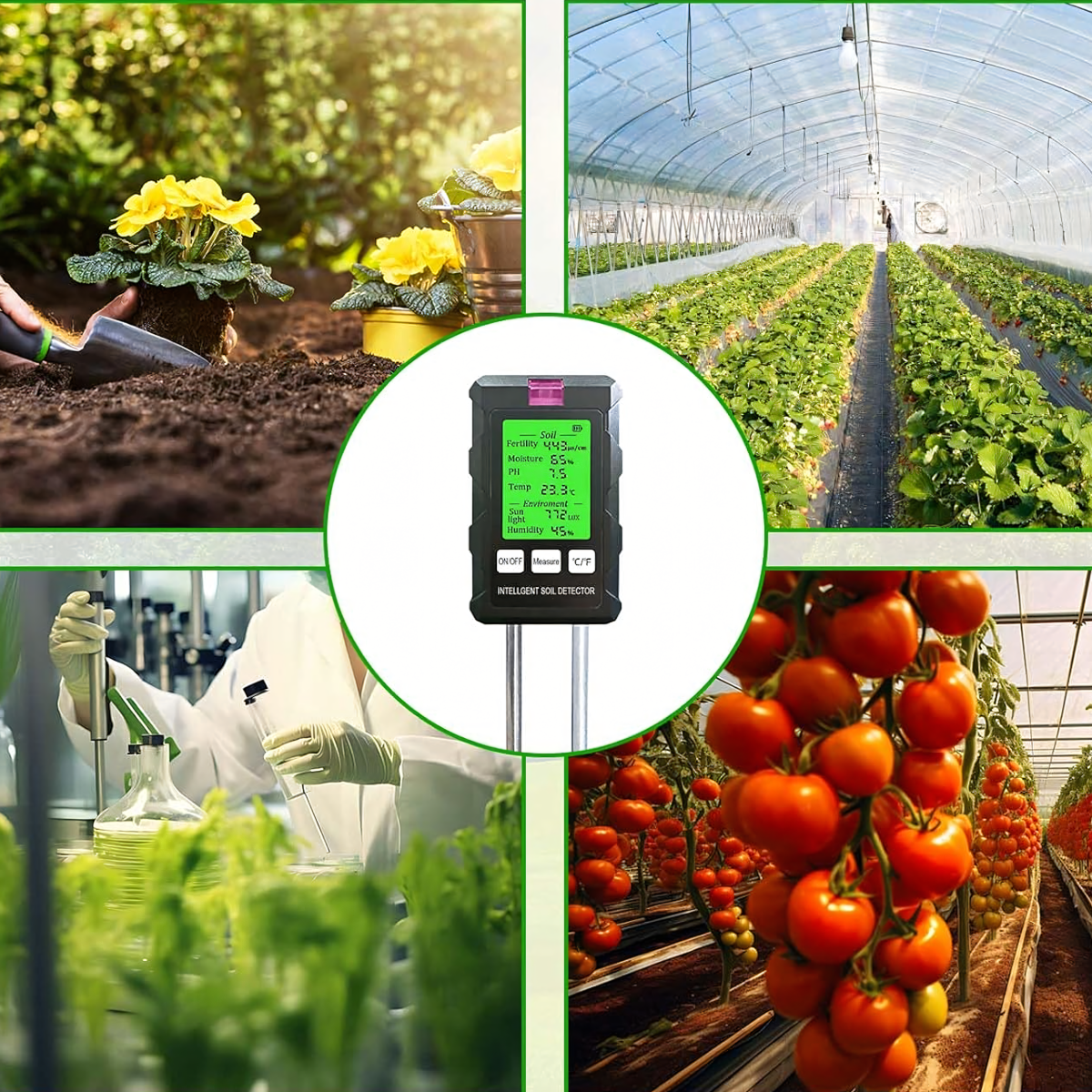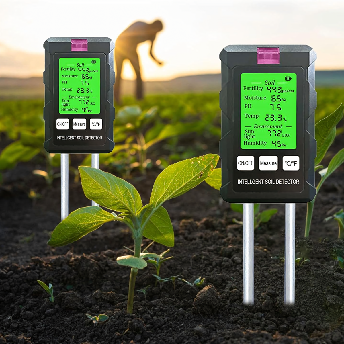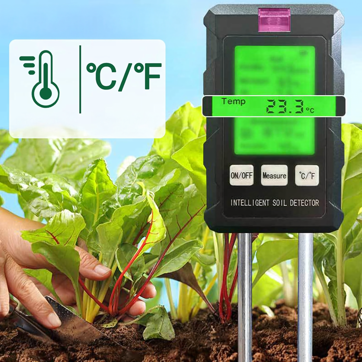 Matavimų diapazonas: pH, dirvožemio drėgmė, dirvožemio temperatūra, derlingumas, šviesa, aplinkos drėgmė