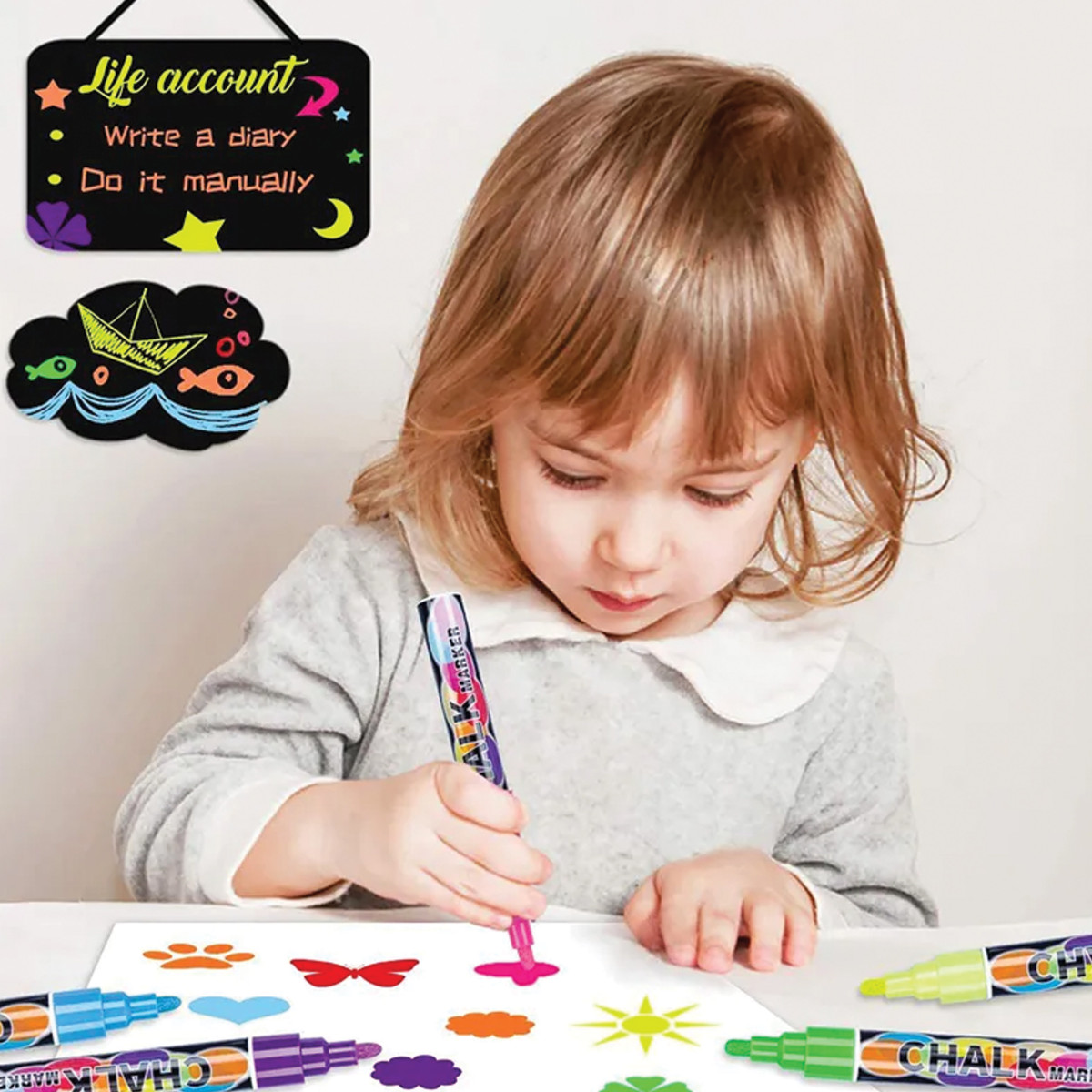 Atraskite kūrybiškumo laisvę su kreidinių markerių rinkiniu, skirtu rašymui ant lentų, stiklo, veidrodžių, metalo ar kitų lygių paviršių.