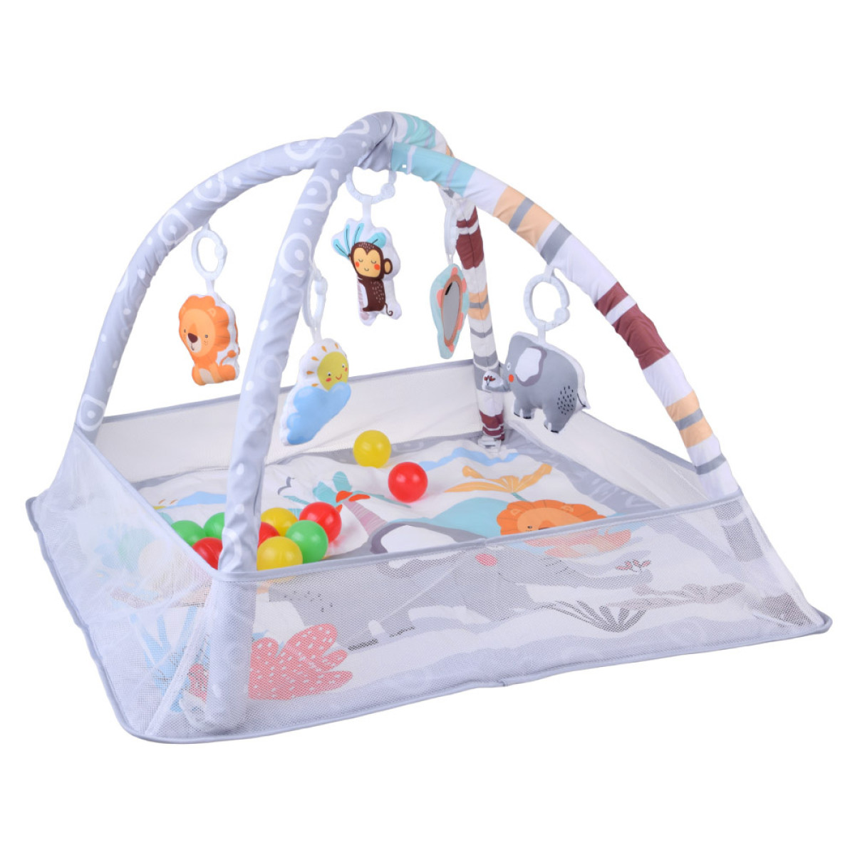 Dvi lanksčios lankstomos rankos lengvai nuimamos, todėl patogu paruošti aikštelę skalbimui, laikymui ar išvežimui į kelionę. Ant lankstų yra įvairios pakabos ir žaislai, kurie traukia vaiko dėmesį, vysto jo pojūčius bei skatina judėjimą ir aktyvumą. Tinklinės sienelės padeda išvengti kamuoliukų ir žaislų iškritimo už žaidimų aikštelės ribų.