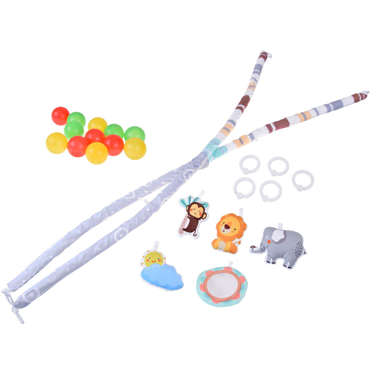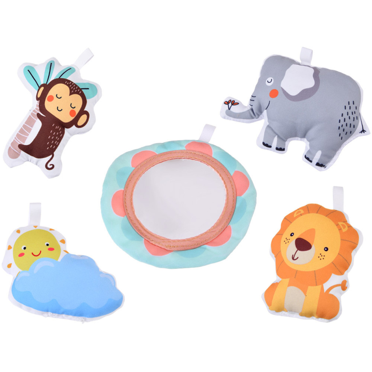 - pakabos ir žaislai (veidrodėlis, saulutė su debesimis, gyvūnų figūrėlės – liūtas, dramblis, beždžionė).
