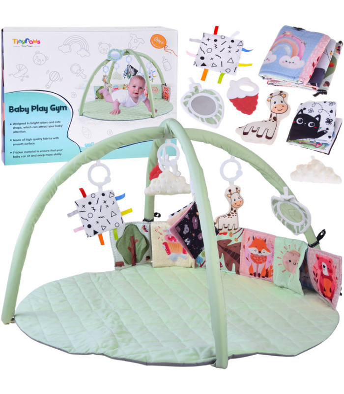 Edukacinis kūdikių kilimėlis yra puiki vieta žaidimams ir vystymuisi nuo pirmųjų vaiko dienų. Apvalus kilimėlis švelniai žalios spalvos su kontrastingais elementais yra sukurtas tam, kad skatintų vaiko regos, klausos, lytėjimo ir koncentracijos vystymąsi.