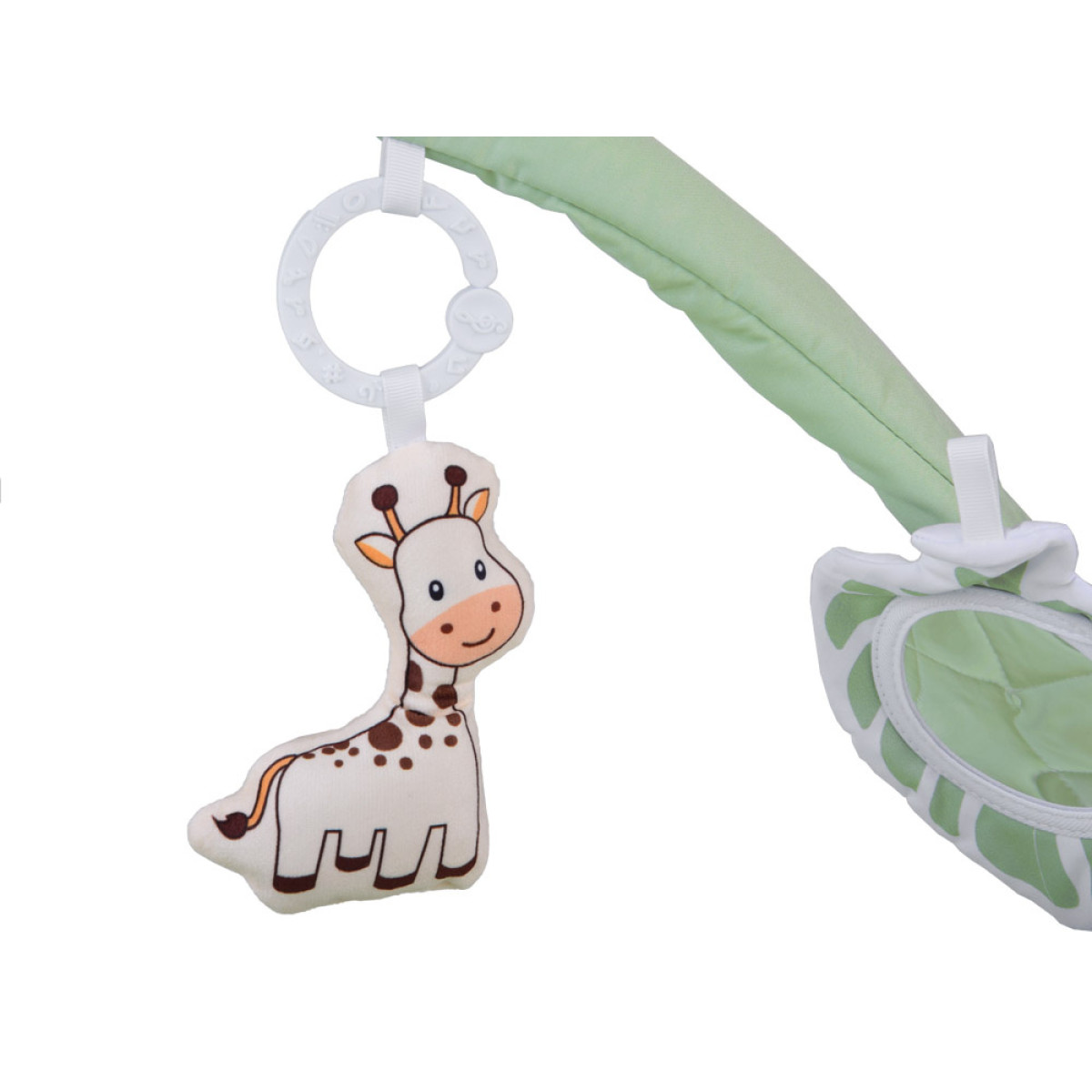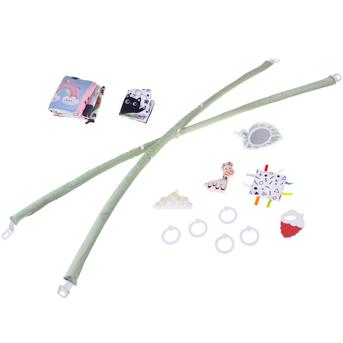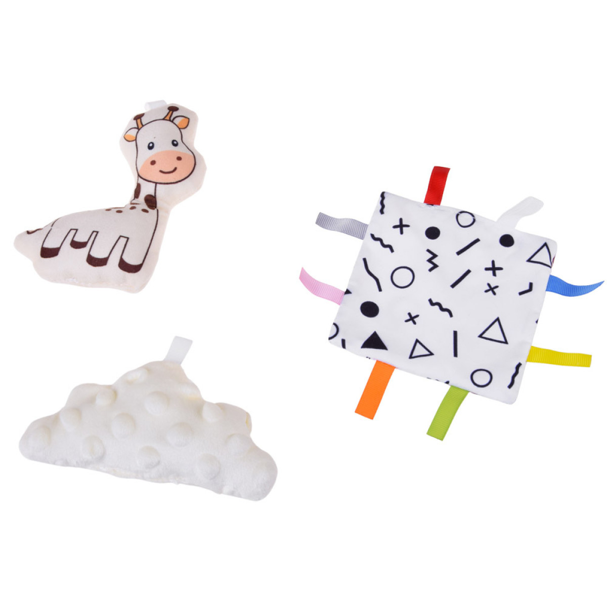 • Pakabinami žaislai: kramtukas, pliušinis gyvūnas žirafa, minkštas minky audinio debesėlis, saugus veidrodėlis, kontrastinga knygelė, šiugždantis žaislas su etiketėmis
