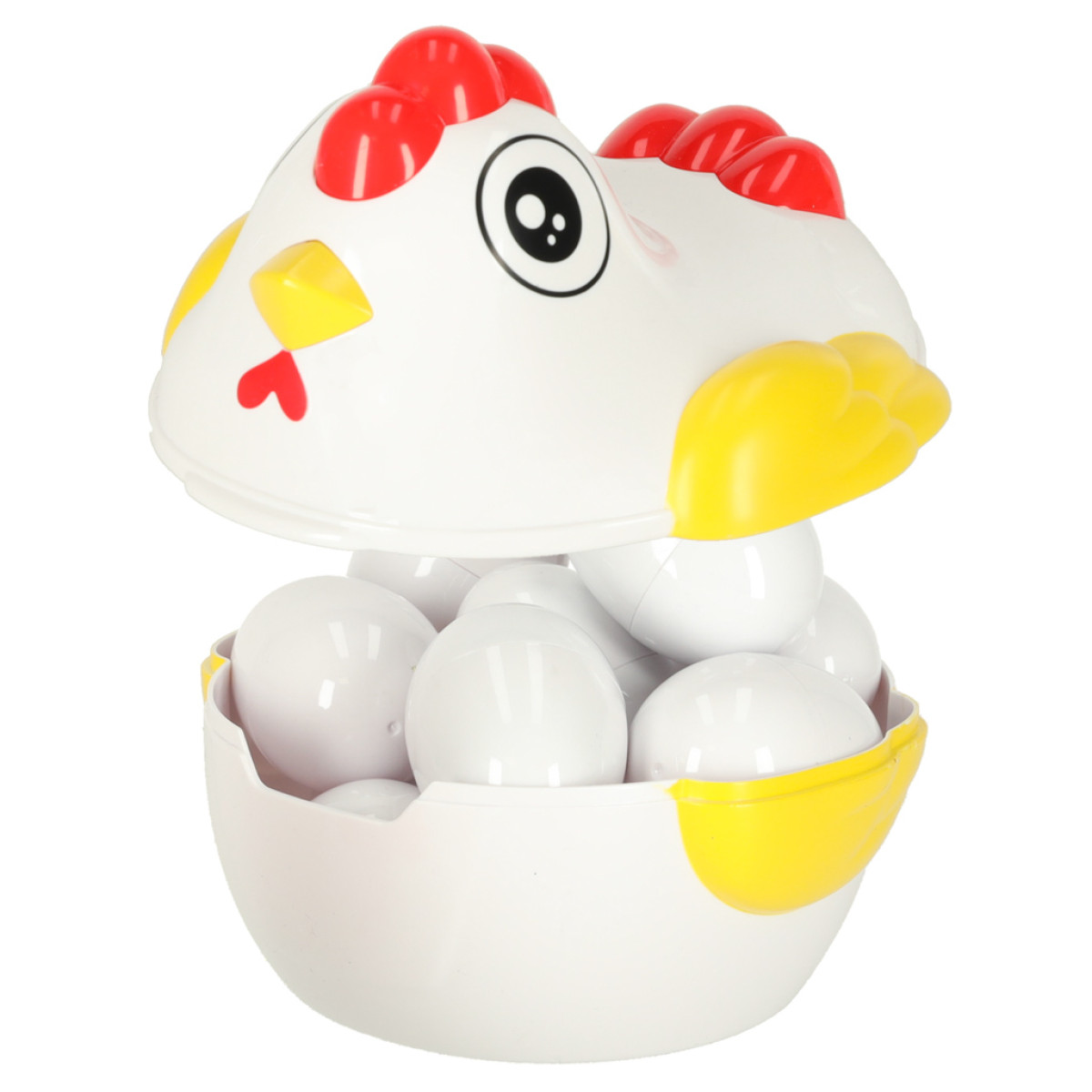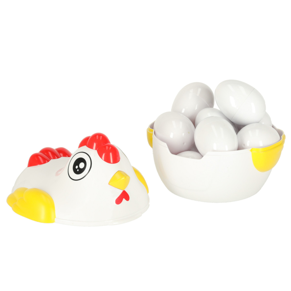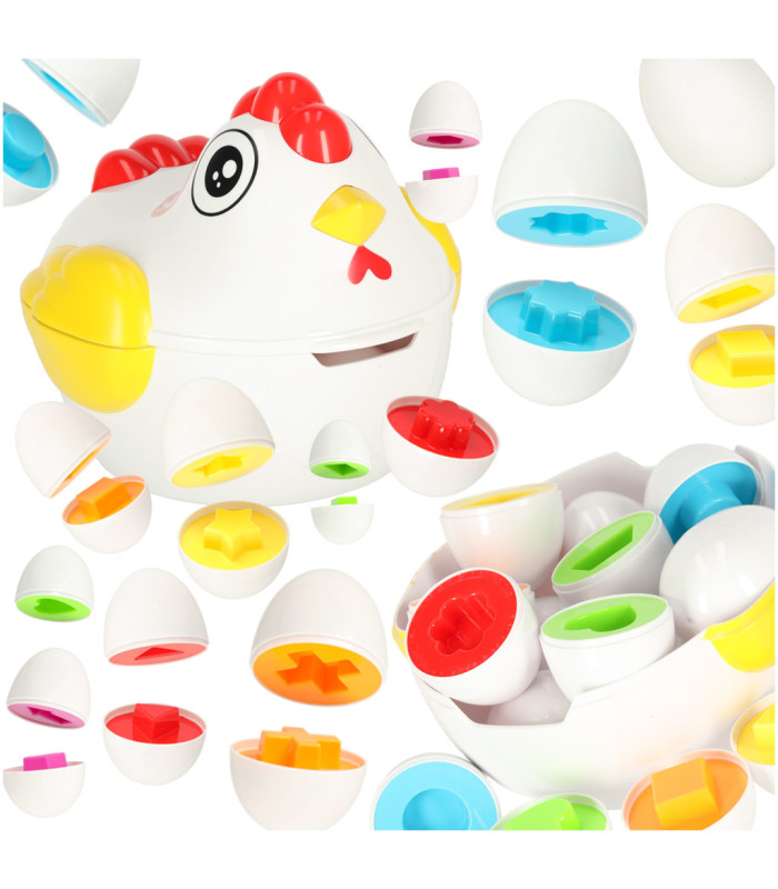 Vištos viduje yra paslėpti 12 plastmasinių kiaušinių, kuriuos galima atidaryti ir vėl sudėti. Kiekvieno kiaušinio viduje yra forma, kuri tinka tik vienai konkrečiai pusei. Vaiko užduotis yra išsklaidyti kiaušinius, juos atidaryti ir surasti tinkamas poras, derinant pagal formą ir spalvą.
