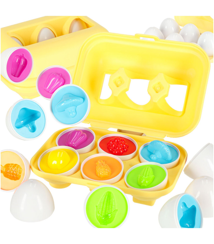 Tai nėra paprasti kiaušiniai. Tai rūšiuoklė, dėlionė, logikos mokykla ir spalvų viename žaisle. Šis naujoviškas edukacinis žaislas yra idealus būdas mokytis per žaidimą nuo pat mažens. Vaikas mokosi spalvų atpažinimo ir formų derinimo, tuo pačiu vystydamas koncentraciją ir logišką mąstymą. Spalvingi kiaušiniai su paslėptais vaisių motyvais palaiko formų mokymąsi ir spalvų mokymąsi malonios dėlionės forma. Žaislas stimuliuoja pažintinių įgūdžių vystymą ir skatina savarankišką veikimą. Tai puikus pasirinkimas tėvams, kurie nori įvesti vaikams mokymąsi atpažinti įvairias formas natūraliu ir įdomiu būdu.