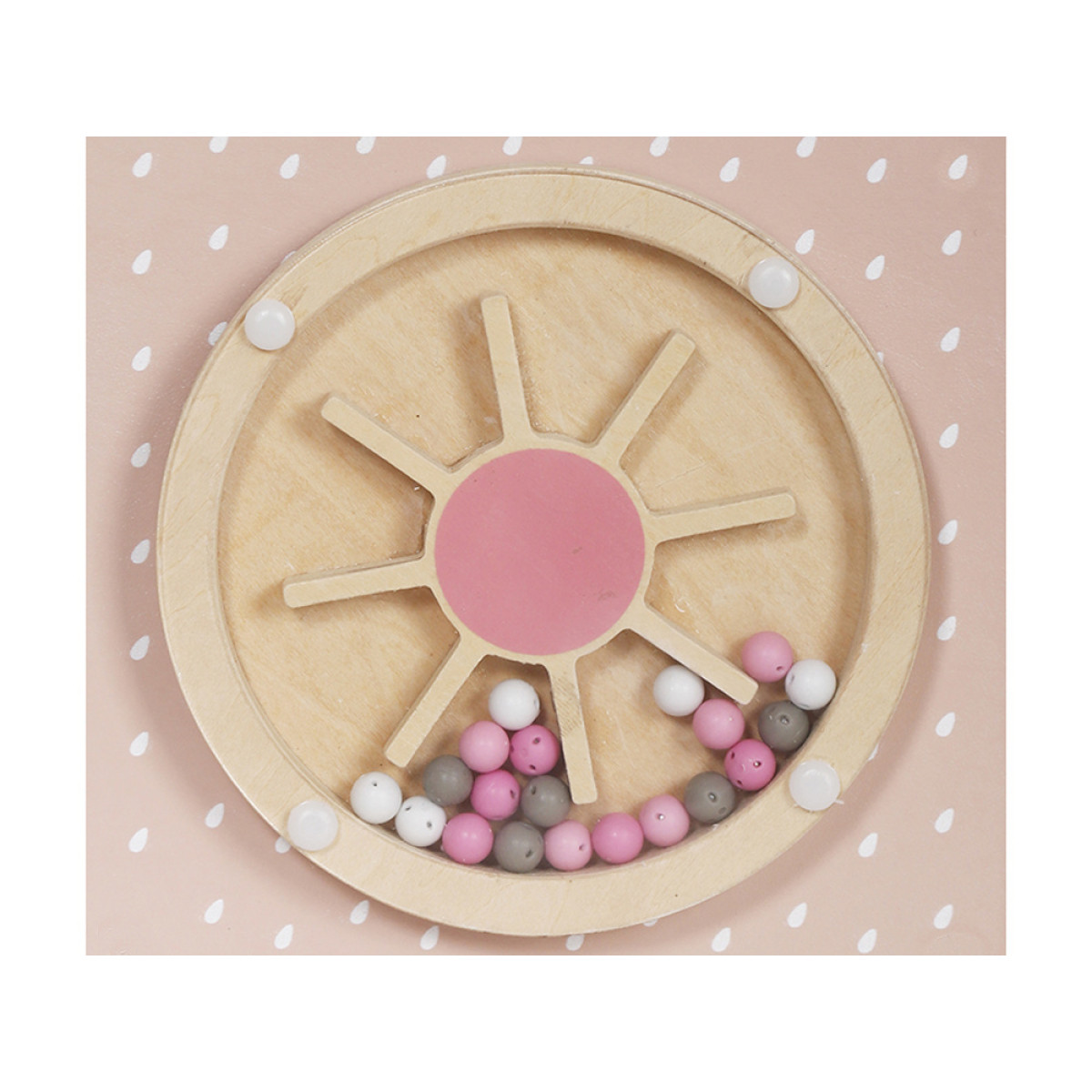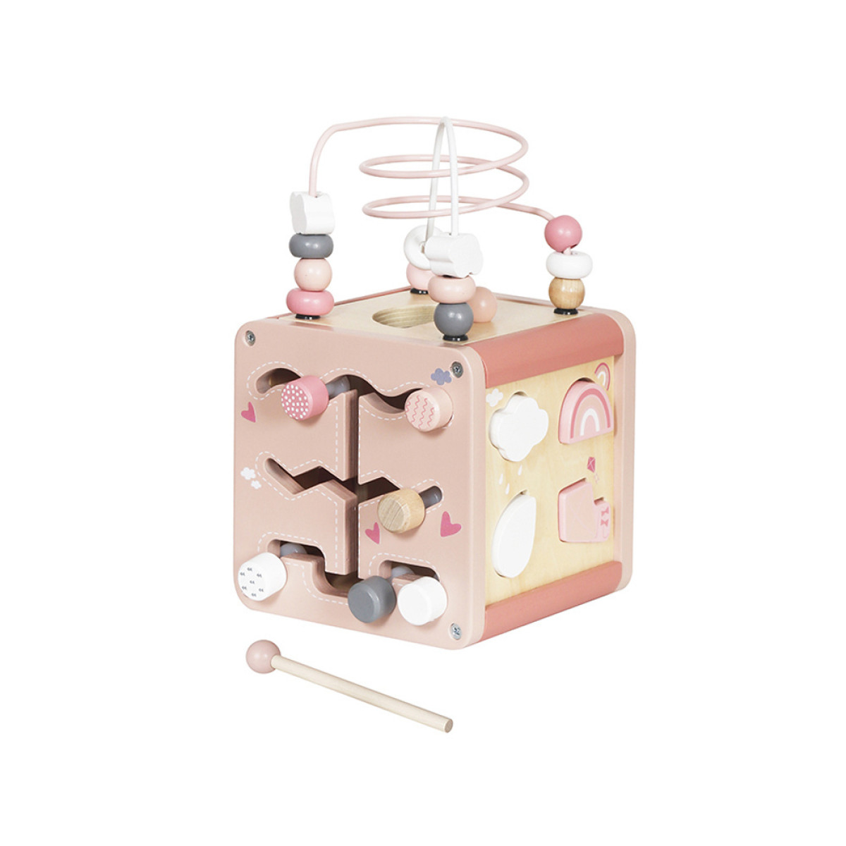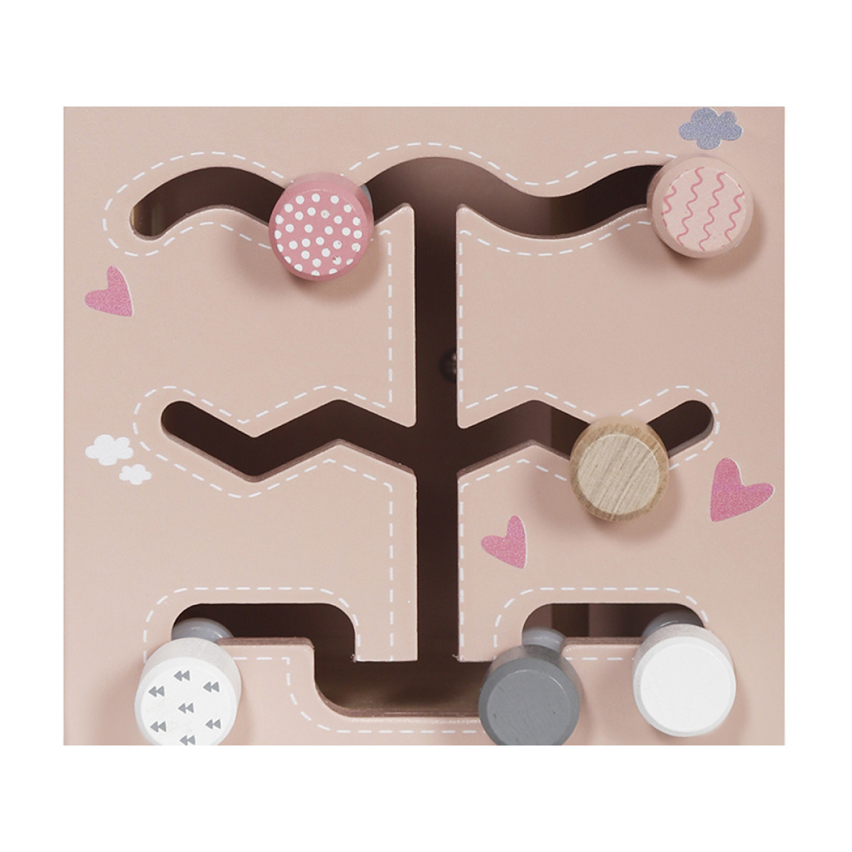 • Viršutinė dalis: Kubo viršuje yra karoliukų kelias ant vielinių kilpų, kuris padeda vaikui lavinti tikslius rankų judesius ir koncentraciją.