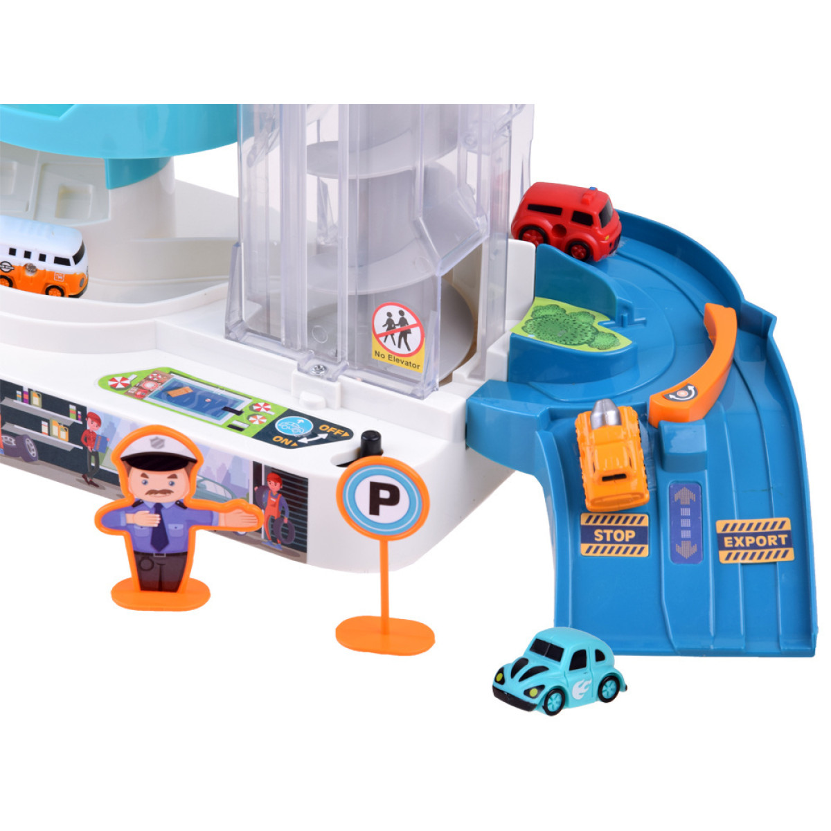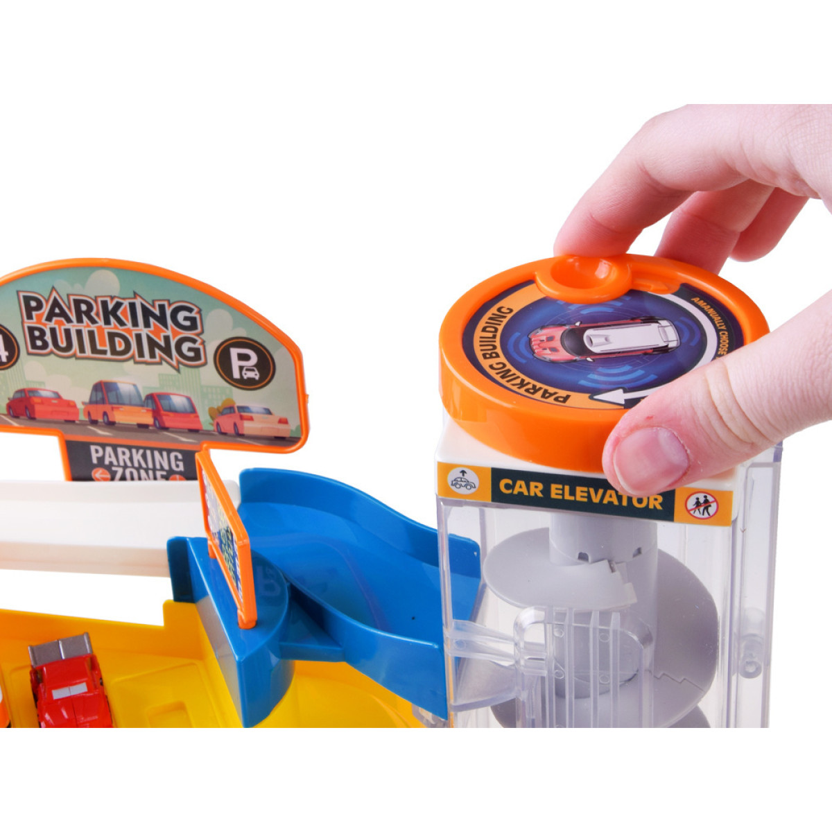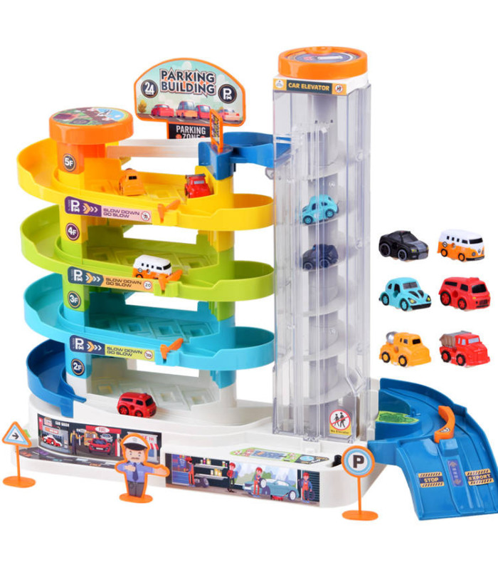 Žaislinis keturių aukštų automobilių garažas su elektriniu liftu