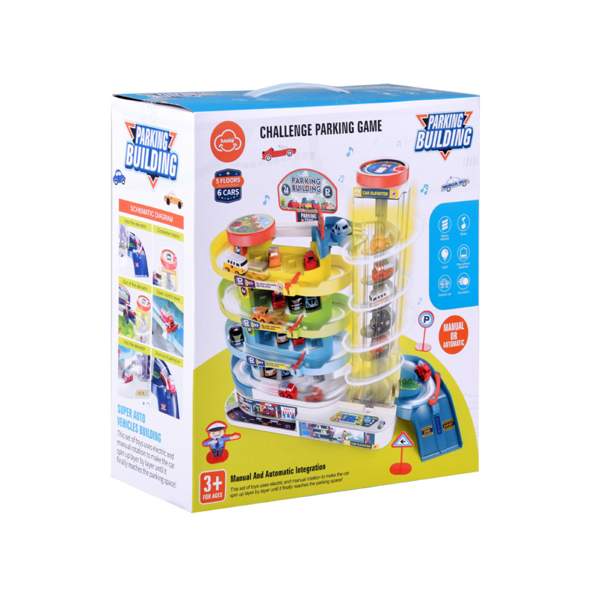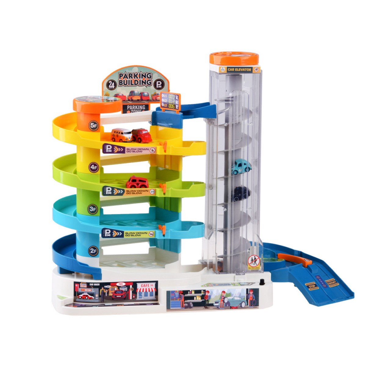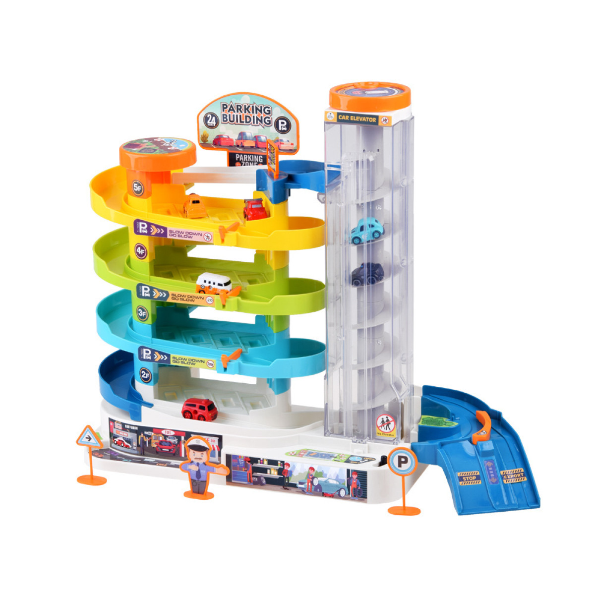 Žaislinis keturių aukštų automobilių garažas su elektriniu liftu