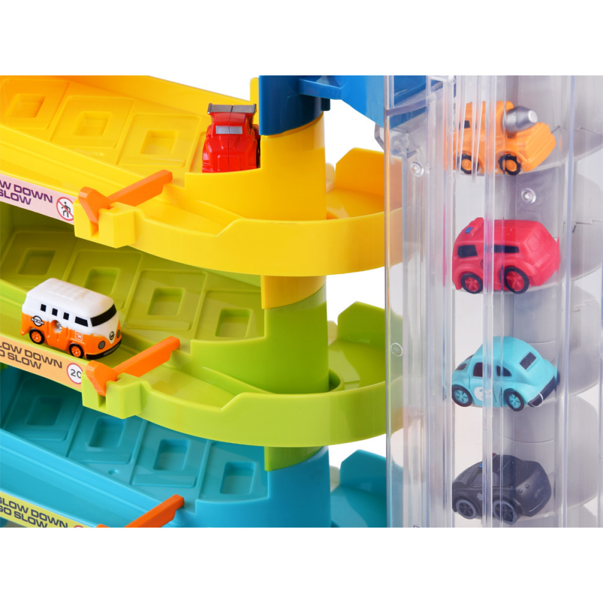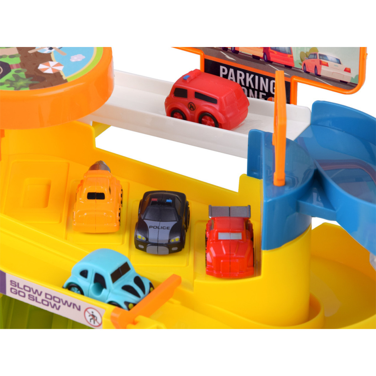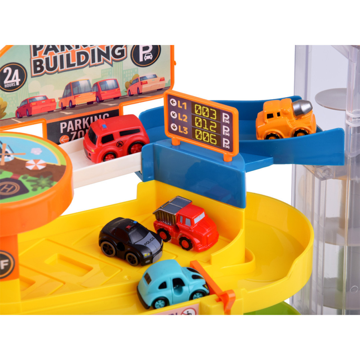 Šis automobilių garažas tikrai patiks visiems keturių ratų entuziastams. Žaislas susideda iš keturių aukštų su keturiais parkavimo vietomis kiekviename aukšte. Garažas taip pat turi helikopterio nusileidimo aikštelę. Tačiau didžiausias traukos objektas yra elektrinis liftas, kuris leidžia greitai perkelti automobilį iš pirmo aukšto į viršutinį.