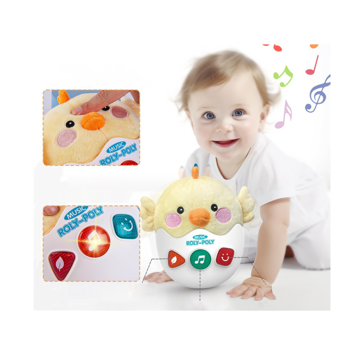 Be to, žaislo gale yra jungiklis, kuriuo įjungiamas muzikinis dėžutė. Jau įjungiant girdėti maloni trumpa melodija. Mygtukai šviečia melodijos ir garsų ritmu, tiek paspaudus, tiek įjungus žaislą.