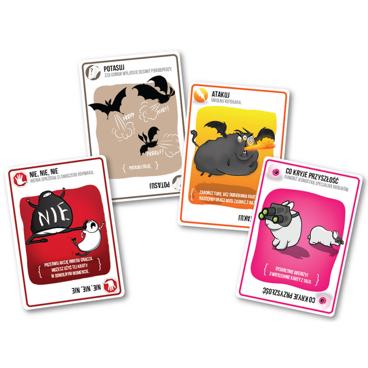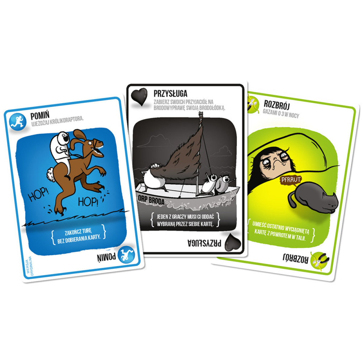 - Daug juoko ir emocijų: Žaidimas pilnas netikėtų posūkių, kurie sukelia daugybę emocijų. Momentas, kai kažkas traukia sprogstantį kačiuką, visada sukelia juoko bangą. Be to, specialios kortos leidžia protingai apgauti likimą, todėl žaidimas yra pilnas įtampos.