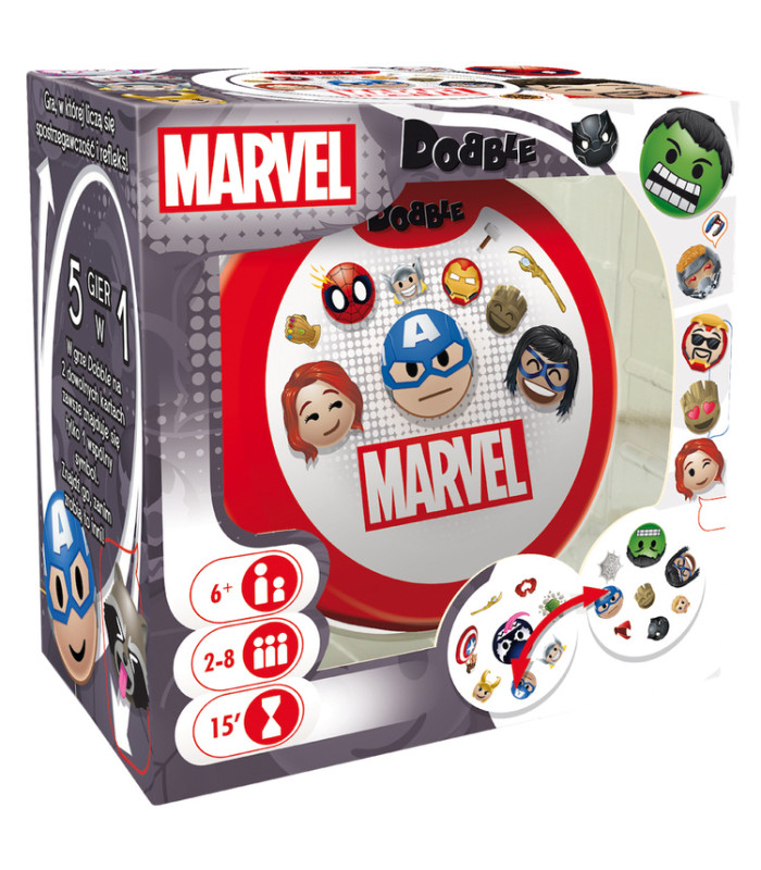 Susipažinkite su mėgstamais Marvel herojais - Hulk, Loki, Ant-Man ir daugeliu kitų dinamiškame stalo žaidime, kuris patikrins jūsų refleksus ir pastabumą. Dobble: Marvel Emoji - tai kortų žaidimas, kuriame kiekviena kortų pora turi tik vieną bendrą simbolį. Jūsų užduotis - rasti jį greičiau nei kiti žaidėjai!