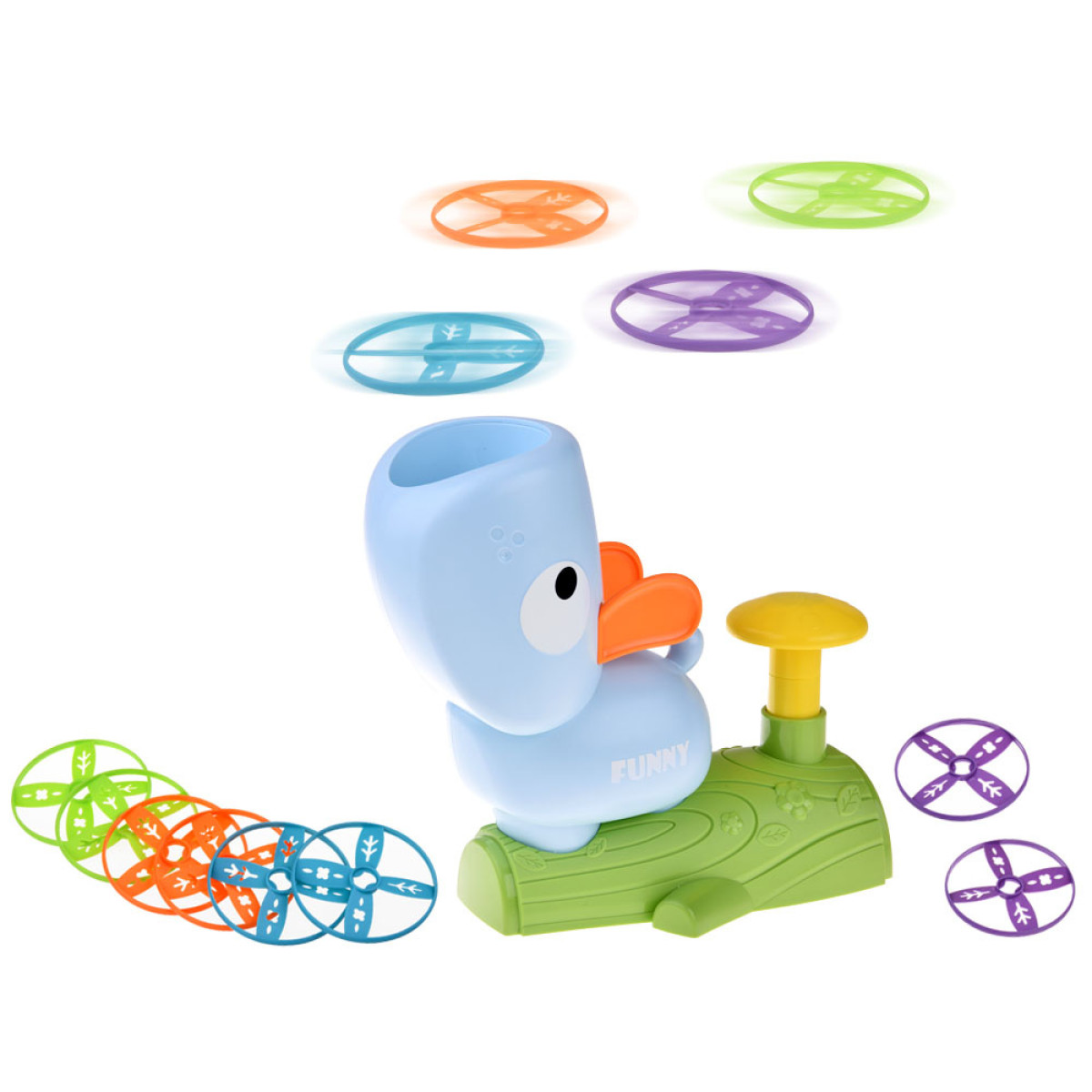 Diskų išmetimo žaidimas su mielu šuniuku skatina bendrą žaidimą. Žaislas pagamintas iš aukštos kokybės plastiko, malonių akiai spalvų.