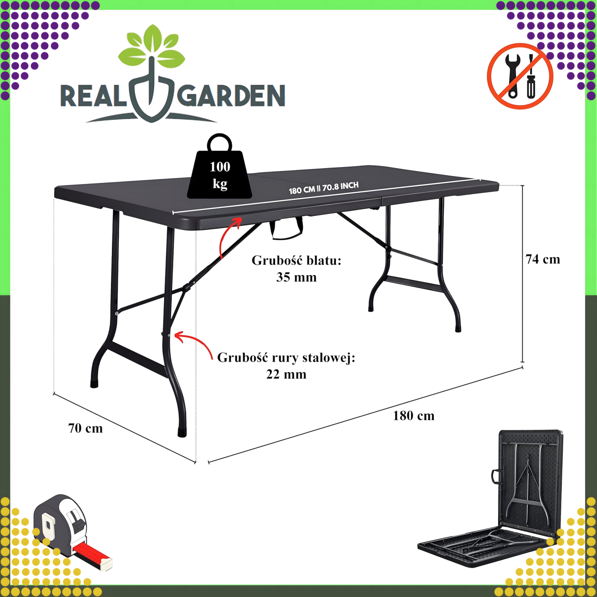 Juodas sulankstomas stalas 180 x 74 x 74 cm yra didelis ir stabilus. Jo stalviršis pagamintas iš kieto plastiko, kas palengvina priežiūrą. Stalčio plieninės kojos turi apsaugą nuo sulankstymo po maisto ir gėrimų svoriu. Kai jo nenaudojate ar norite pervežti, jis virsta lagaminu. Šio išradingo dizaino stalo kojos paslėptos viduje. Rankena padės patogiai nešioti.
