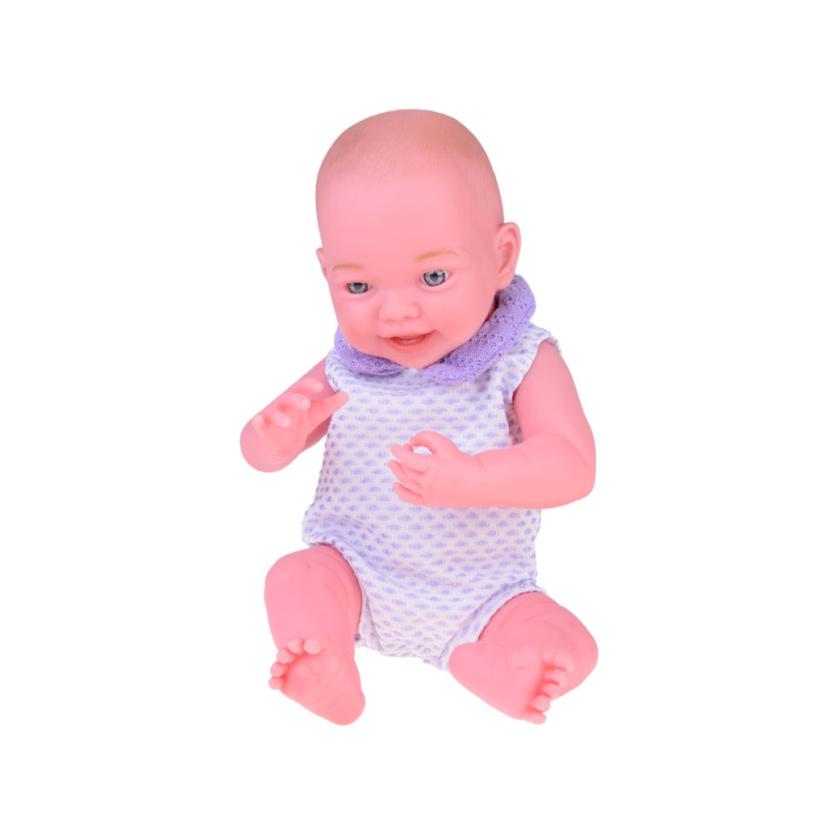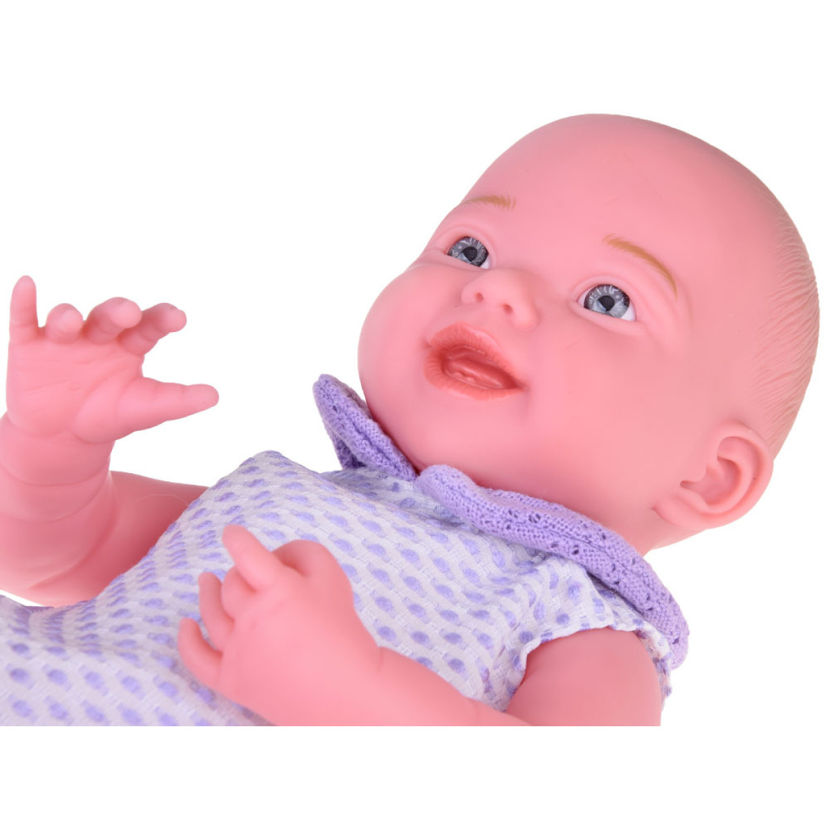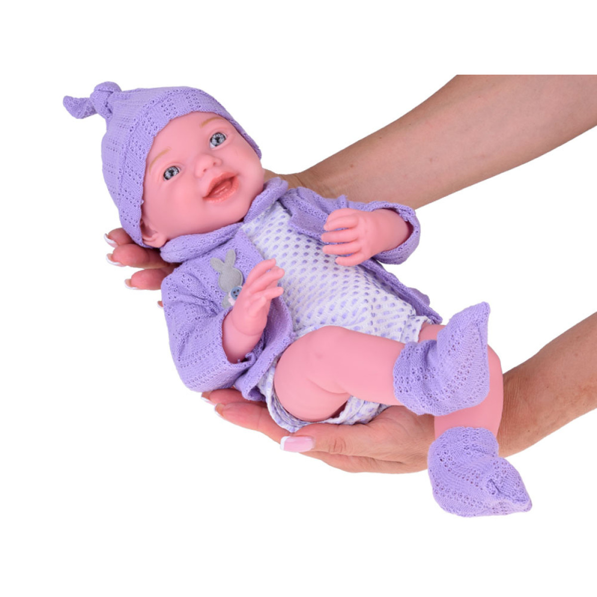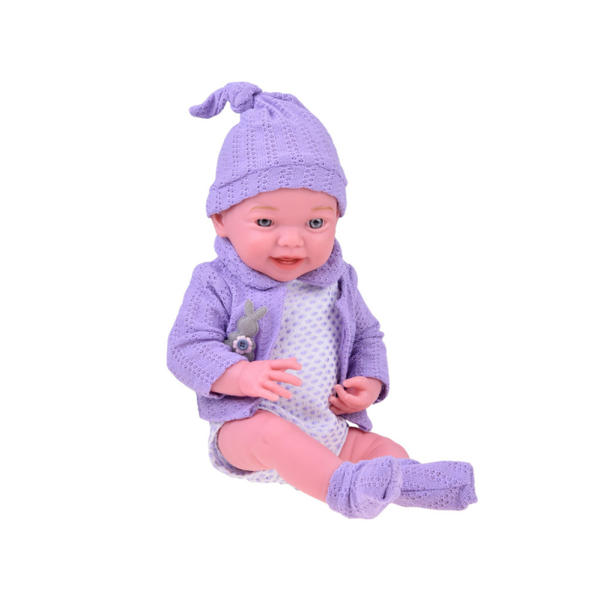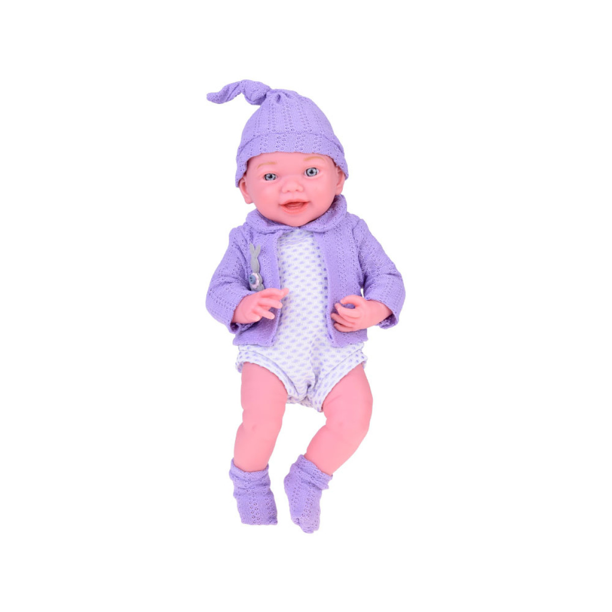 Besijuokiantis kūdikis su violetiniu megztuku ir kepure - tai nuostabaus kūdikio atspindys, kuris privers jūsų vaiką nusišypsoti. Lėlė yra apsirengusi bodžiu, megztuku, kojinėmis ir kepure. Violetinis megztukas kartu su kepure ir kojinėmis puikiai dera su šviesiu bodžiu su violetiniais taškeliais. Drabužiai kruopščiai atlikti su dideliu dėmesiu detalėms, kas dar labiau pabrėžia šios ypatingos žaislo realizmą ir žavesį. Lėlė turi judančias galūnes.