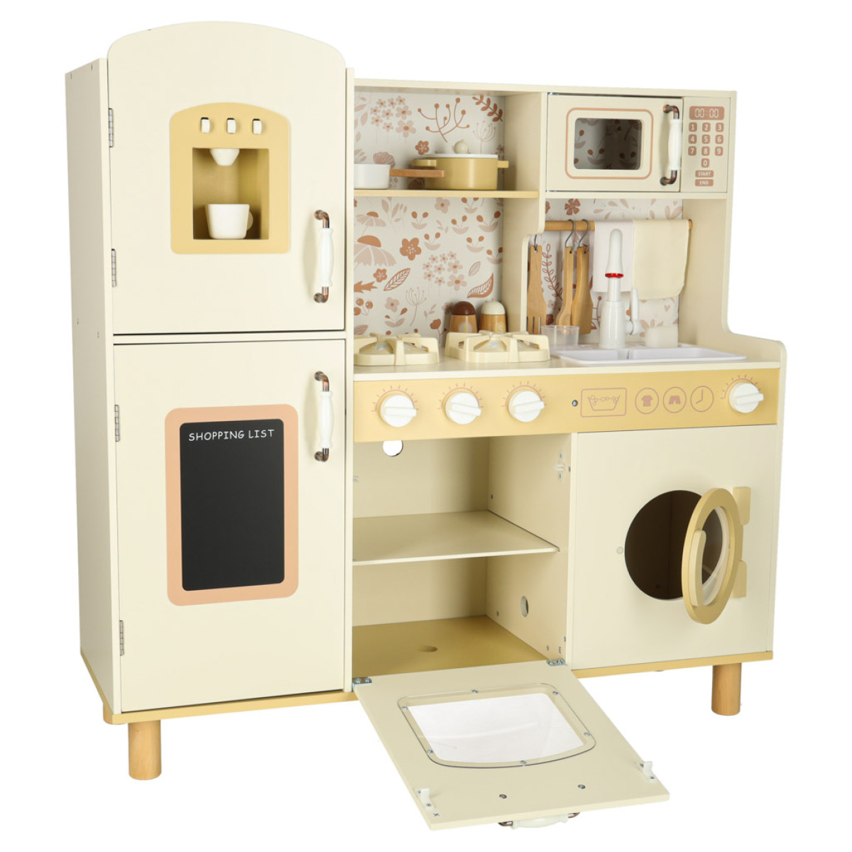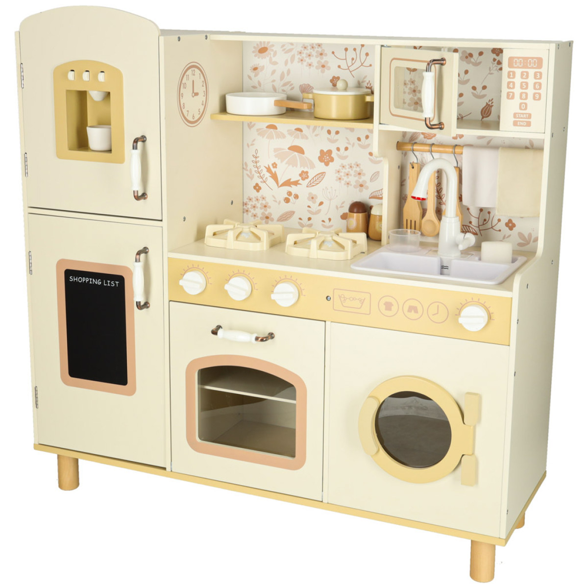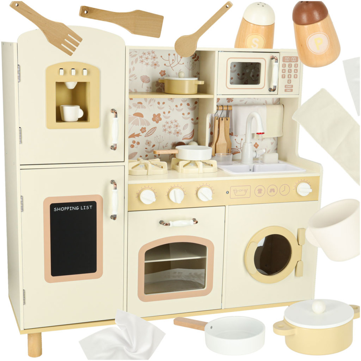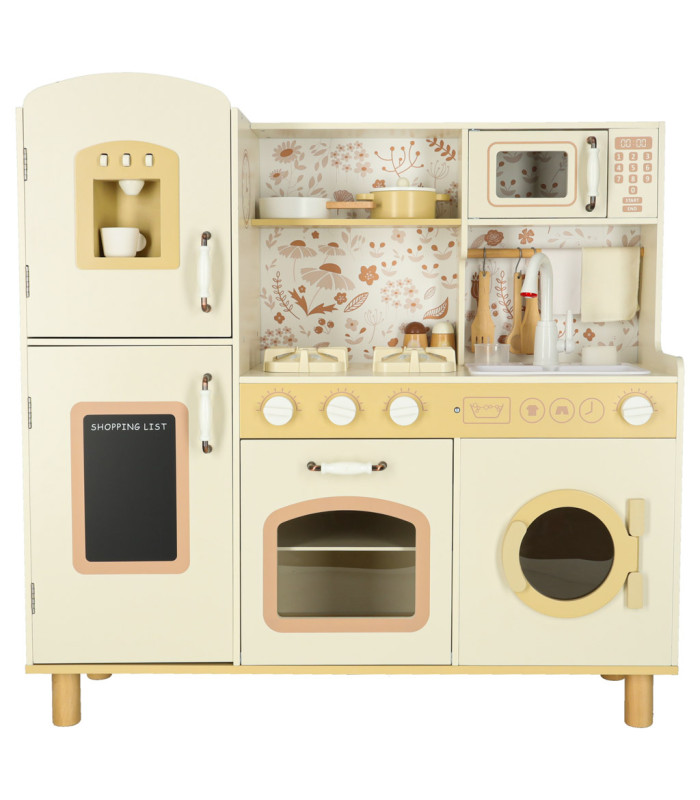 Kartu su medine vaikų virykle rasite priedus, tokius kaip: puodelis, puodas, keptuvė, virtuviniai įrankiai, druskinė ir pipirinė, taip pat skalbimo mašina, mikrobangų krosnelė, orkaitė, kriauklė su vandens pilstymo funkcija ir spintelės daiktams laikyti. Dėl to kūrybiškas žaidimas tampa kasdienybe, o vaikas mokosi laisvai judėti ir tvarkytis savo virtuvės erdvėje.