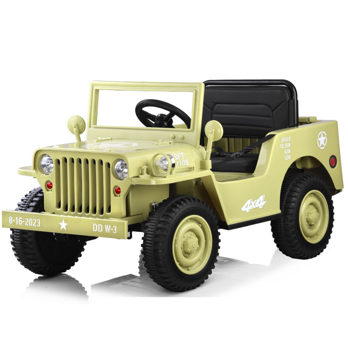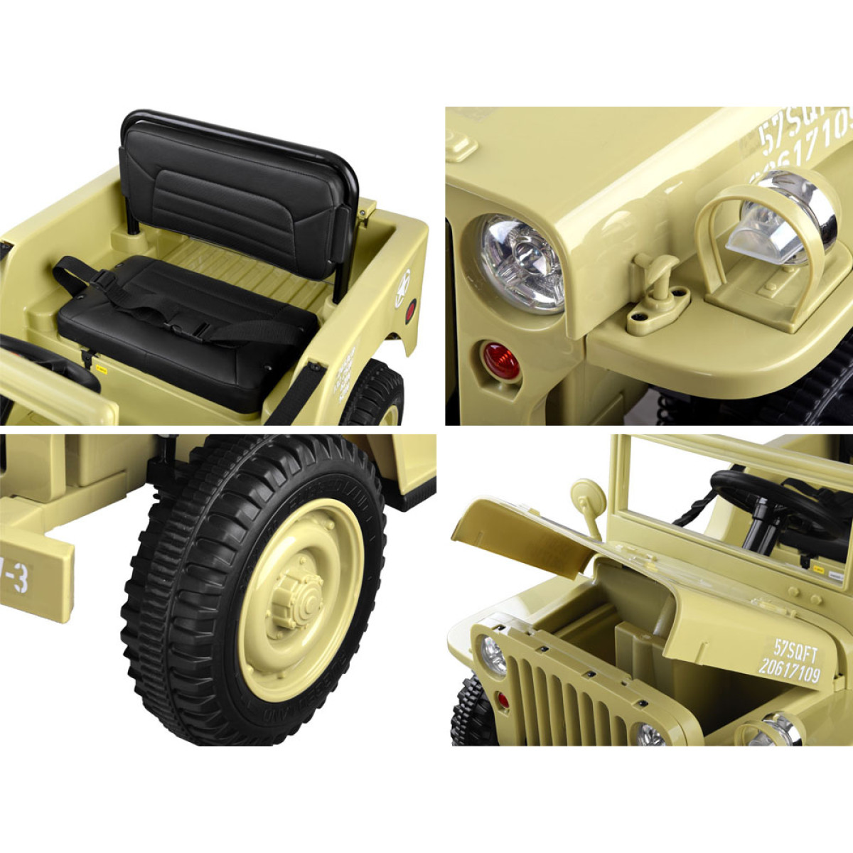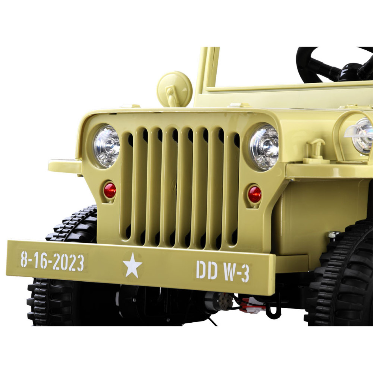 Karinis visureigis - puiki dovana vaikams, besidomintiems karine tematika. Šis galingas, retro stiliaus džipas yra paruoštas visiems kariniams iššūkiams. Jame yra visi būtini priedai ir sustiprinimai: bagažinė, kastuvas, garso ir šviesos efektai, patogi sėdynė ir saugos diržai. Automobilis gali būti valdomas pultu arba savarankiškai.