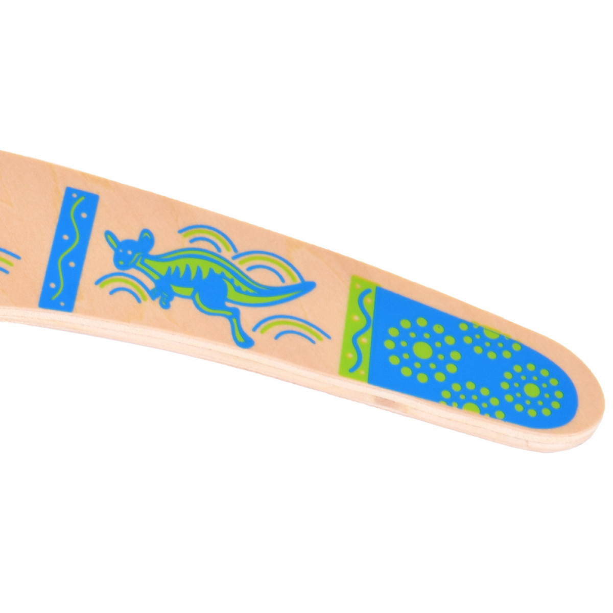 - Konstrukcija: Bumerangas turi būdingą "V" raidės formą. Jis pagamintas iš lengvo, bet patvaraus medžio, puoštas spalvingais piešiniais, vaizduojančiais šokinėjantį kengūrą, kas suteikia jam vizualinį patrauklumą.