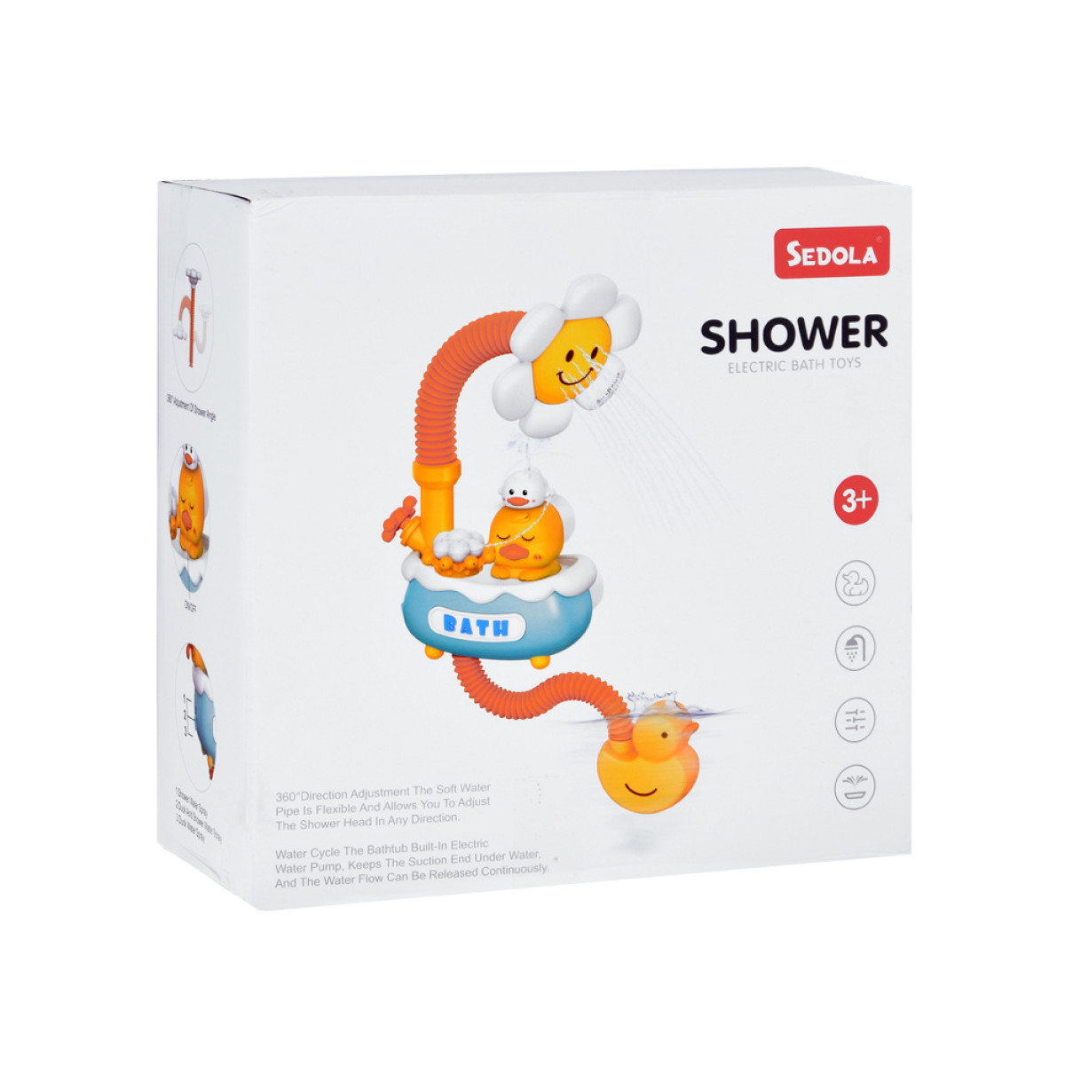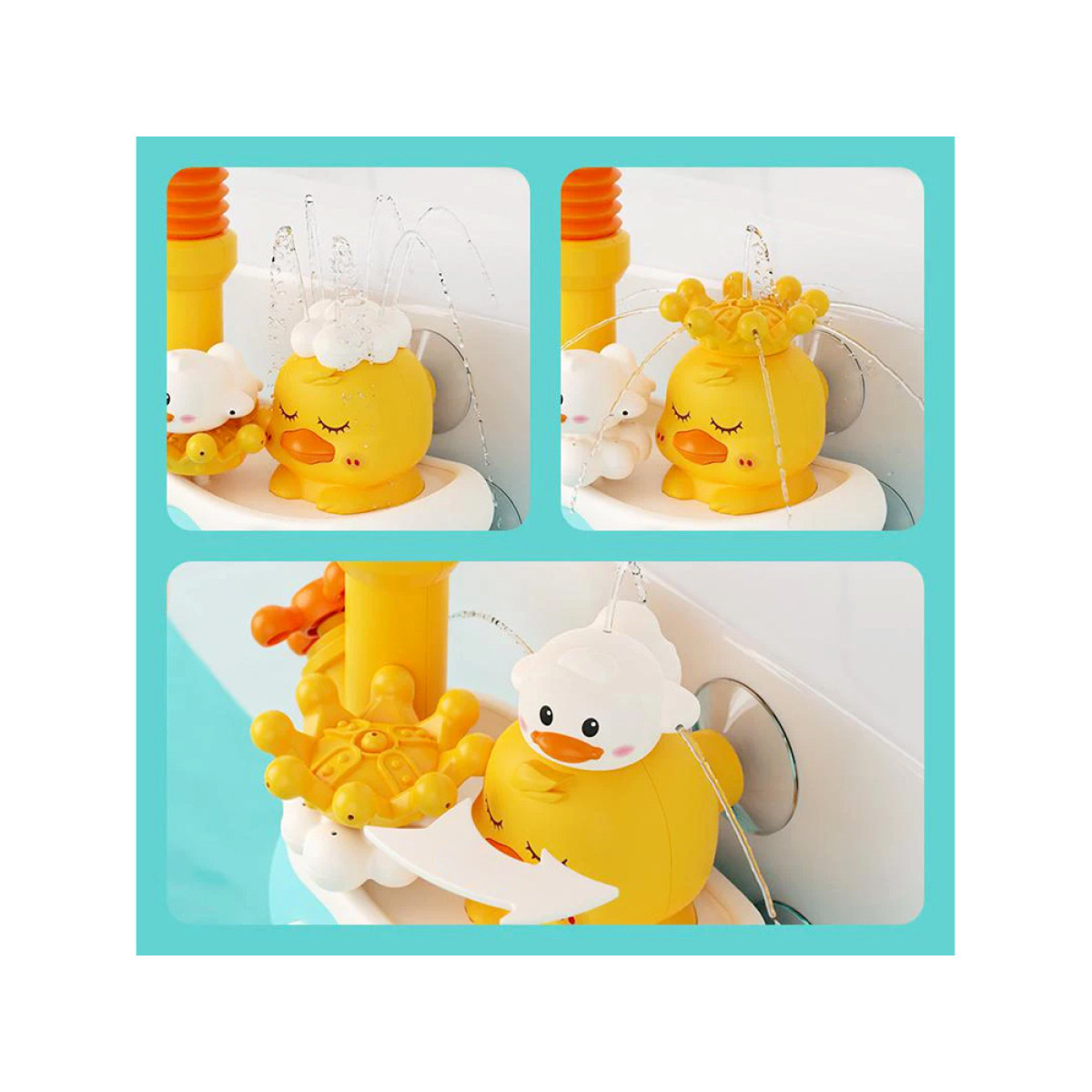 Ančiukas pompa yra žaislo apačioje, kurią reikia panardinti į vandenį. Paleidus pompą, ji siurbia vandenį ir išpurškia jį iš dušo, kuris yra gėlės formos, sudarydamas švelnią ir saugią vandens srovę. Lanksti žarna leidžia nustatyti dušo kryptį bet kuria kryptimi. Be to, ančiukas turi tris skirtingus galvos dangtelius, kurie uždėjus ant ančiuko galvos, sukurs įvairias vandens srovės kombinacijas.