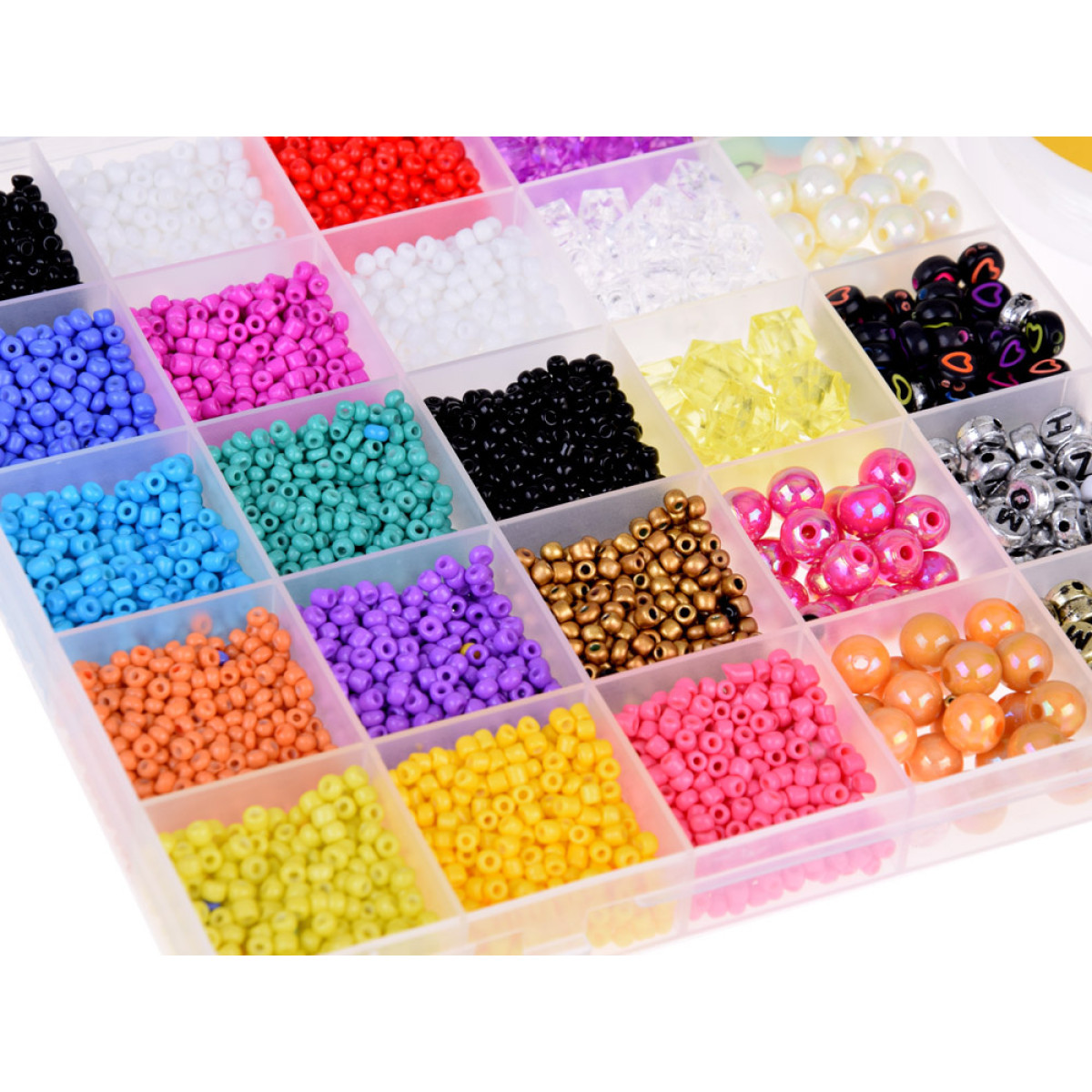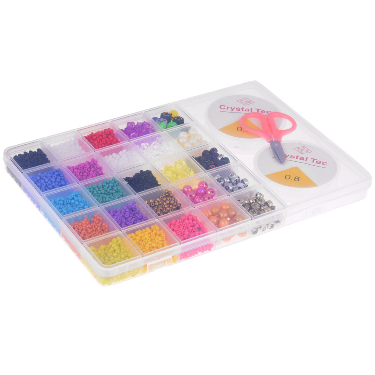 Rinkinys turi 22 skirtingas karoliukų spalvas, įskaitant mėlynos, turkio, violetinės, rožinės, žalios, baltos atspalvius ir karoliukus su raidėmis. Jie pateikiami patogioje permatomoje, lagaminą primenančioje dėžutėje, padalintoje į skyrelius, todėl karoliukai nesimaišo.