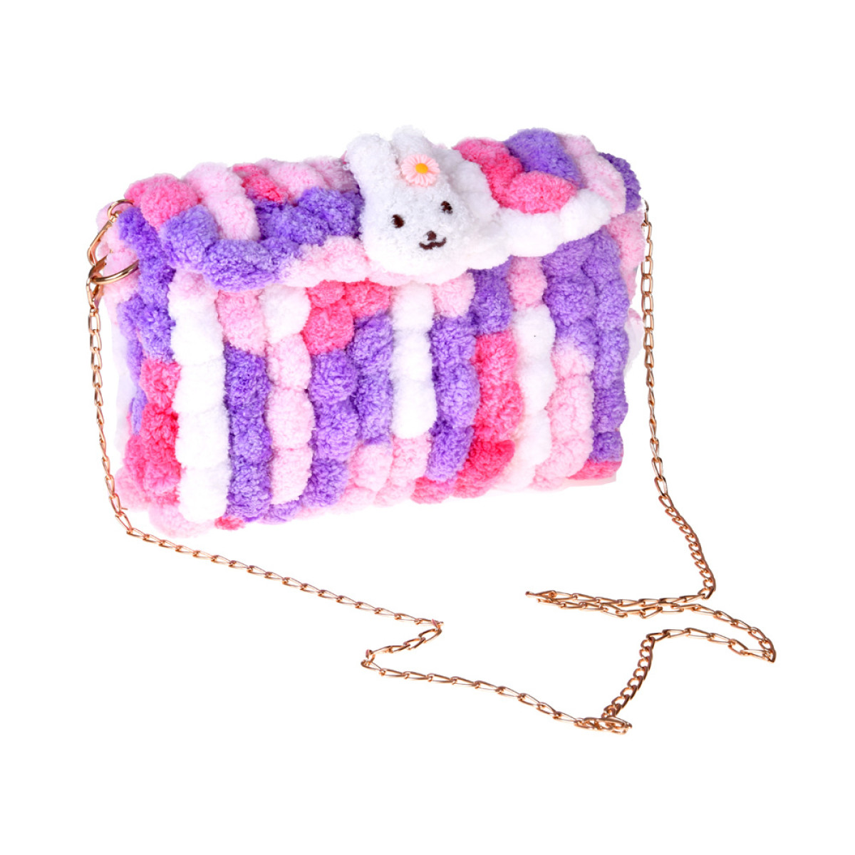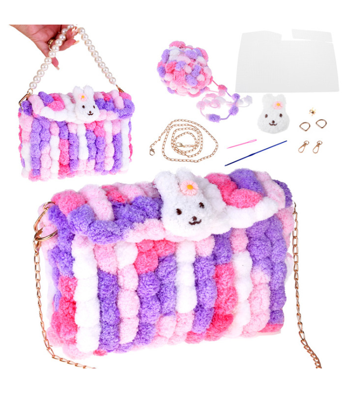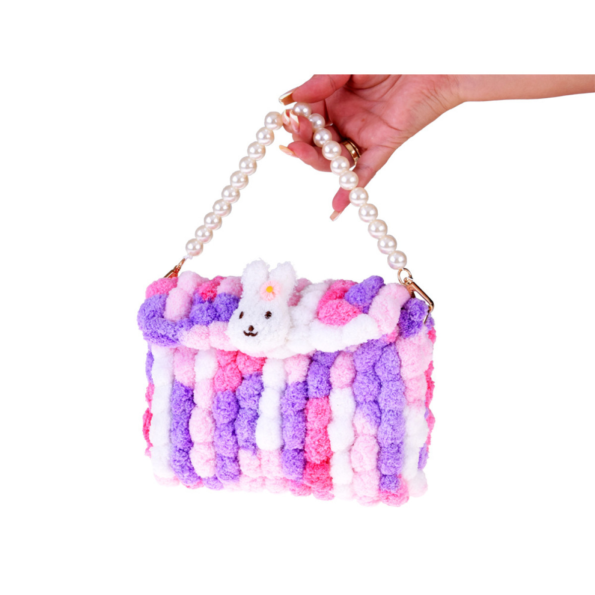 - Sudėtyje yra minkštos, spalvotos siūlės su pomponais, iš kurių gaunama žavi rankinė.