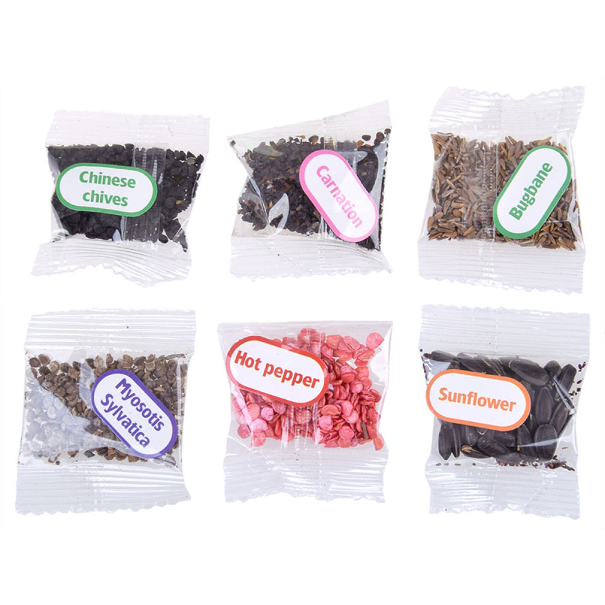 - 6 x sėklų paketai: (miškinis drobėjas, saulėgrąža, žolinis augalas, laiškinis česnakas, gvazdikas, paprika)