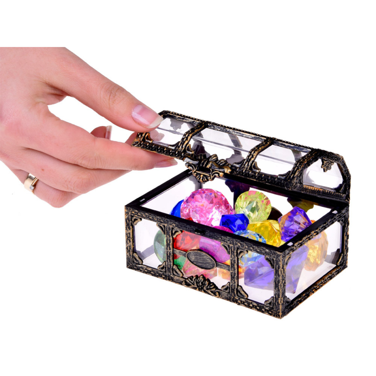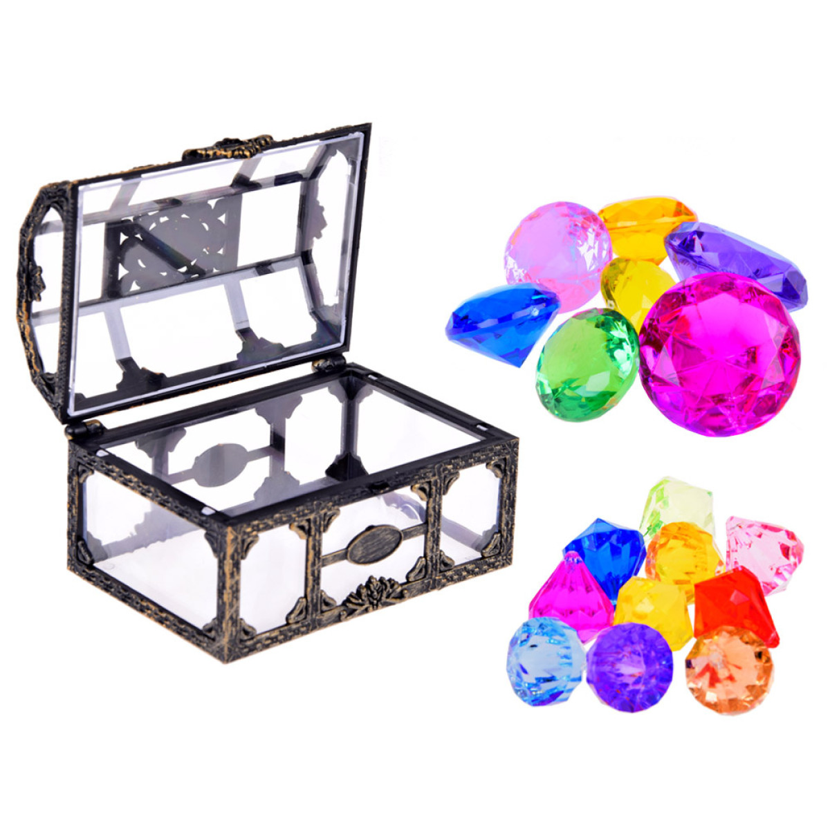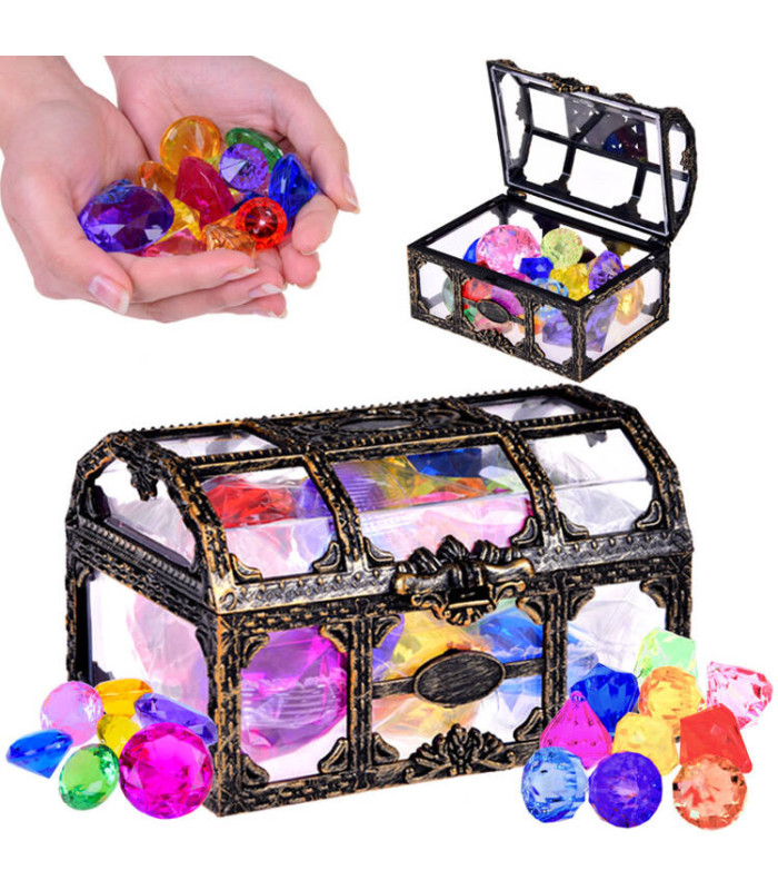 Visas žaislas pagamintas iš plastiko (įskaitant ir brangakmenius), todėl jį galima naudoti vandenyje – jis niekada nerūdys! Mūsų pasiūlymas – mesti kristalus į vonios ar baseino dugną ir nardyti po juos. Kita nuotykių galimybė – paslėpti skrynią su brangenybėmis sode ar namuose ir nupiešti žemėlapį, kuris ves į fantastišką lobį.