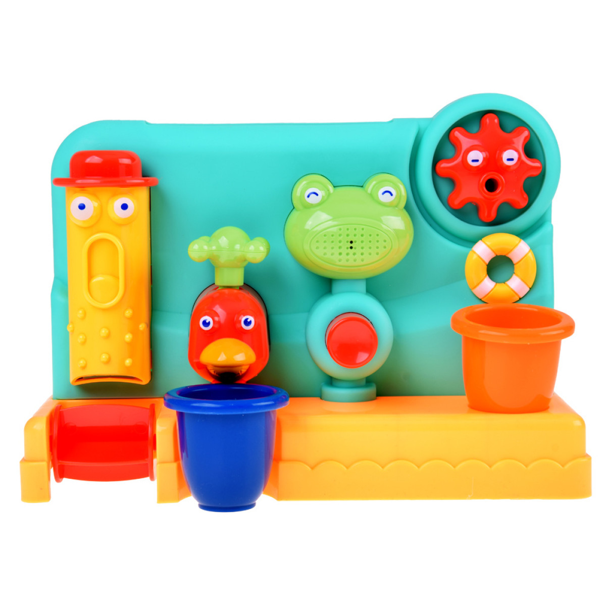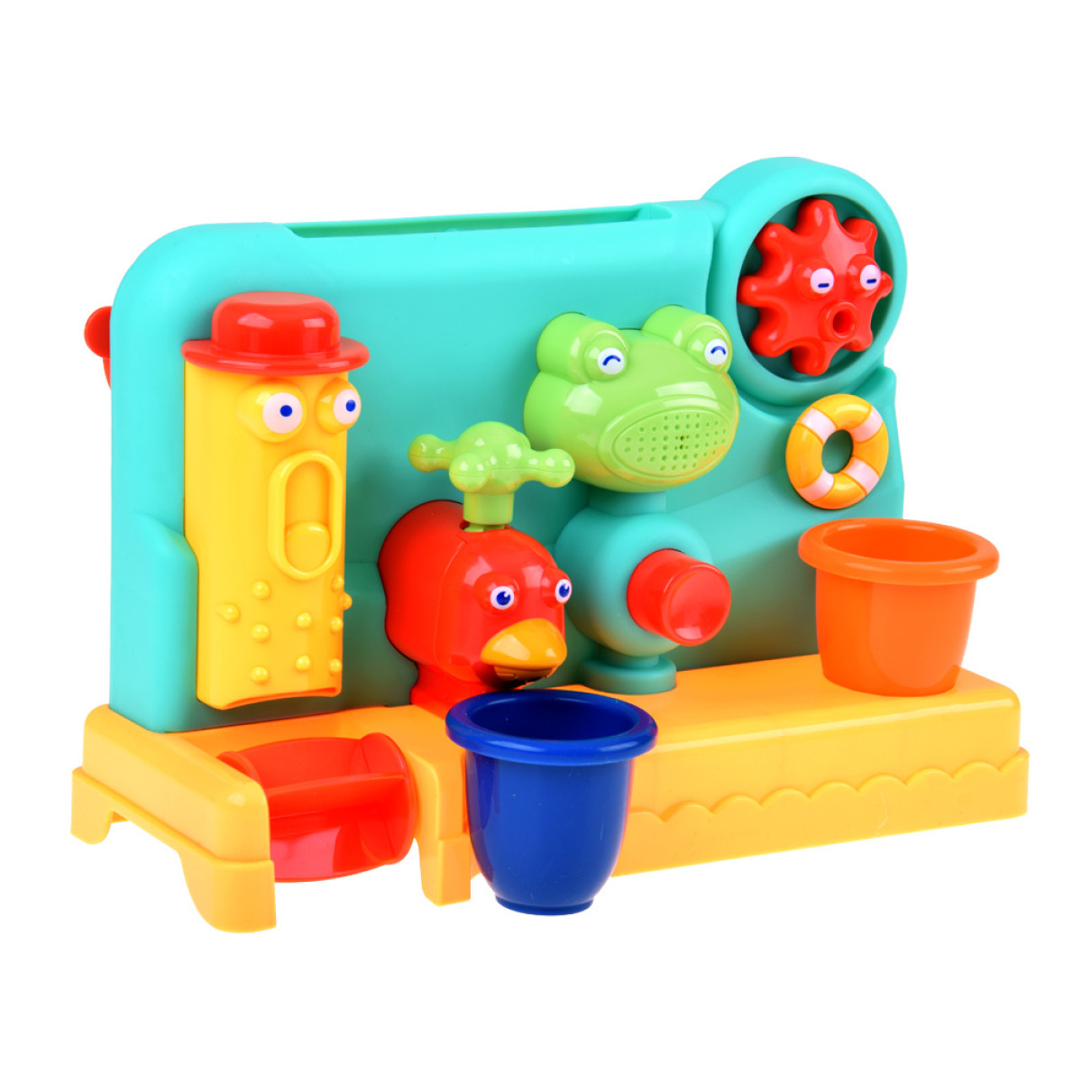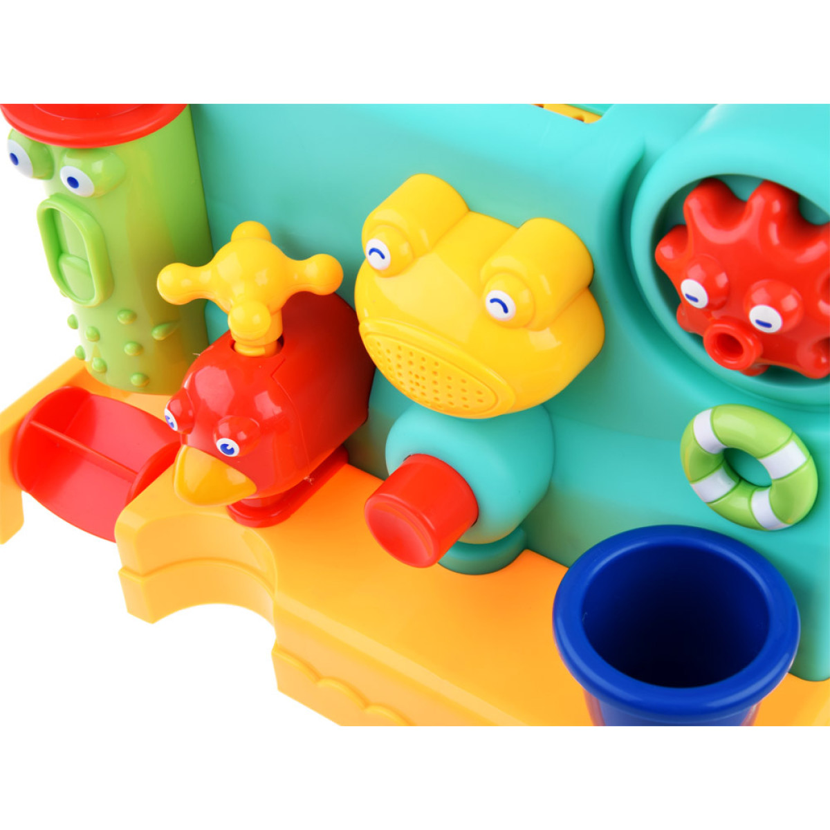 Vanduo pateks į žalią kaktusą su kepure - prasiskverbdamas jis suks malūnėlį, esantį po juo. Norėdami išlaisvinti vandenį iš raudono paukštuko, atsukite kranelį - kaip tikroje kriauklėje! Raudonas mygtukas veikia kaip pompa - paspaudus jį, iš mielos varlytės burnos ištrykš vanduo. Iš saulutės angos išlies vanduo, sukeldamas fontaną. Po saulute yra vieta puodeliui. Naudodami puodelius, galite pilti vandenį į žaislą arba stebėti, kaip jis teka per dugno skyles.