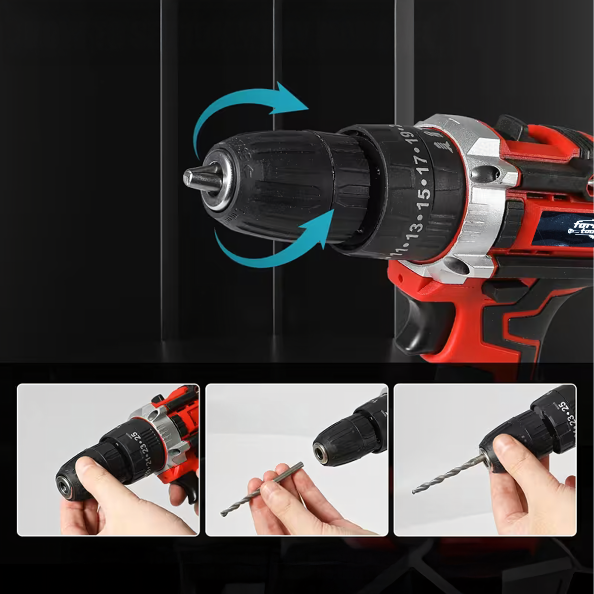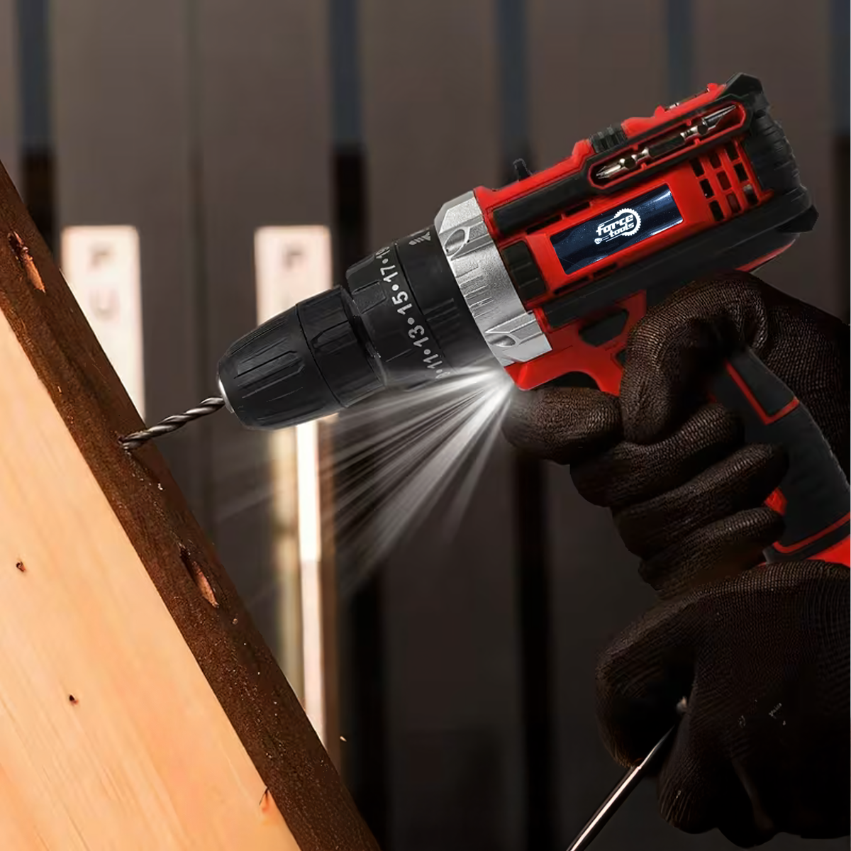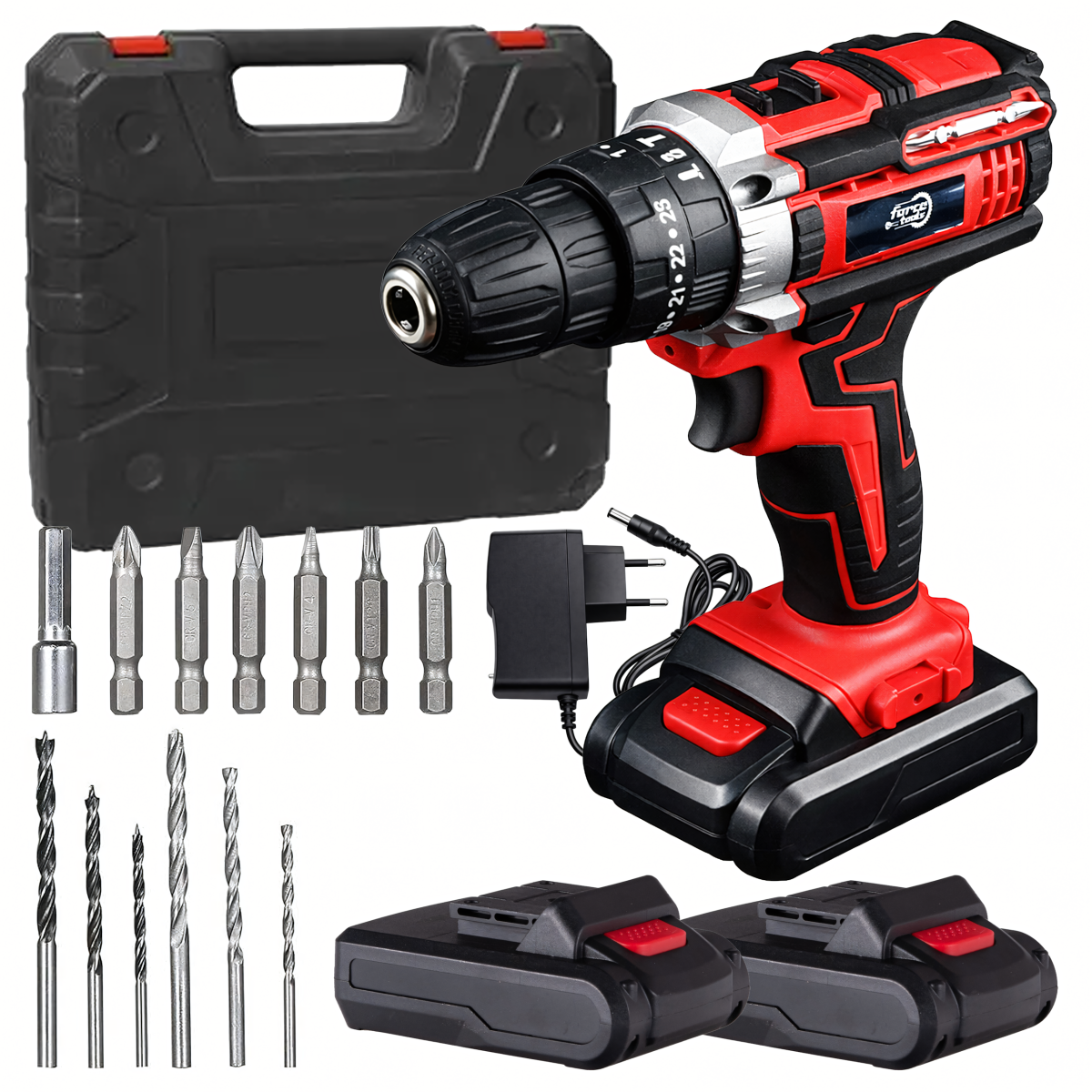 Akumuliatorinis gręžtuvas-suktuvas su dviem baterijomis, 18V LED ir priedais
