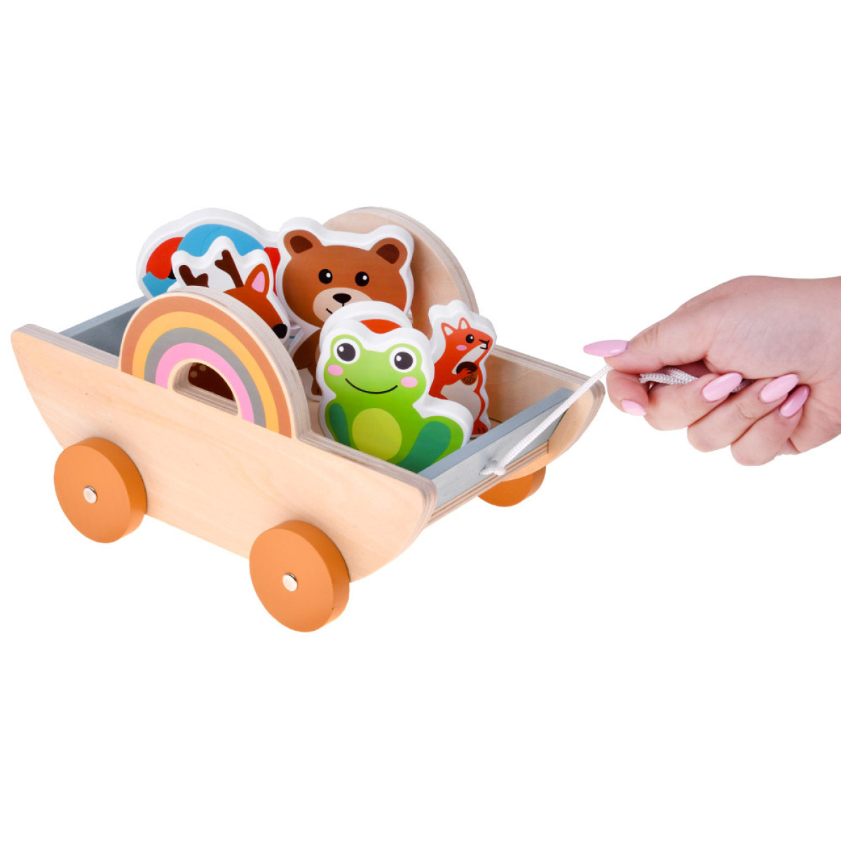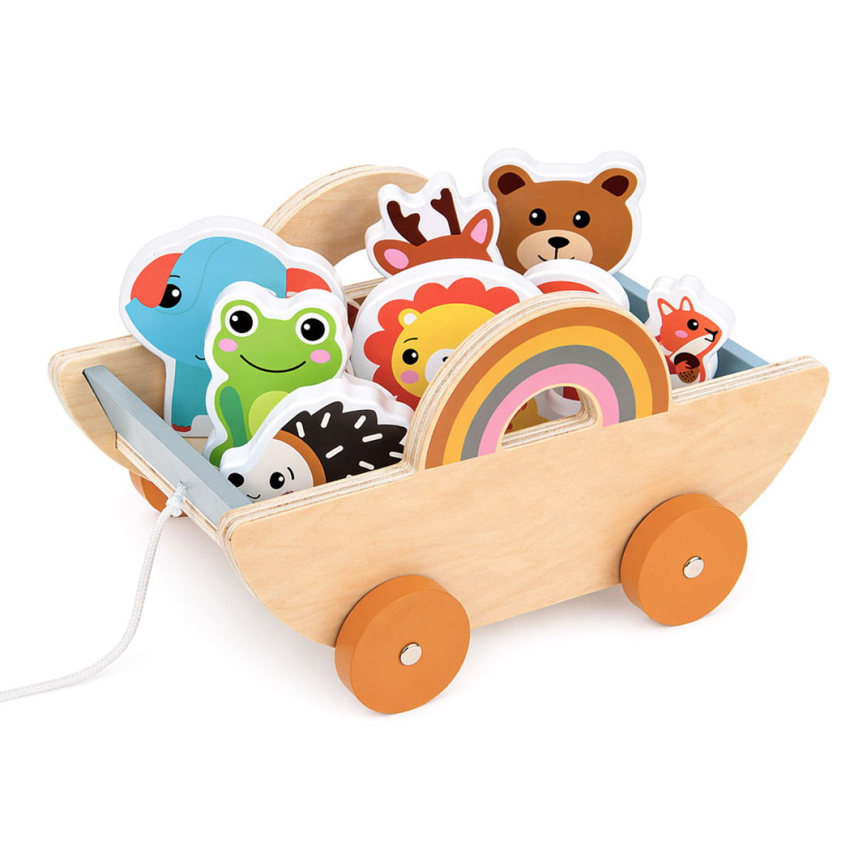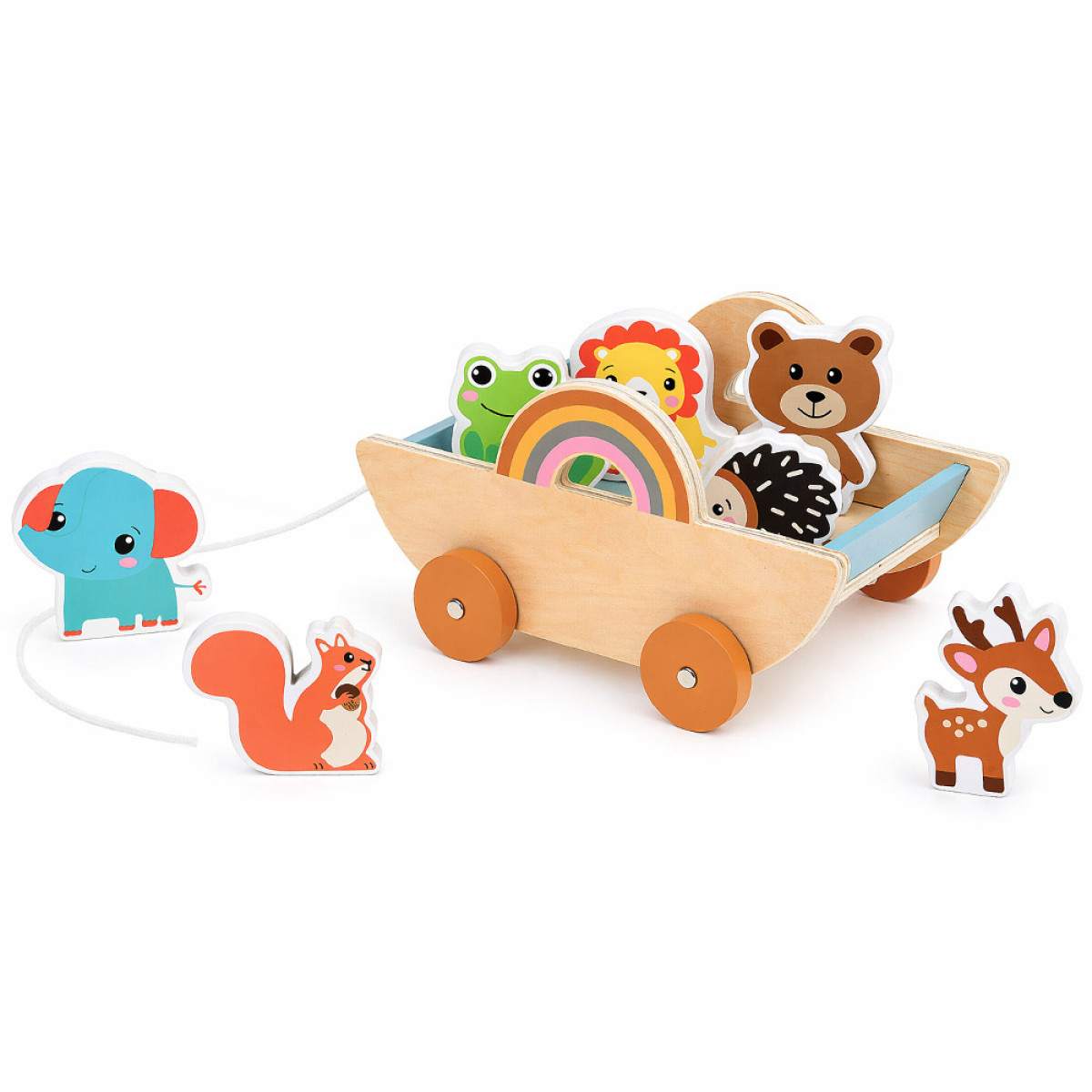 medinis vežimėlis su gyvūnais – smagus ir lavinantis žaislas vaikui. Šis žaislas sujungia kelias mėgstamas veiklas: vežimėlio traukimą, gyvūnų vežiojimą ir atskirą žaidimą figūrėlėmis. Vaikas gali kurti savo istorijas, nuotykius ir žaidimo scenarijus, todėl žaislas ilgai išlieka įdomus.